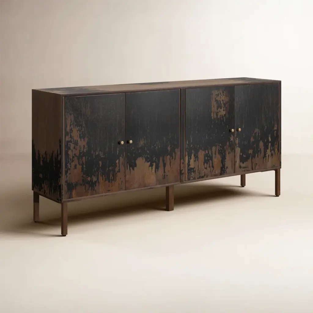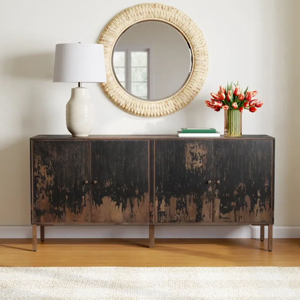 This rustic sideboard is a farmhouse favorite, blending style and storage for your dining area or entryway. Made from solid mango wood, it has a distressed finish that brings character to any room. It has four doors with magnetic catches, offering plenty of space for dishes, linens, or other items. The finished back and straightforward legs add support and keep the country look. To clean it, just give it a quick wipe with a dry cloth.