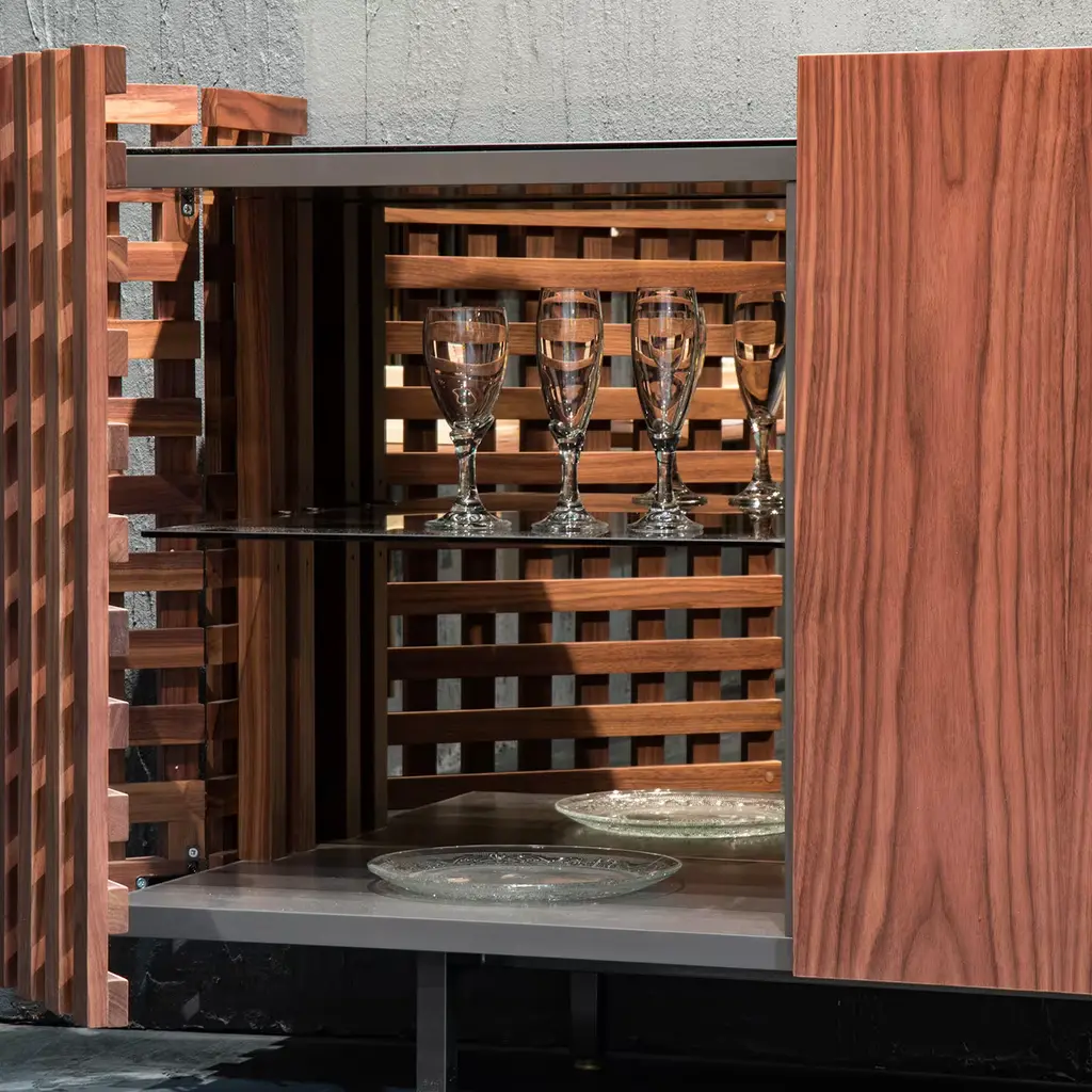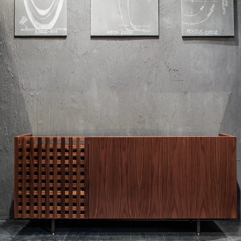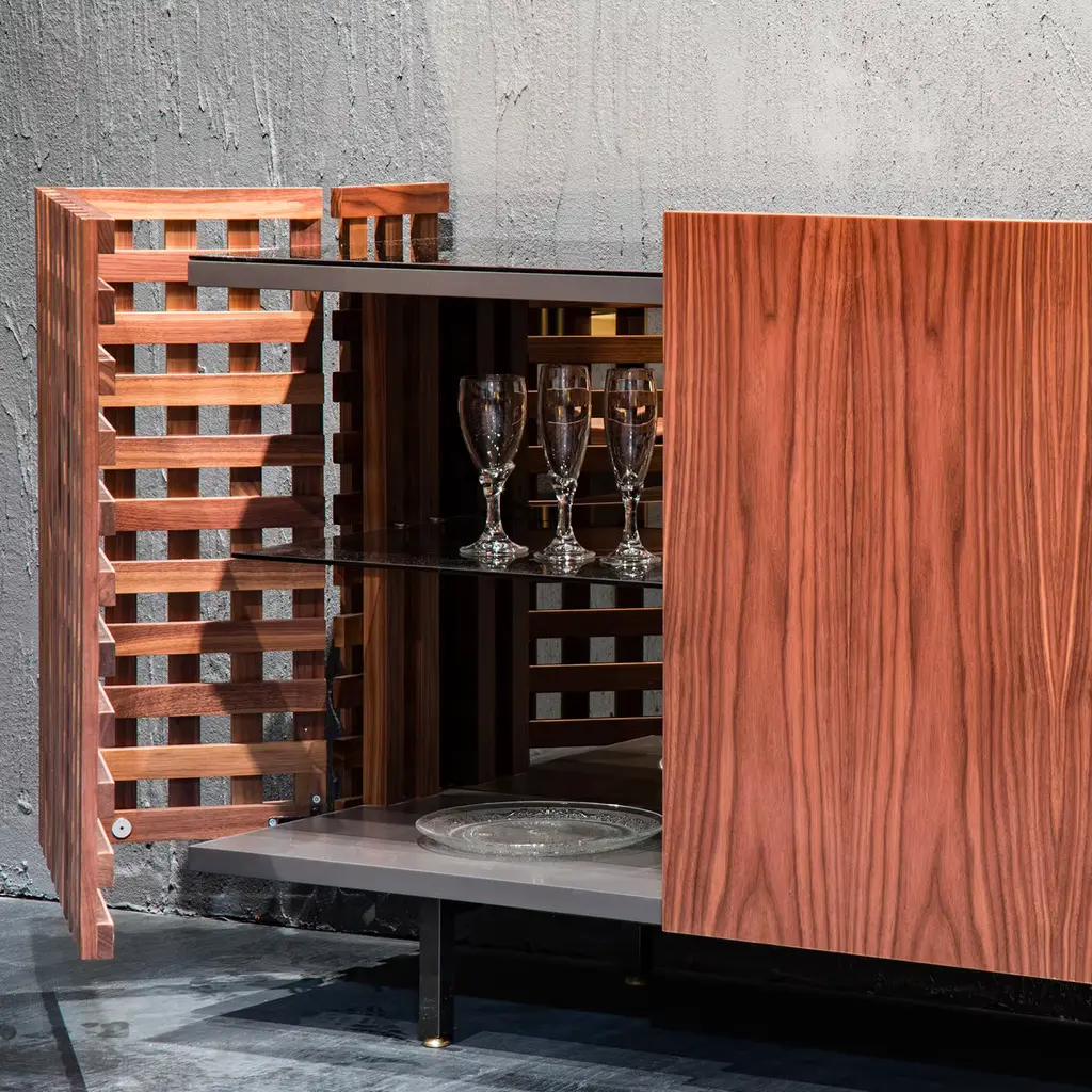 Exuding contemporary charm, this matte-lacquered wooden sideboard boasts Canaletto walnut-veneered doors and an internal clear glass shelf. One of the doors, in solid wood, displays an open design of perpendicular lines that gives a glimpse of its refined interior, which is customizable by adding a back mirror, a bottle holder or a drawer. Raised on dainty metal legs, this exquisite sideboard is available in multiple finishes and can be enriched with a mirror top.