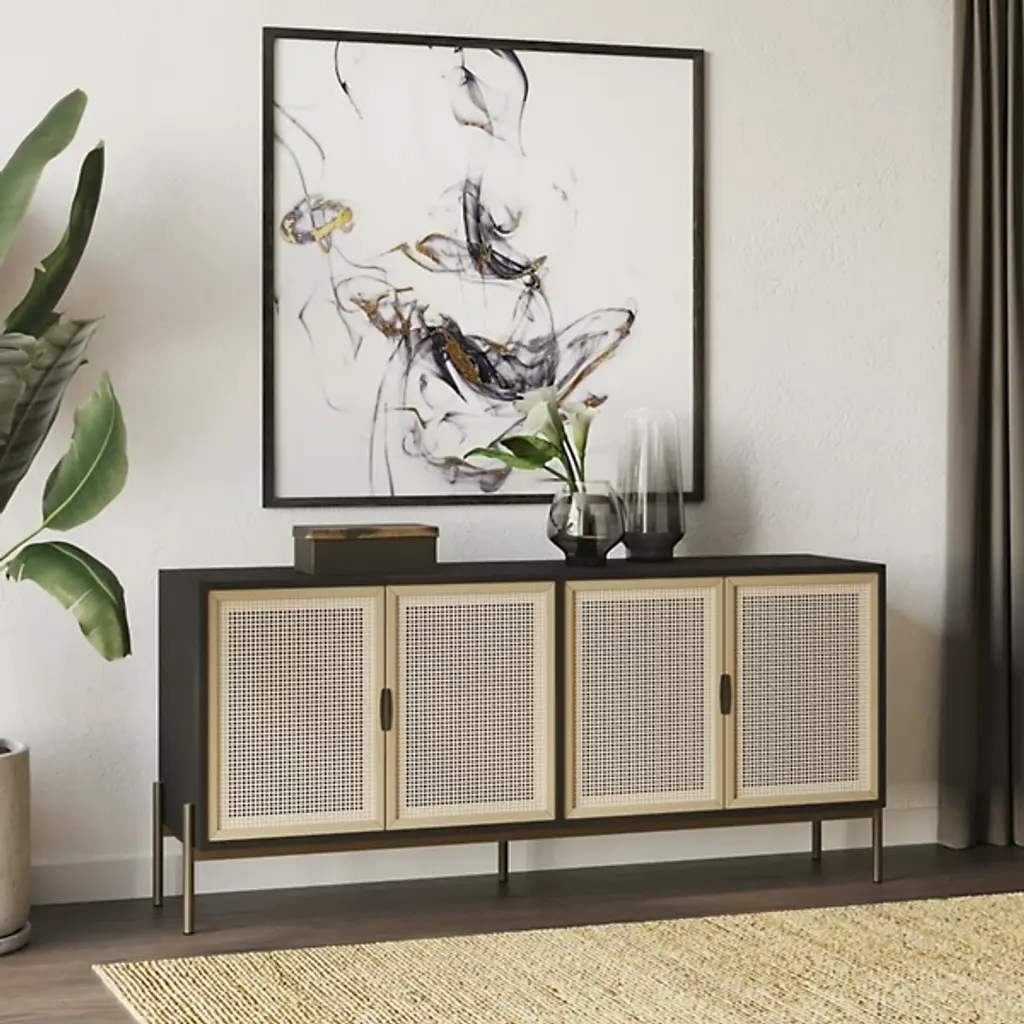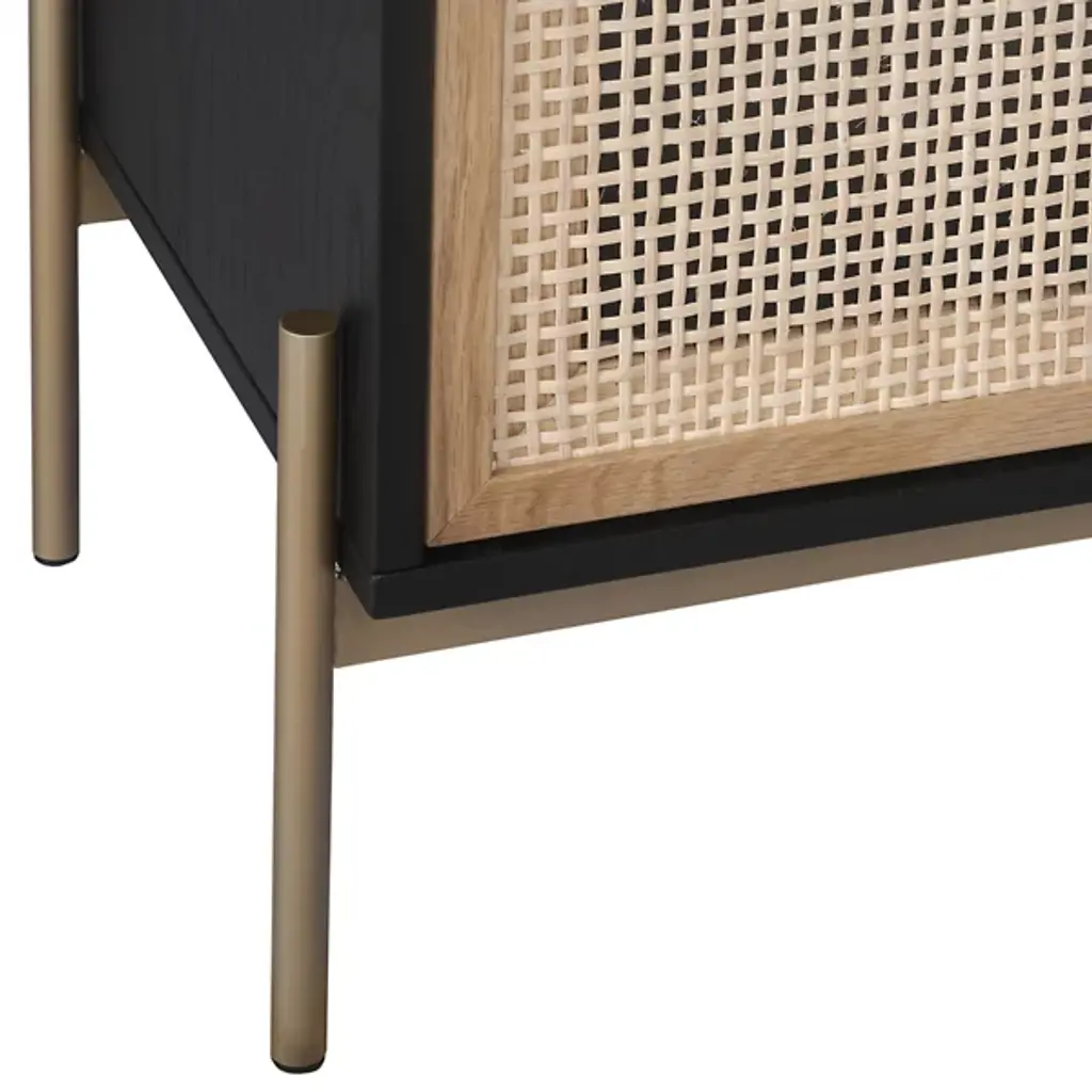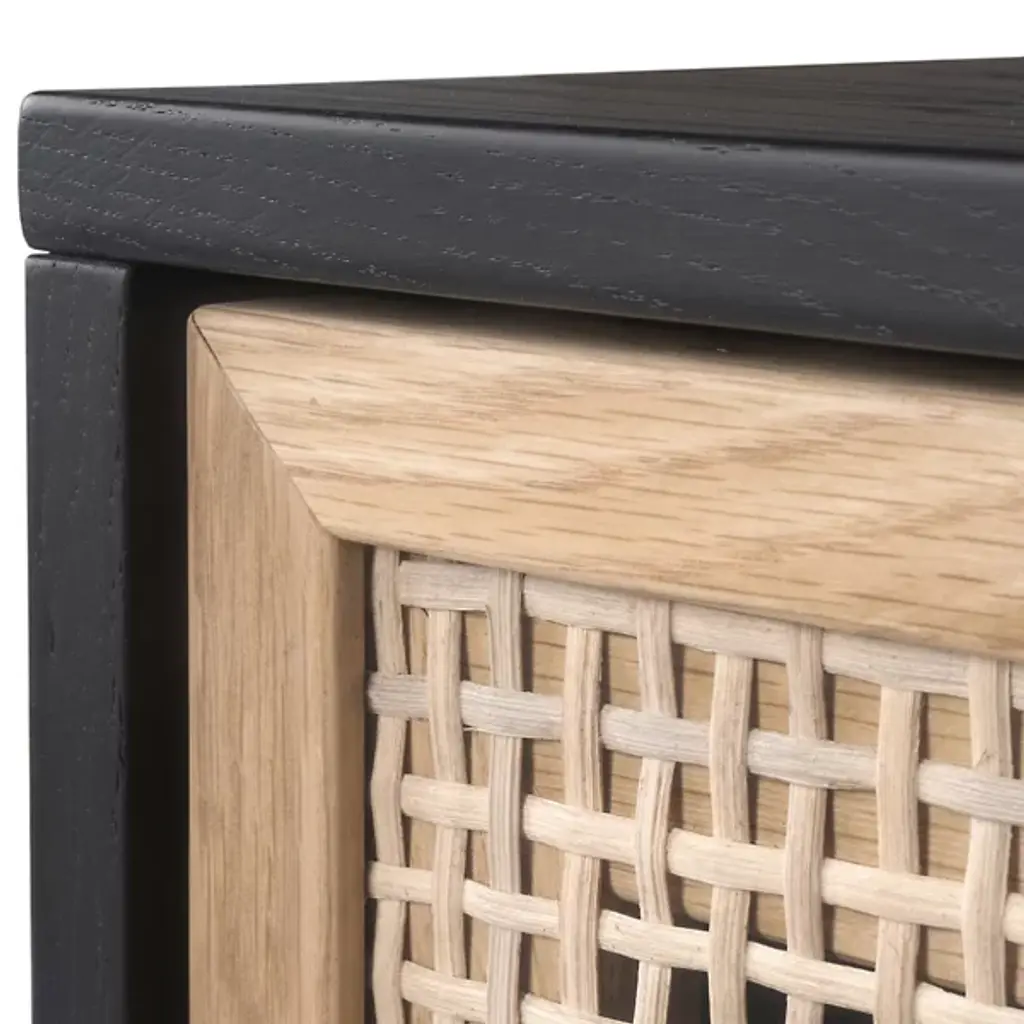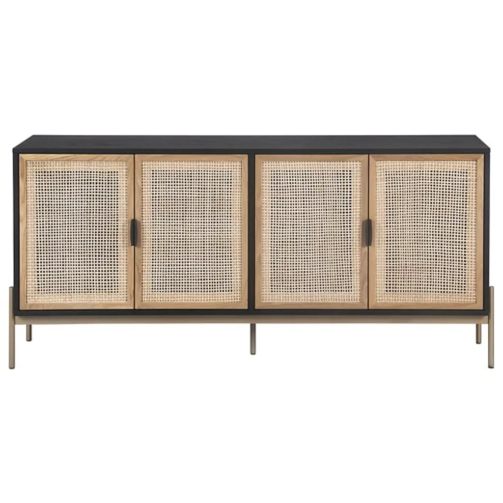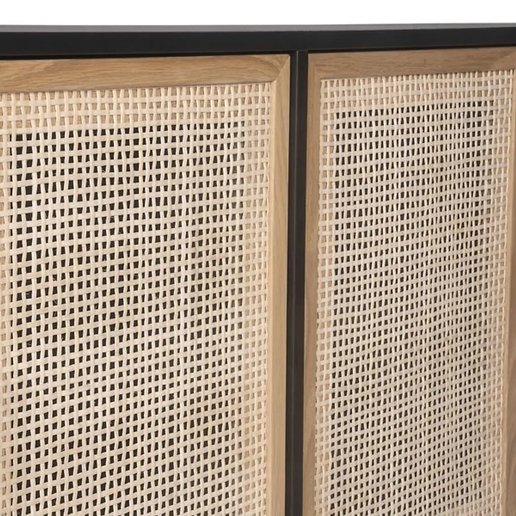 The Avida Large Sideboard from Sunpan features four spacious cabinets made from natural rattan, offering a warm, organic contrast to its sleek oak wood frame. Iron feet and matte steel handles add a refined touch, enhancing its sophisticated appeal. Each sideboard is artisan-crafted in Indonesia, embracing the natural variations in color and texture that make every piece unique. The intricate rattan weaving may display subtle differences, with fibers varying in length, adding to its authentic charm.