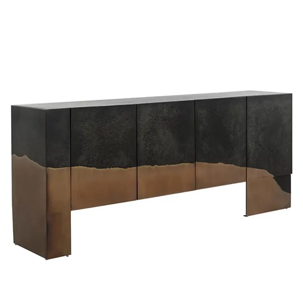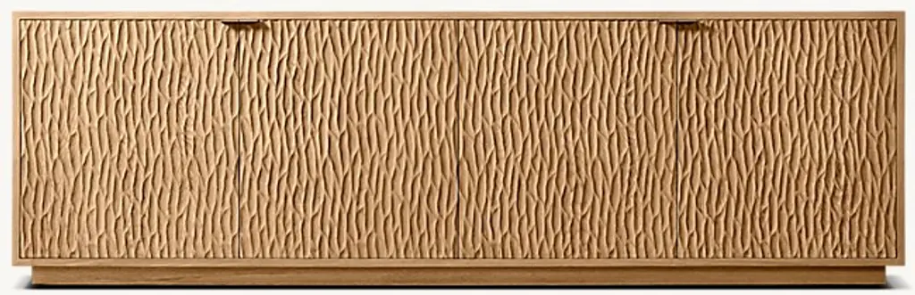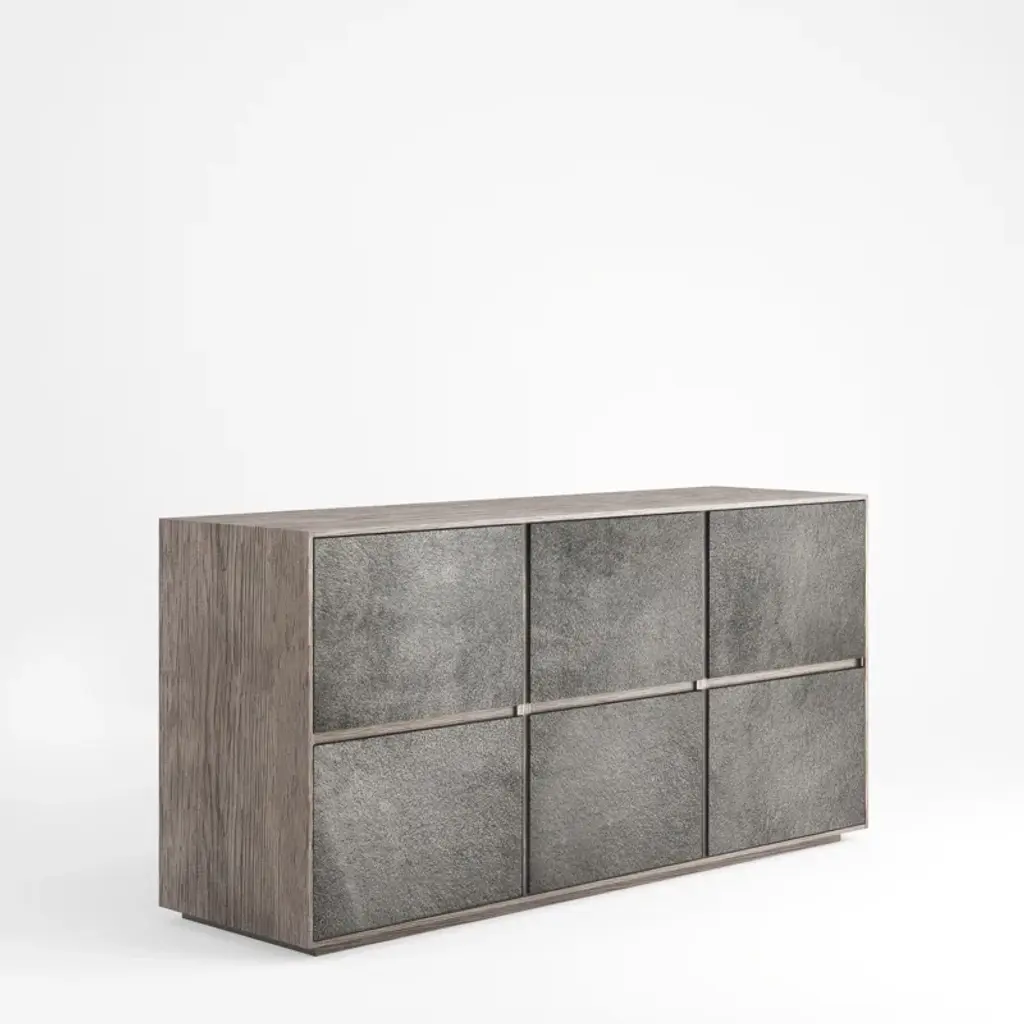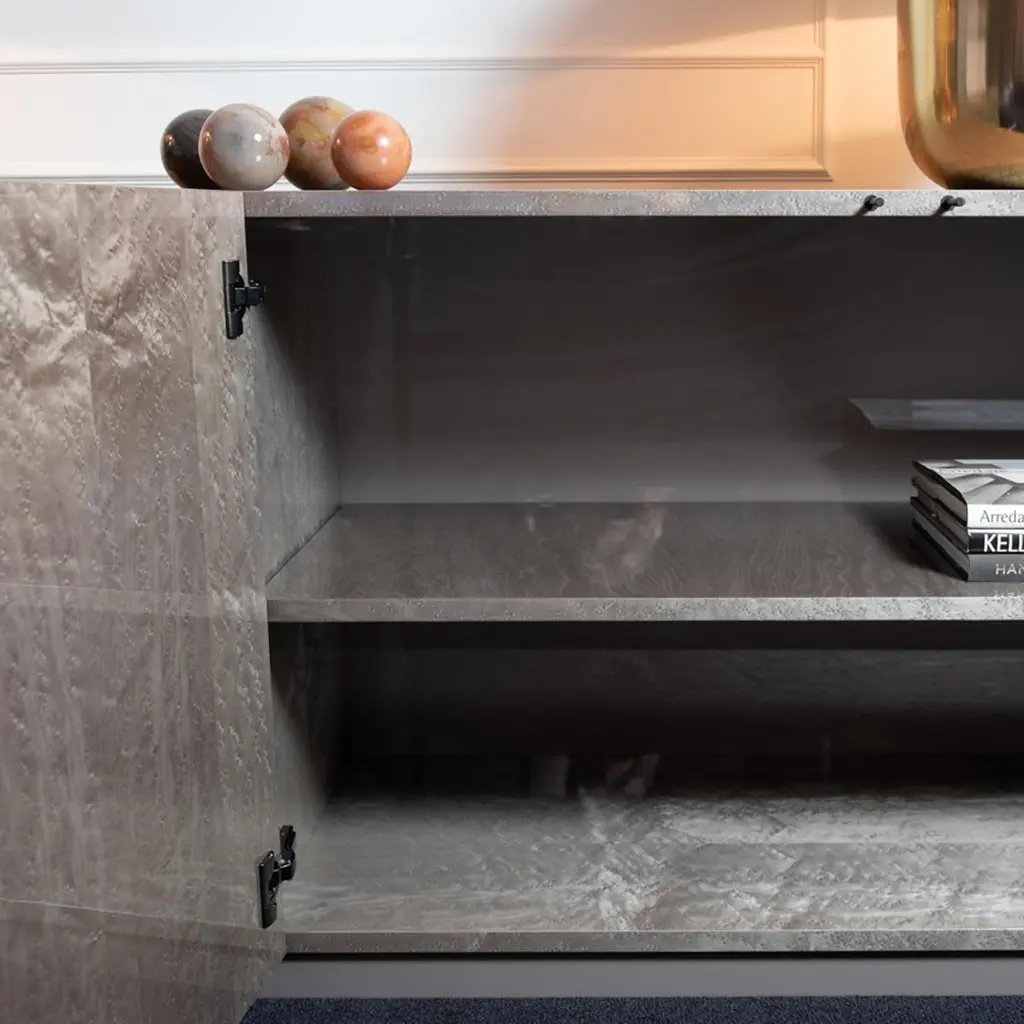 Masterfully crafted, this distinctive sideboard provides functional storage for serveware or odds and ends in a modern living or dining room. The imposing Silhouette is crafted of maple wood with an exclusive glossy, gray bird's-eye finish that creates a distinctive pattern recalling small, swirling eyes emerging from the smooth lines of grain. Raised on a minimal plinth base, the four doors feature two internal spaces, each with a shelf of erable wood with a stunning deep-grained luster also in glossy gray finish.