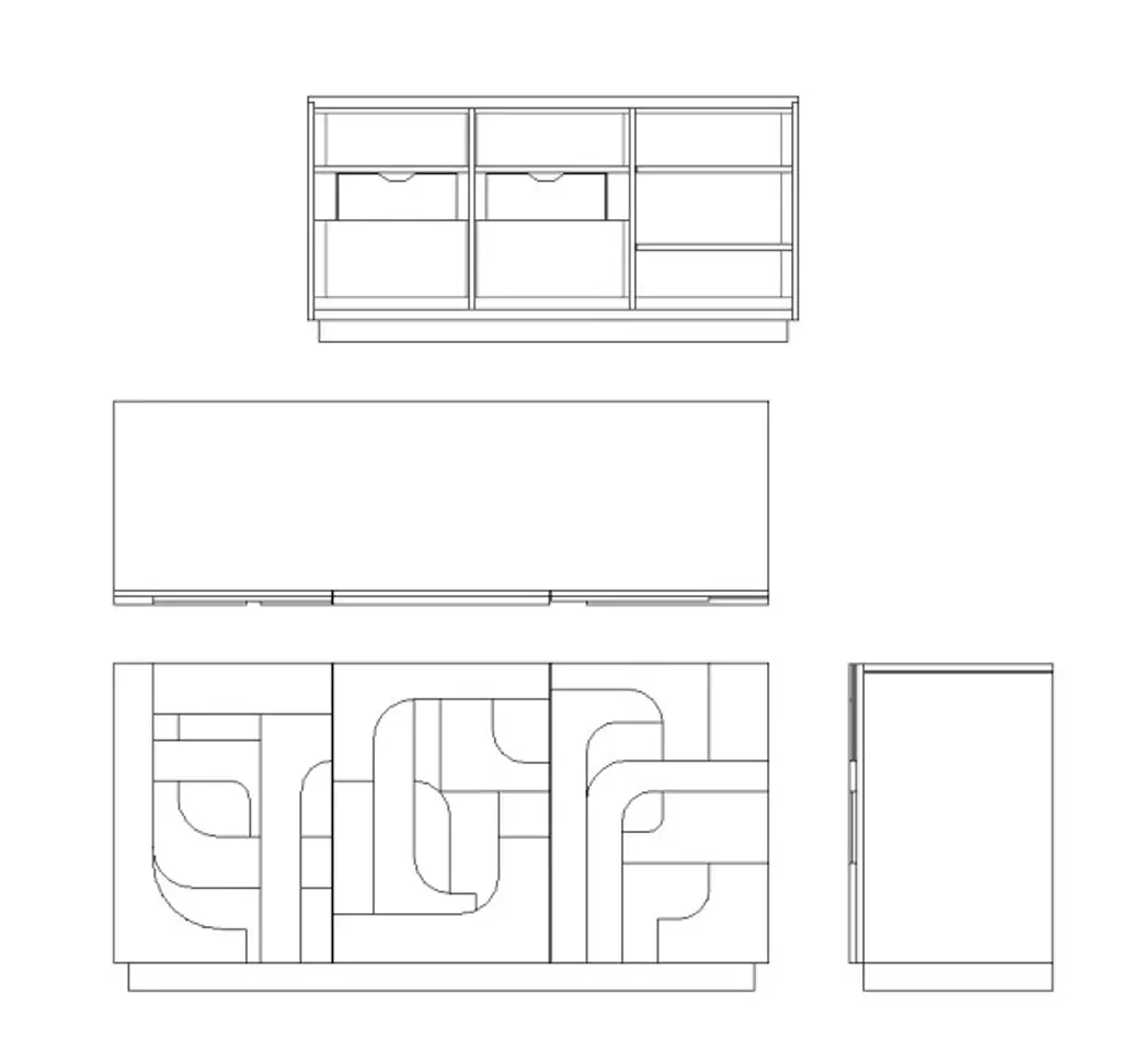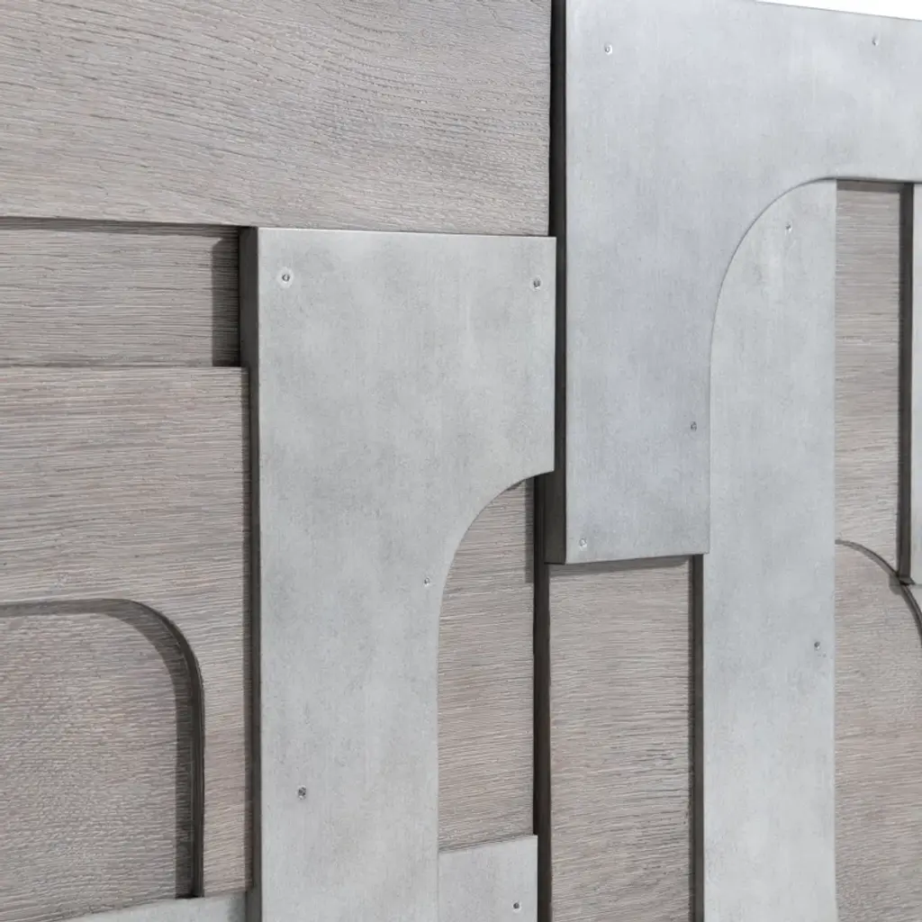 The Azlin buffet forges a new path to modern design with a gorgeous mix of materials. A multilevel pattern of geometric overlays in aluminum and wood showcases an industrial style on the fronts of three push-to-open doors. Behind the doors are fixed and adjustable shelves, as well as two drawers.