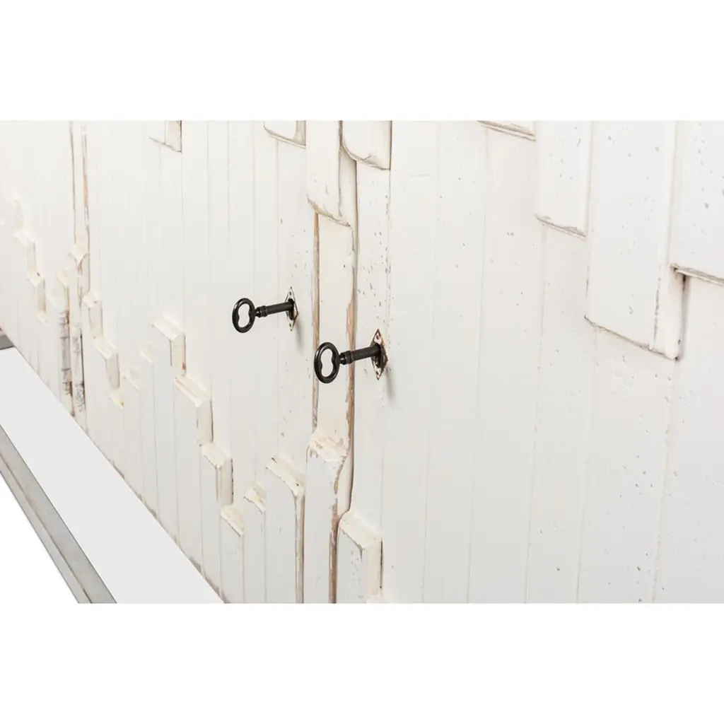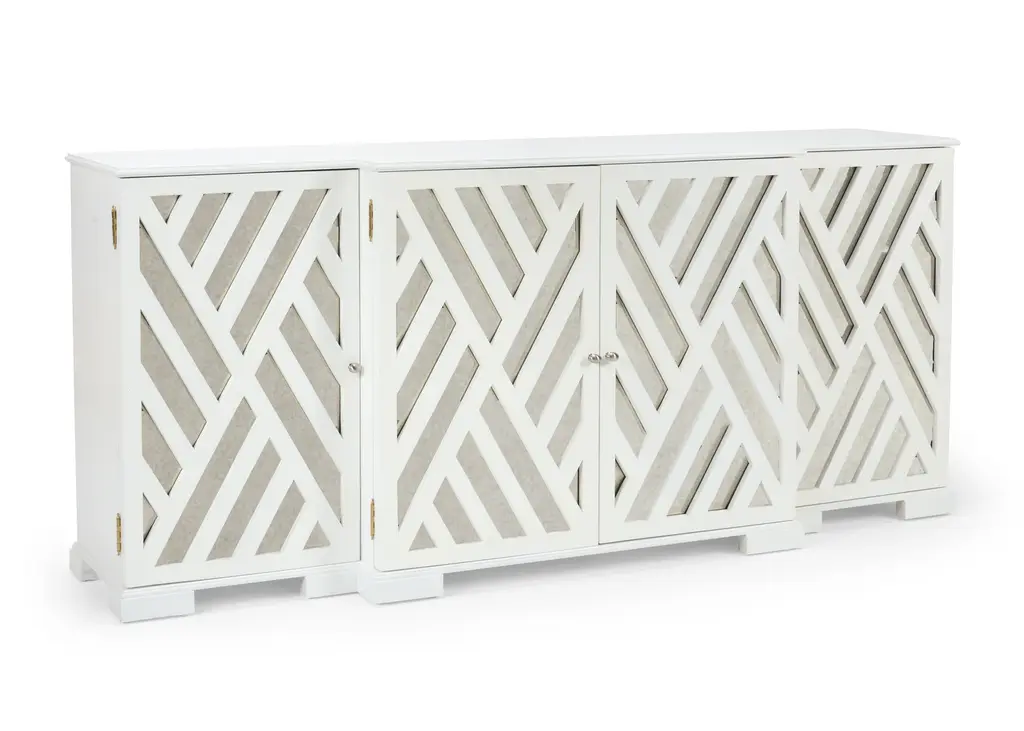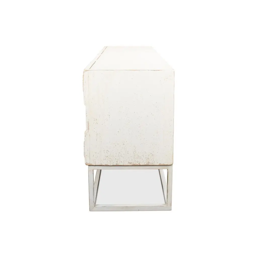 Made with reclaimed pine in an antiqued and distressed whitewash finish. With applied molding inspired by Aztec design. The painted interior with removable shelves and raised on a modern open cube form base.Dimensions: 80" W x 21" D x 35" H