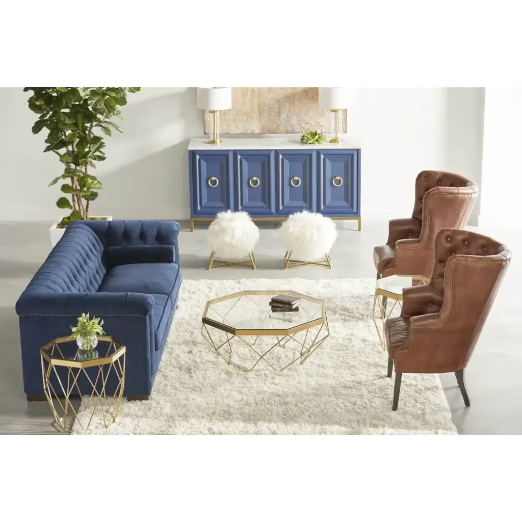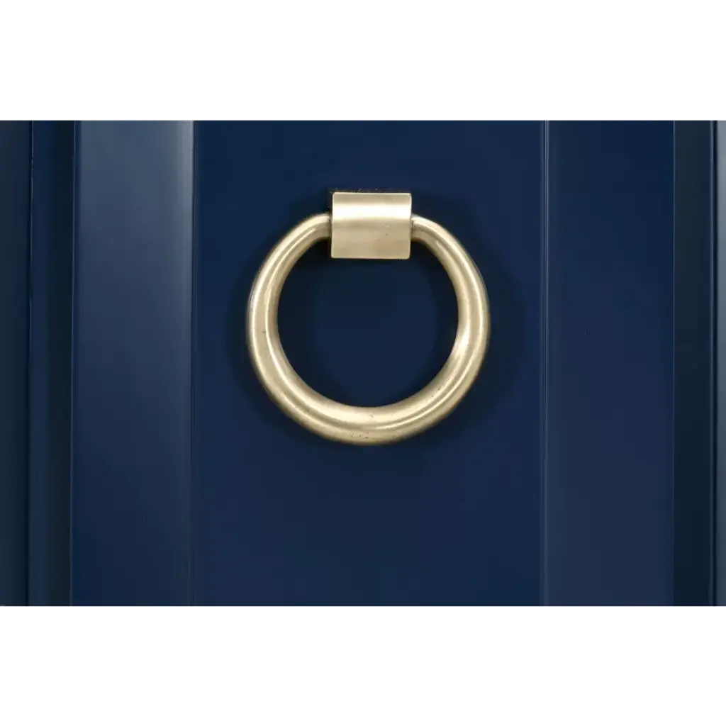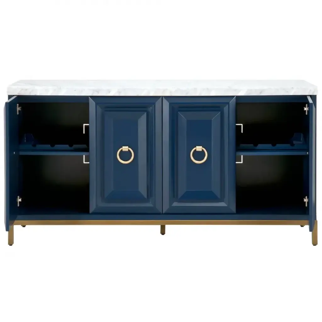 This stunning marble-topped media sideboard is the perfect combination of elegance and functionality. It is constructed with gray and white Italian marble and navy blue colored wood with brushed gold hardware. Behind the four cabinet doors are two 11-position adjustable shelves for accessing your items with ease, as well as two removable wine racks that can fit up to seven bottles each. This sideboard will make a lovely addition to any transitional dining room setting.