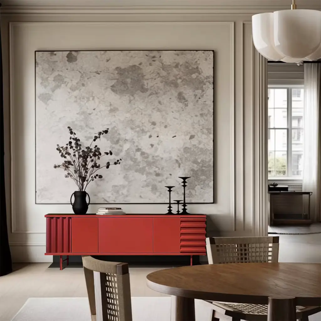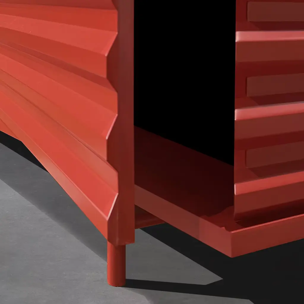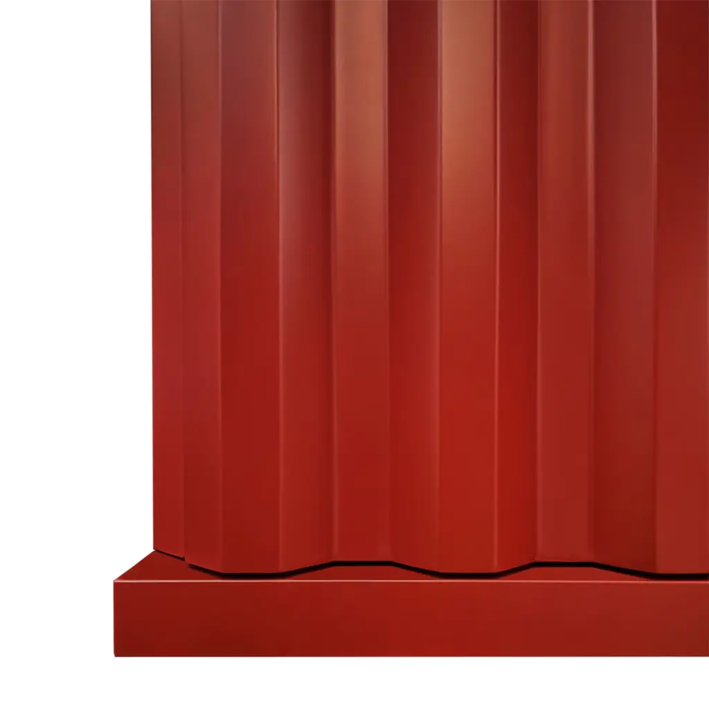 The B-SIDE sideboard in vibrant fire red makes a bold statement in any living space. Its striking simplicity, inspired by shipping container designs, is realized in grooved sheet metal. Crafted with a lacquered MDF base and trapezoidal door inserts, it creates a play of light and shadow. Measuring 191cm in length, it combines artistry and functionality. Available in 12 curated colors, this piece reflects sustainable craftsmanship and a modern aesthetic.