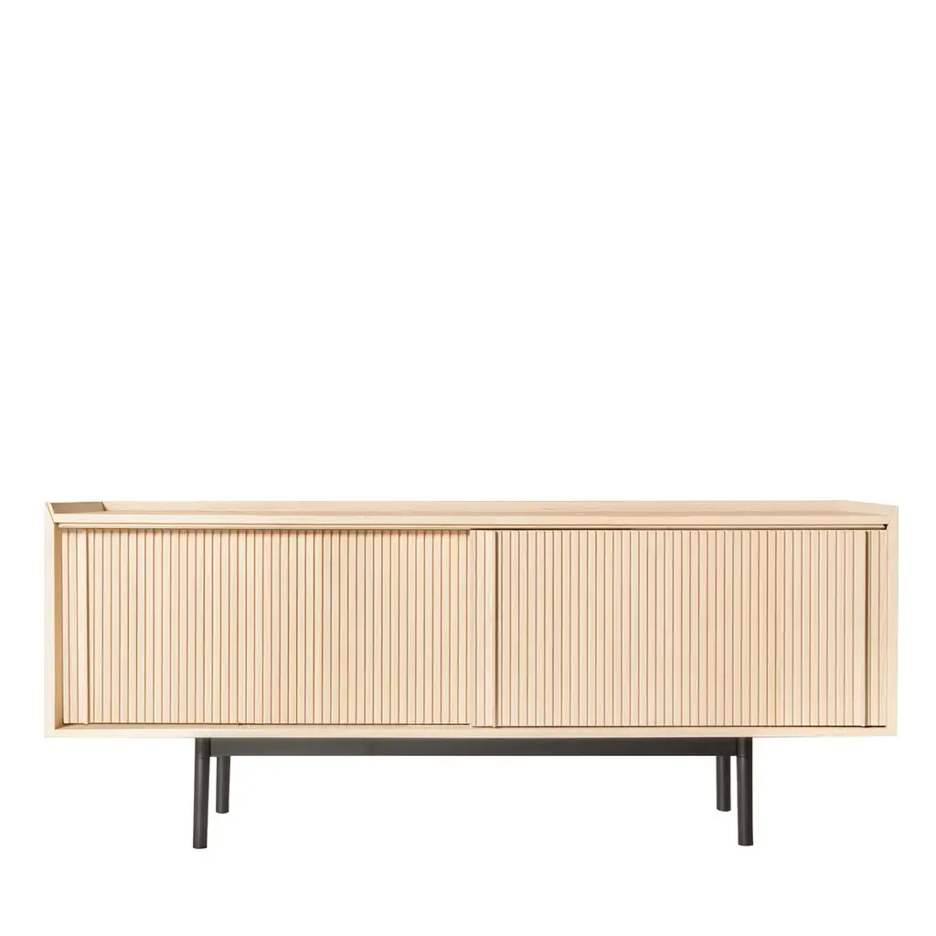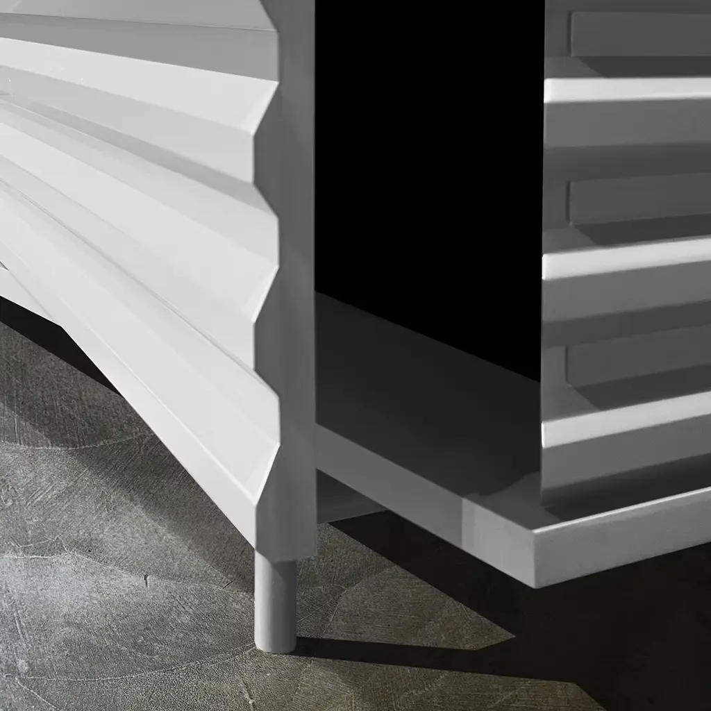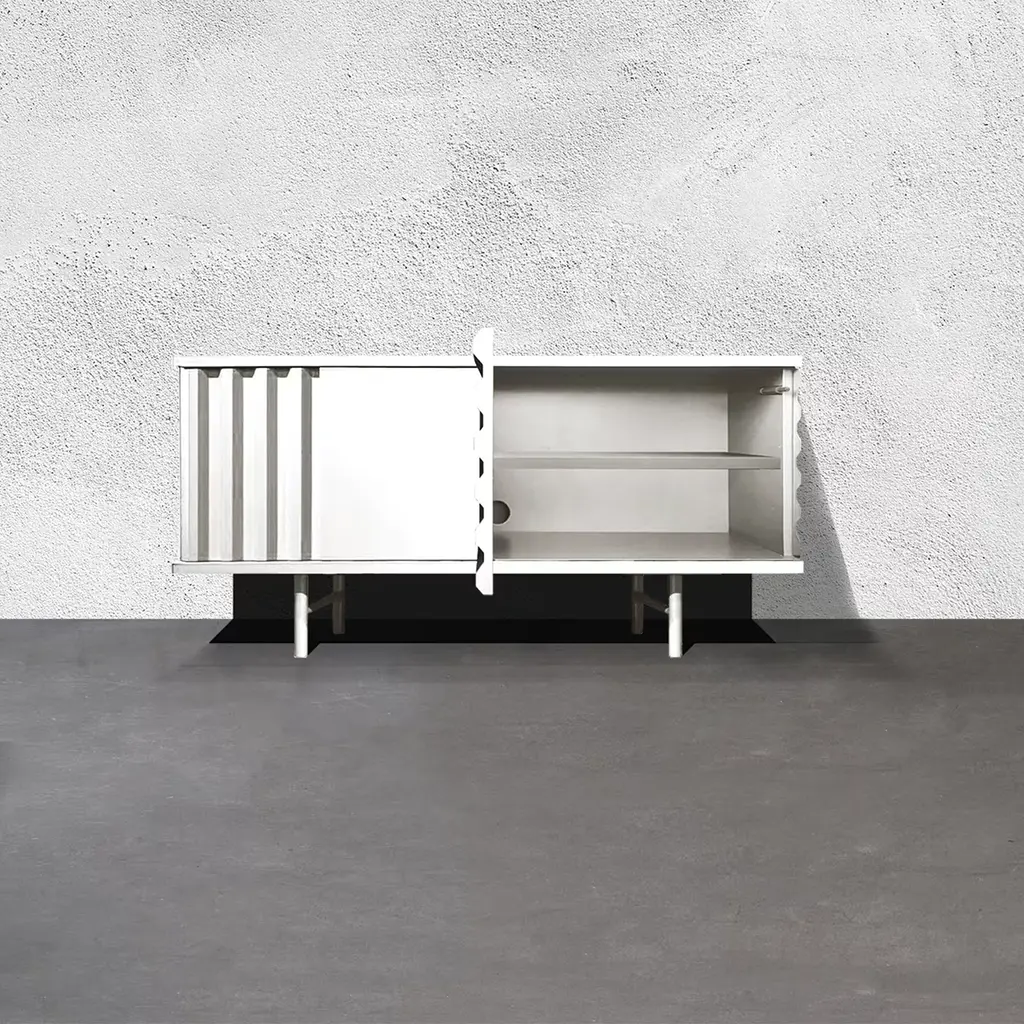 The B-SIDE sideboard, defined by its clean lines and geometric form, draws inspiration from the minimalist design of shipping containers. Its sleek MDF body is finished with industrial-grade lacquer, offering durability and a refined matte look. The unique slatted front panels add a dynamic visual element while maintaining a harmonious balance between functionality and aesthetics. With customizable sizes and internal configurations, this piece is designed to elevate your living space.