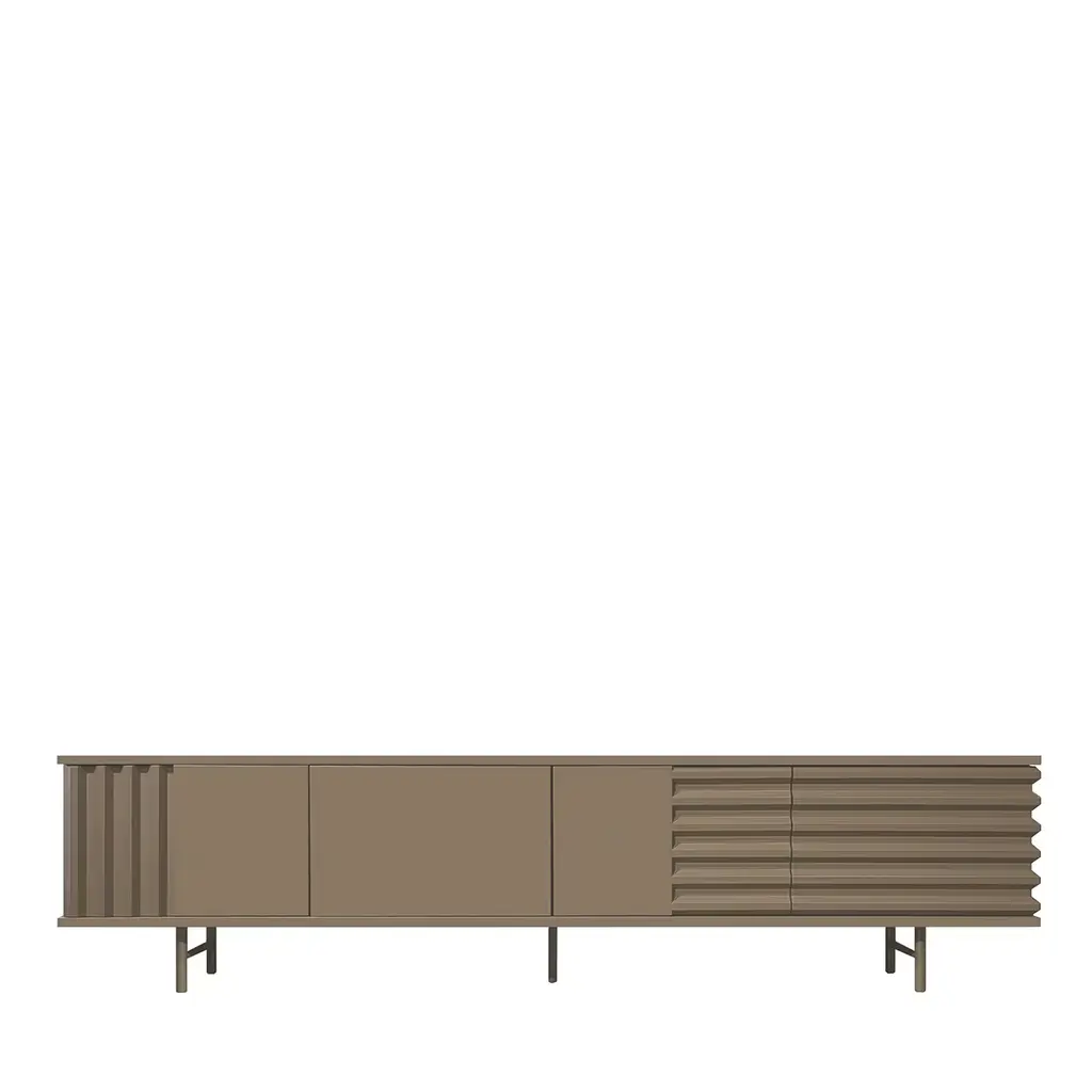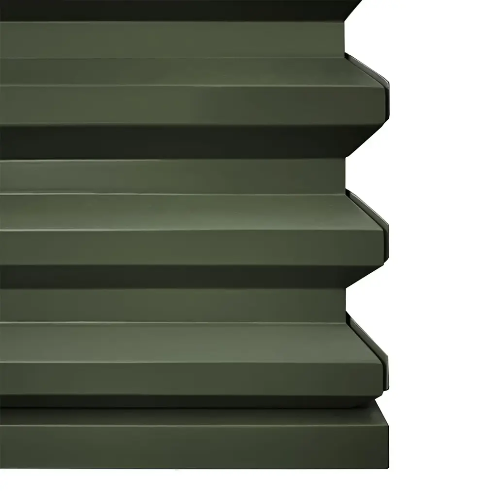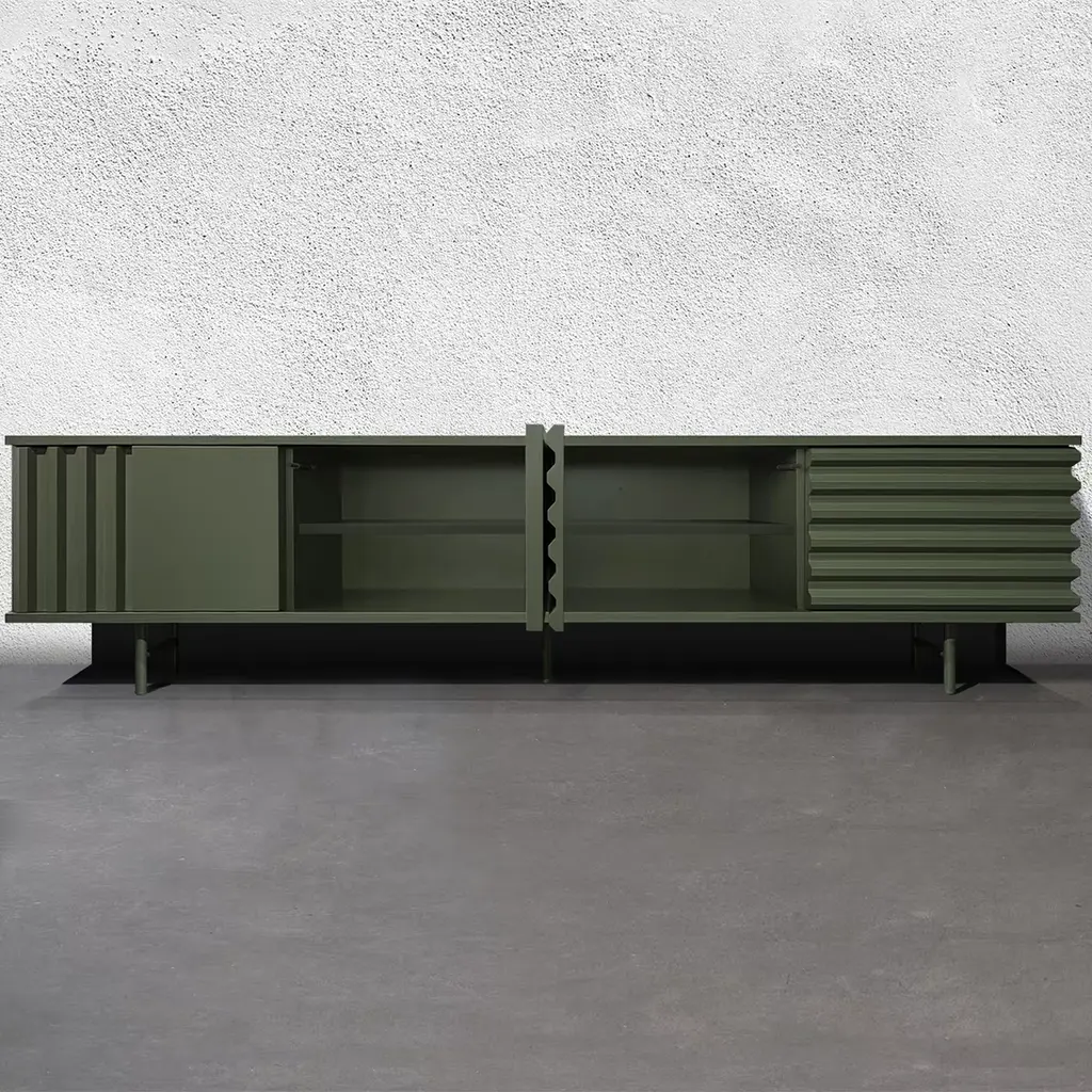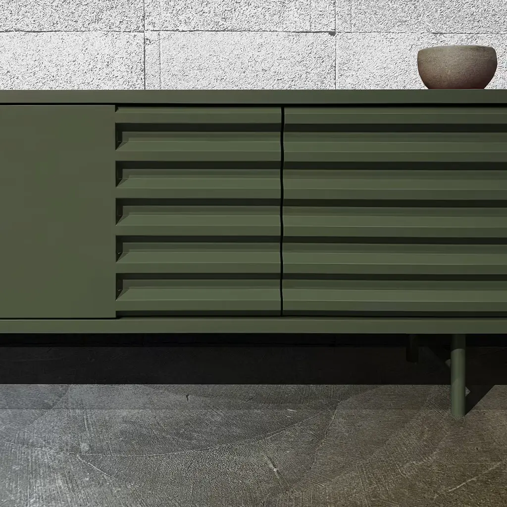 With its modern, streamlined structure, B-Side offers a striking reinterpretation of classic design. Crafted from eco-friendly MDF, this sideboard boasts a bold rosemary green finish, complemented by distinctive vertical slatted detailing that creates depth and texture. The four front-facing doors open with a smooth push-pull mechanism, showcasing an industrial design approach. Available in various configurations and colors, this piece is customizable to meet specific interior needs.