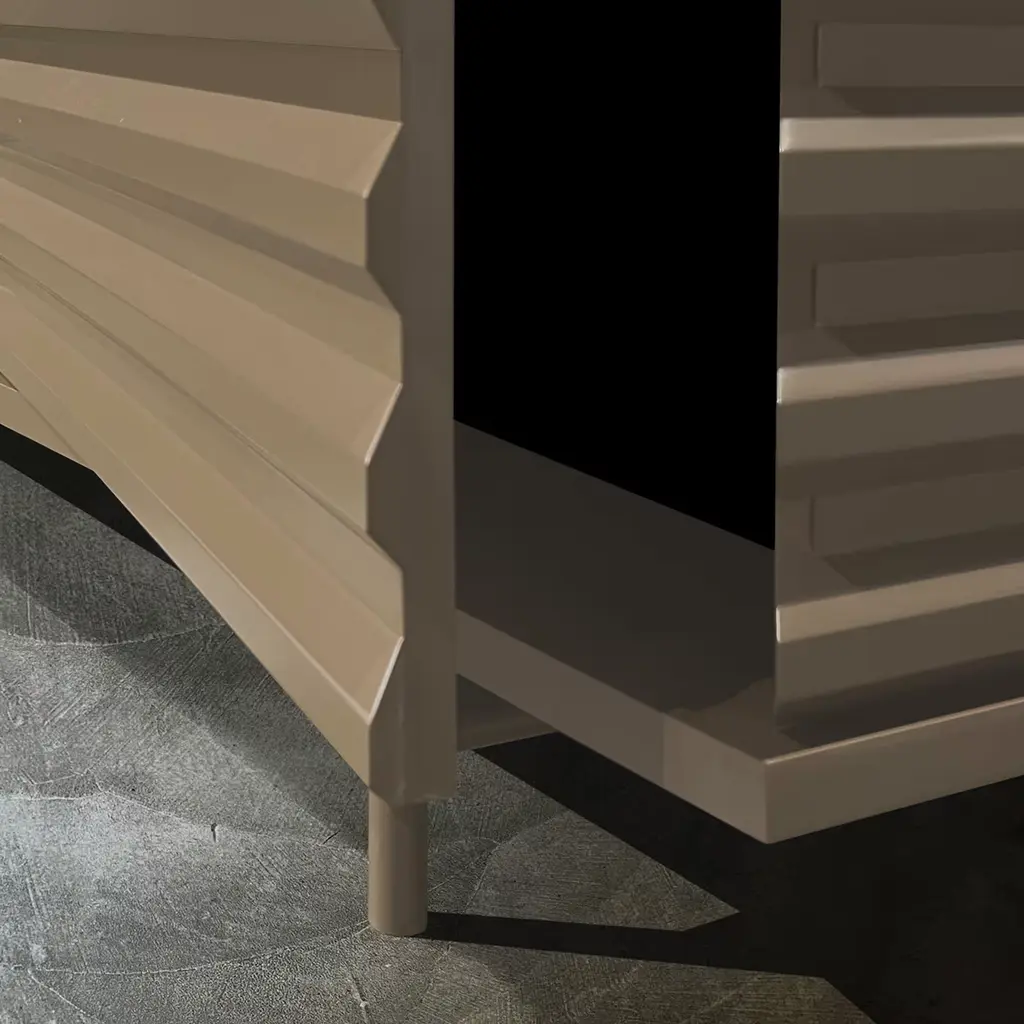 A perfect blend of modern design and sustainable materials, the B-SIDE sideboard is an ideal addition to your living space. Inspired by the clean, geometric lines of shipping containers, this piece stands out with its sleek MDF construction and refined matte finish. The slatted front panels create a dynamic visual contrast while enhancing its utility. The sideboard features an innovative design with versatile internal compartments, offering customization options to suit various needs.