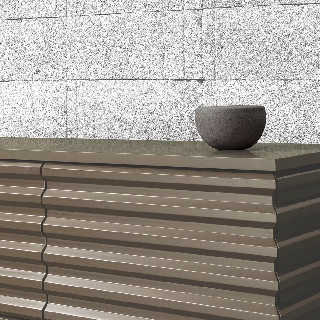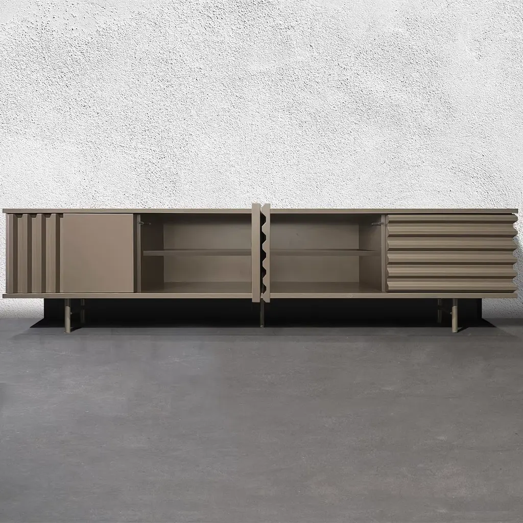 In a soft sand beige tone, the B-SIDE sideboard exudes understated elegance. Its 240cm length accommodates four push-pull doors adorned with grooved panels, inspired by shipping containers. The lacquered MDF base and matte eco-friendly finish create a polished, sustainable aesthetic. Offering customizable interiors and a palette of 12 colors, this piece highlights artisanal craftsmanship, blending modern design with practical functionality for contemporary living spaces.