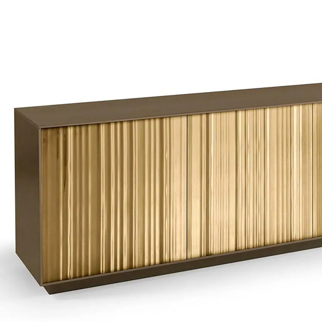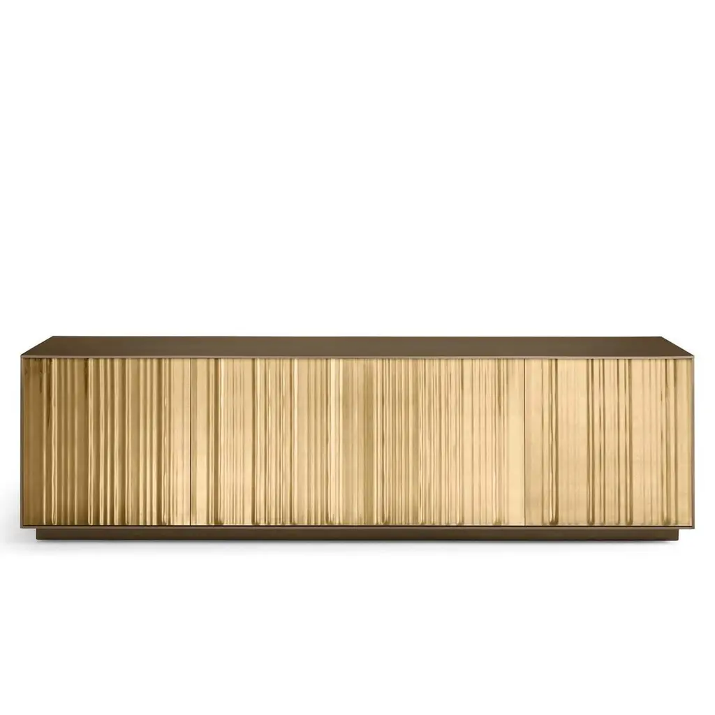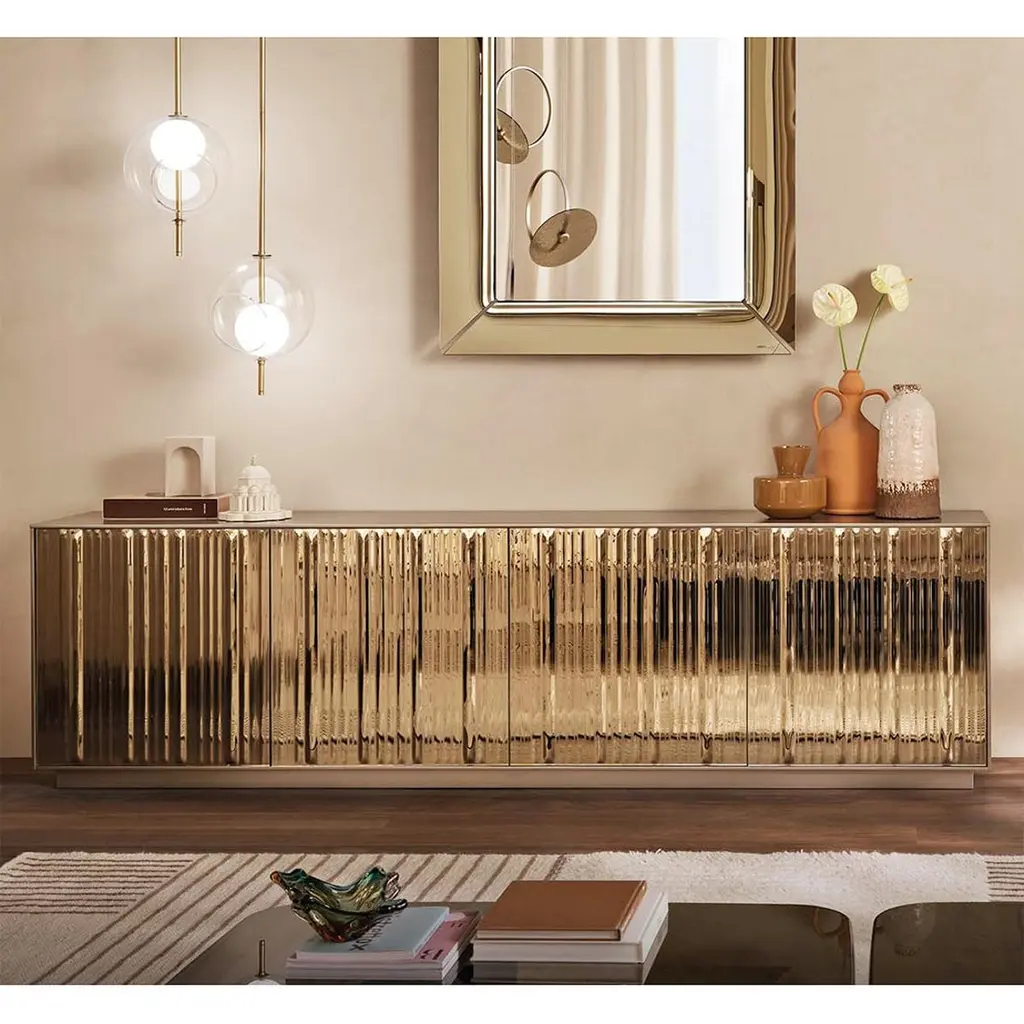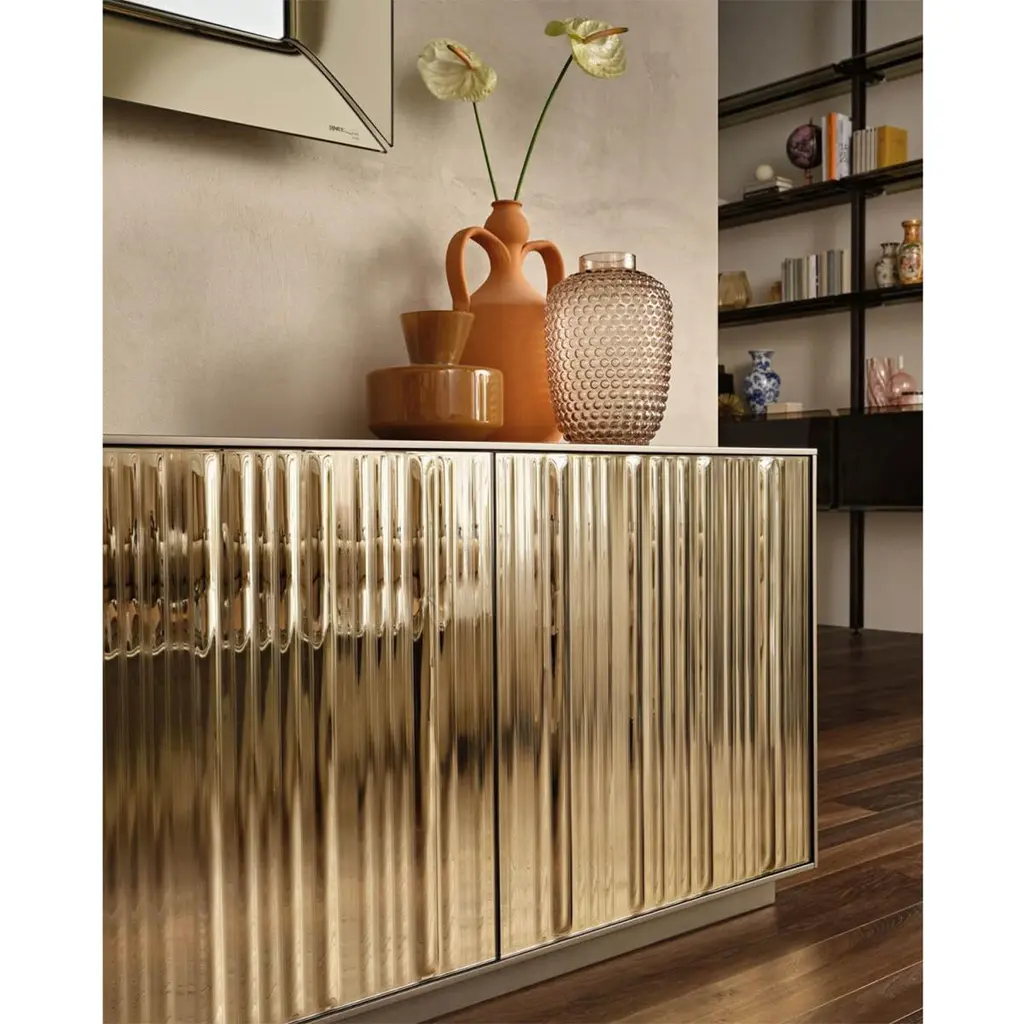 Sideboard with wooden structure in Greige Metallic olor in lacquered finish.With 4 doors in 6 mm thickness tempered fused glass in bronze finish and silvered underneath. Inside shelves on 1 level, in 8 mm thickness tempered glass in smoked finish. Each shelf can hold 20 kilos. Sideboard's top can hold 30 kilos.Also available on request in :L134xD47xH74cm, price: 6800,00€.L199xD47xH74cm, price: 7600,00€.