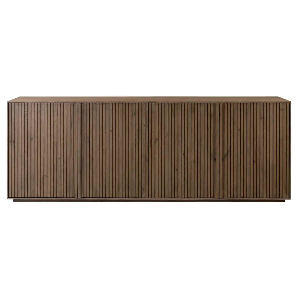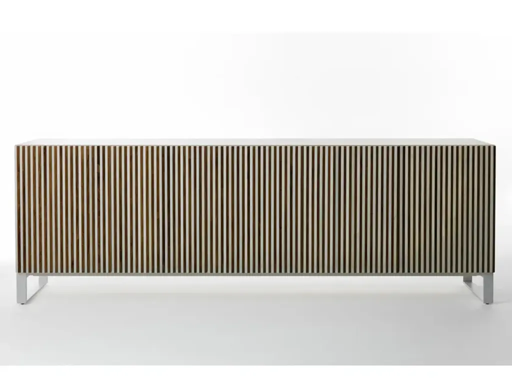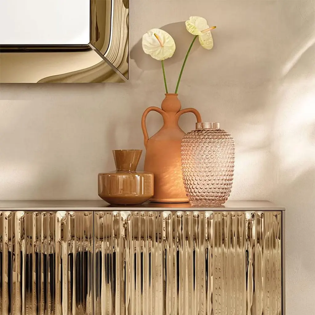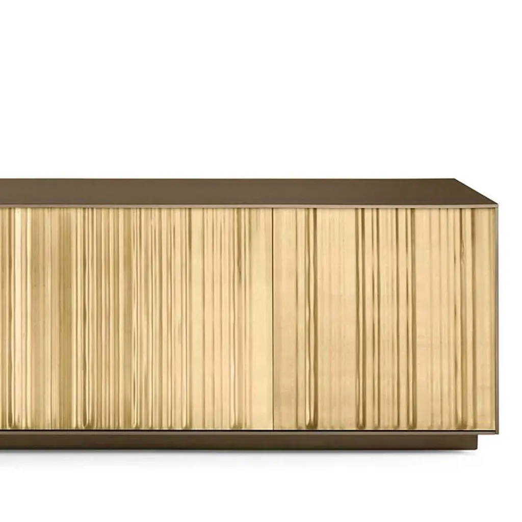 Sideboard with wooden structure in Greige Metallic olor in lacquered finish.With 4 doors in 6 mm thickness tempered fused glass in bronze finish and silvered underneath. Inside shelves on 1 level, in 8 mm thickness tempered glass in smoked finish. Each shelf can hold 20 kilos. Sideboard's top can hold 30 kilos.Also available on request in :L134xD47xH74cm, price: 6800,00€.L199xD47xH74cm, price: 7600,00€.
