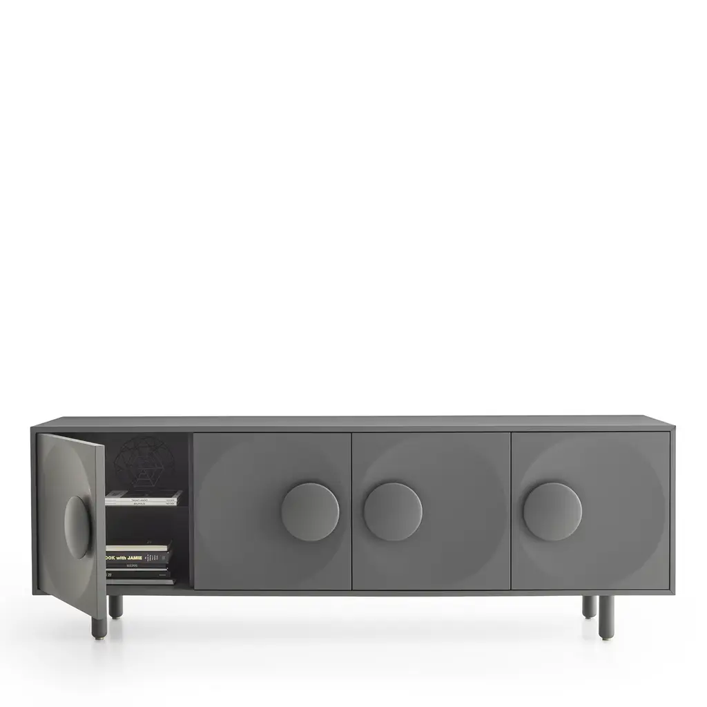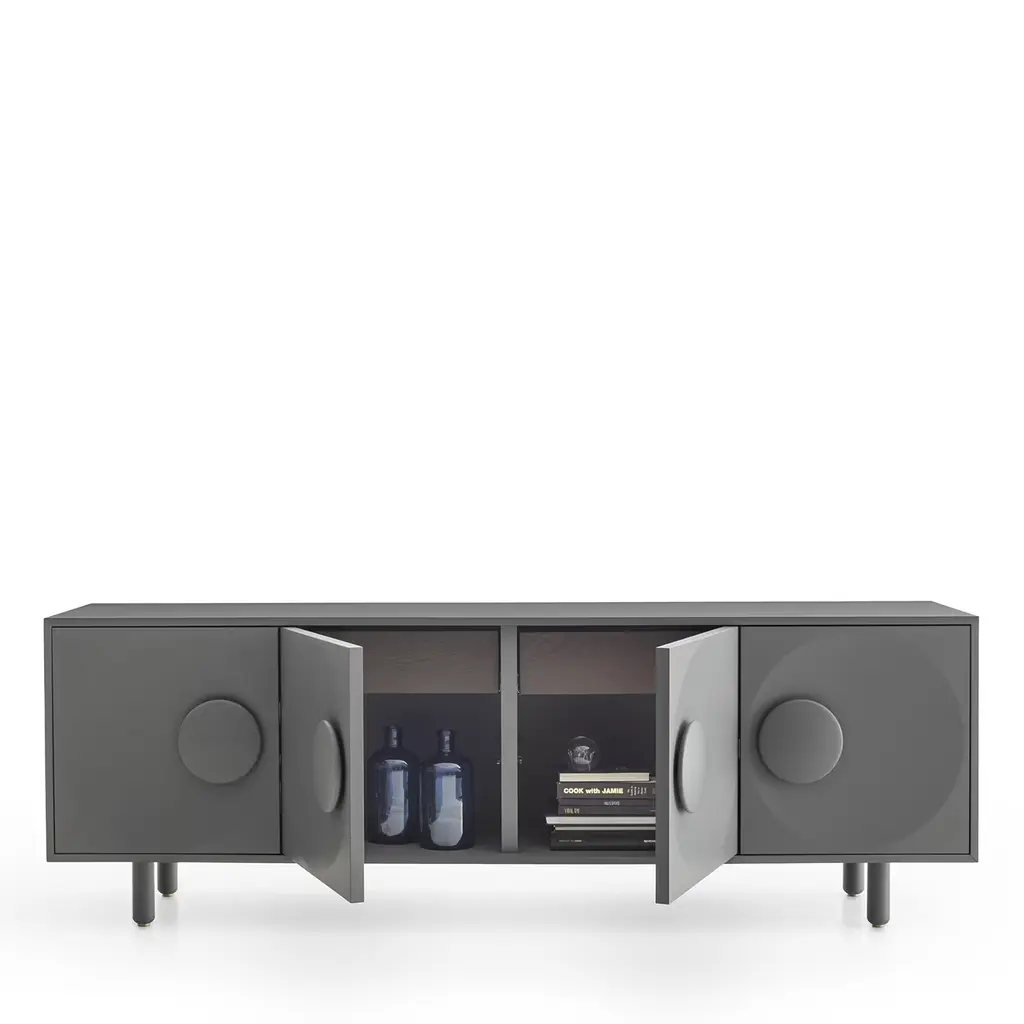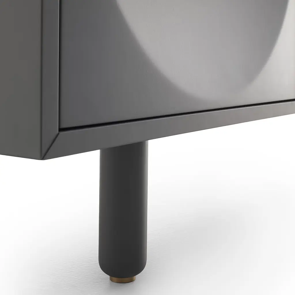 Inspired by the '20s French fashion trend of indulging in buttons, this sideboard glamorously merges past and present. Accented with brass tips, solid wooden feet raise the sturdy linear MDF structure, extensively lacquered in anthracite-gray and distinguished by button-shaped handles emerging from slight circular depressions. two Inner dark oak-veneered drawers and two smoky glass shelves complete the design.
