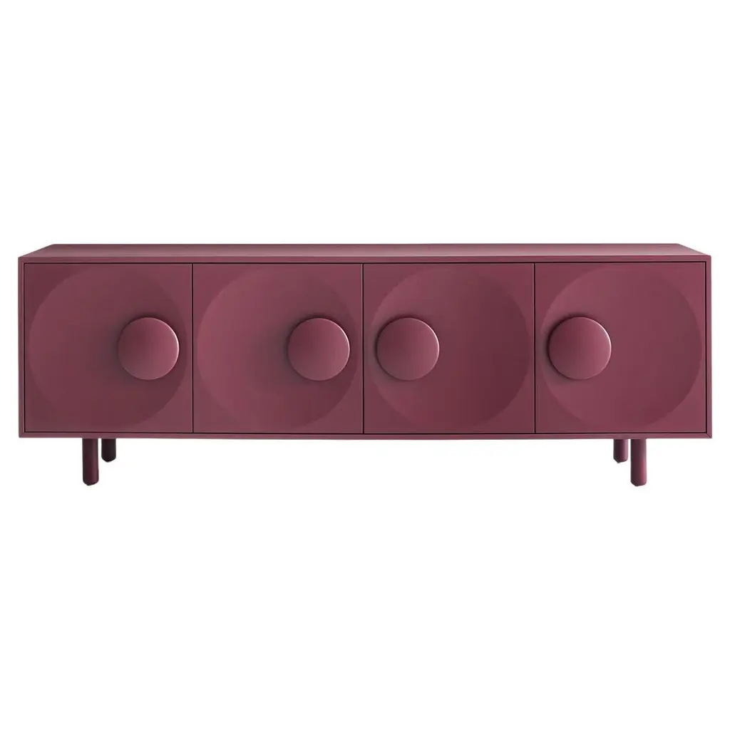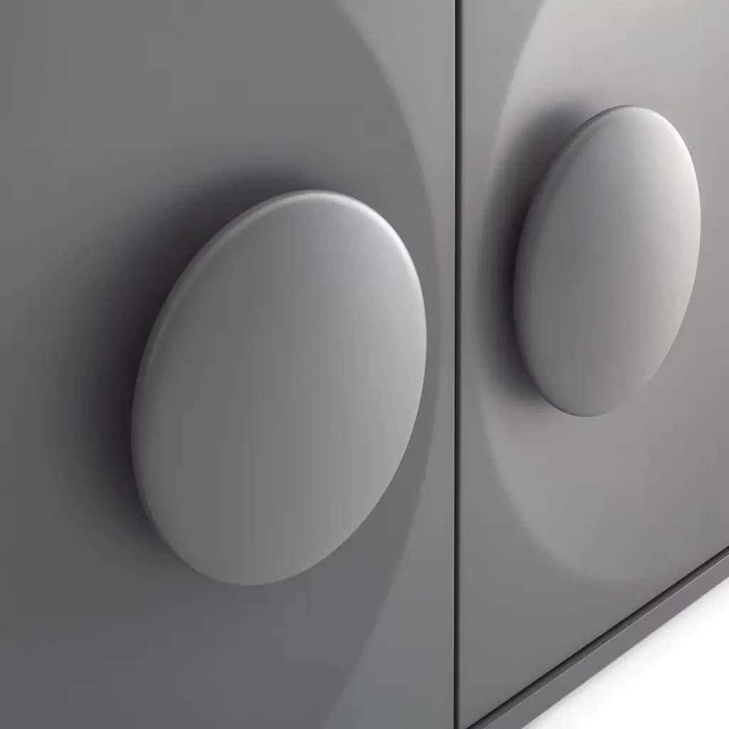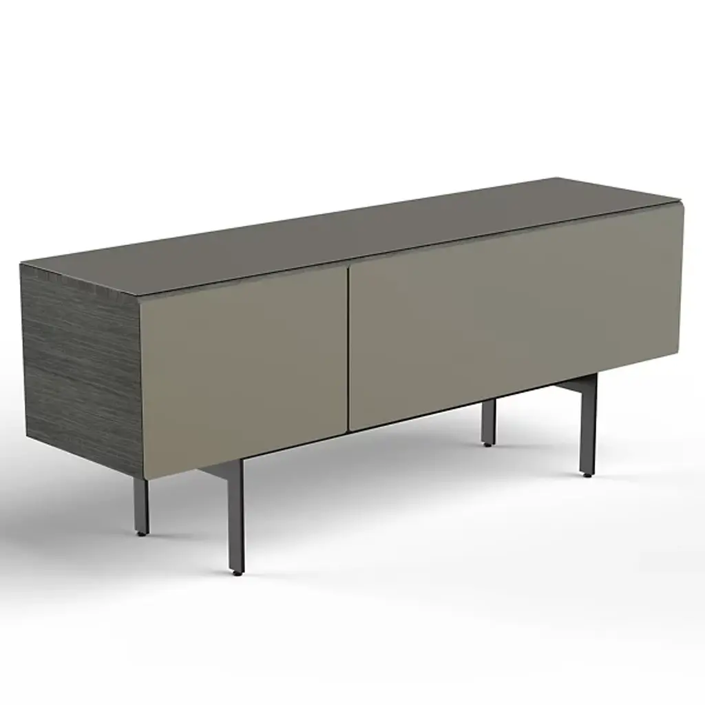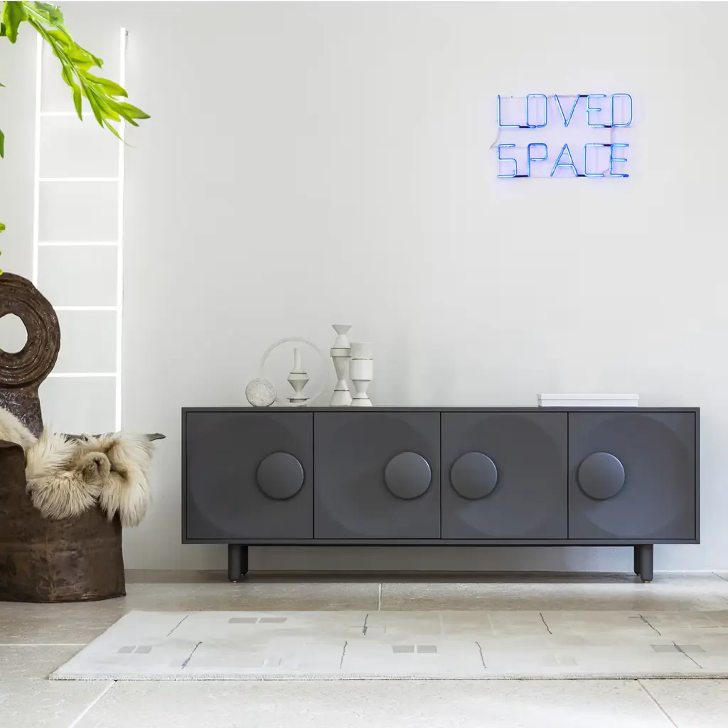 Inspired by the '20s French fashion trend of indulging in buttons, this sideboard glamorously merges past and present. Accented with brass tips, solid wooden feet raise the sturdy linear MDF structure, extensively lacquered in anthracite-gray and distinguished by button-shaped handles emerging from slight circular depressions. two Inner dark oak-veneered drawers and two smoky glass shelves complete the design.