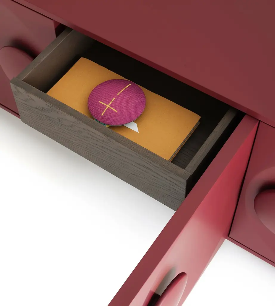 This stylish sideboard owes its artful button-like handles - emerging from slight and coherent circular depressions - to the indulgence in buttons that trended in France during the '20s. Fashioned of MDF, the rigorous structure is lacquered in a wine-red hue that extends to the turned solid wooden feet also accented with brass tips. Smoky glass shelves and dark oak veneered drawers complete the design.