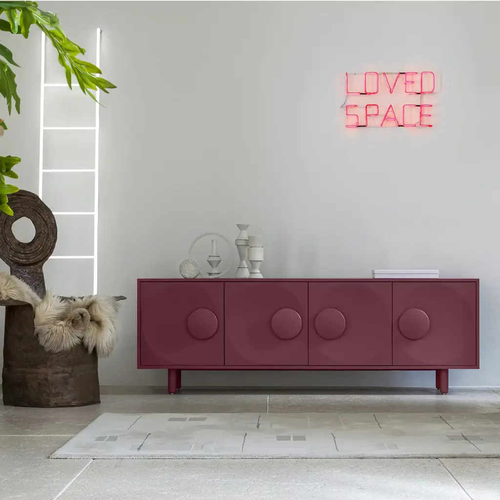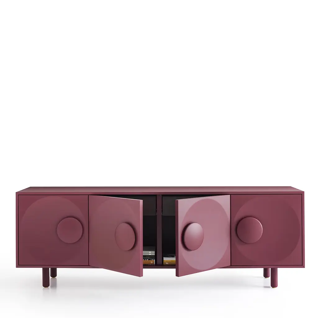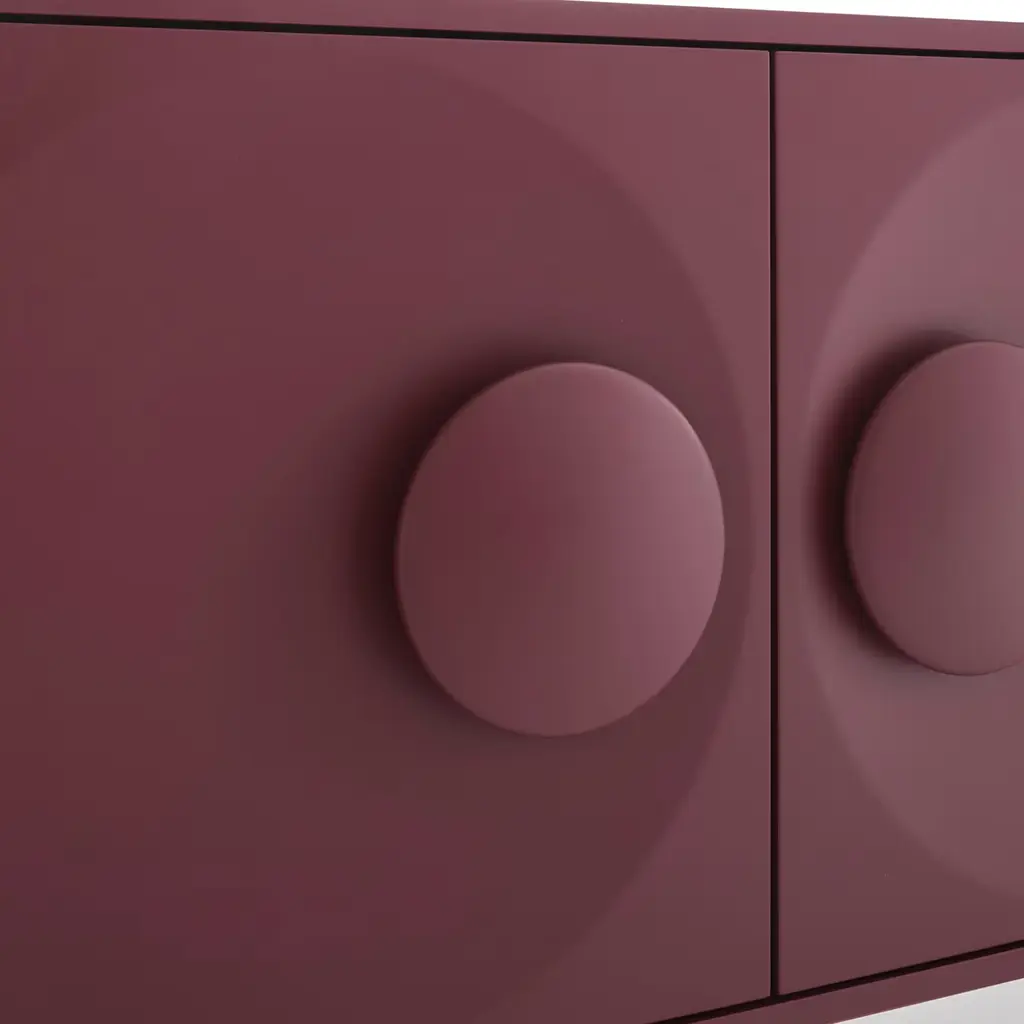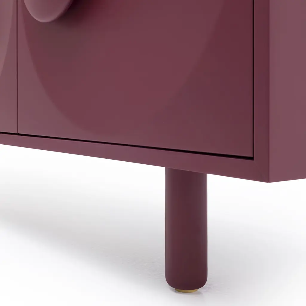 This stylish sideboard owes its artful button-like handles - emerging from slight and coherent circular depressions - to the indulgence in buttons that trended in France during the '20s. Fashioned of MDF, the rigorous structure is lacquered in a wine-red hue that extends to the turned solid wooden feet also accented with brass tips. Two smoky glass shelves and two dark oak veneered drawers complete the design.