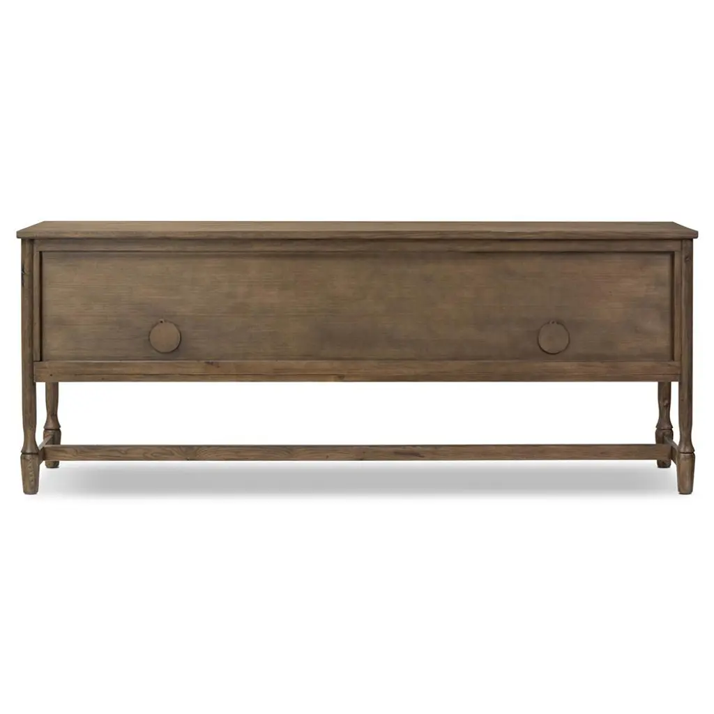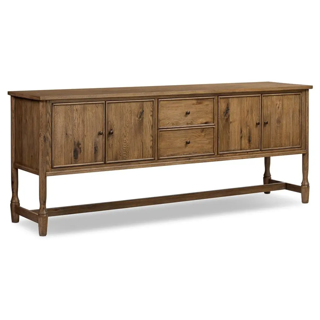 A design collaboration by Amber Lewis and Four Hands.Small, rounded molding and turn shape legs - classic storage with an update. Configured with two drawers in the middle and two doors on either side with bronze hardware, this sideboard offers ample storage space with detailed design, finished to accent the rich characteristics of the wood.