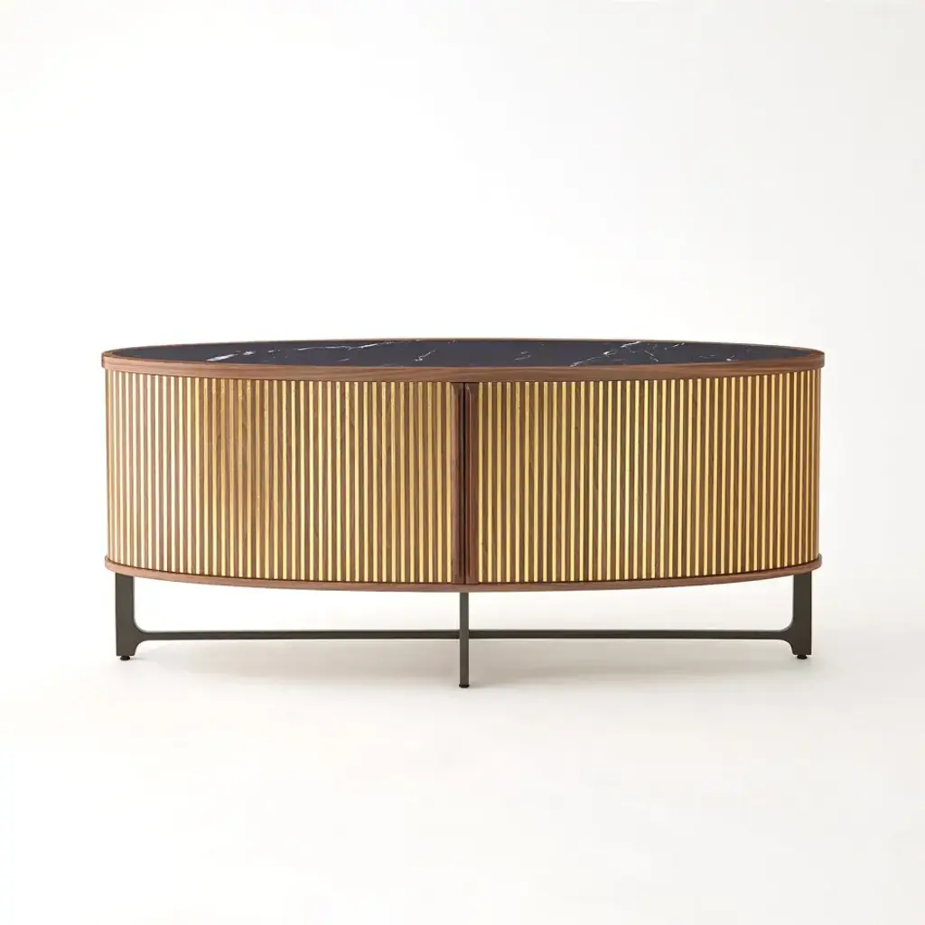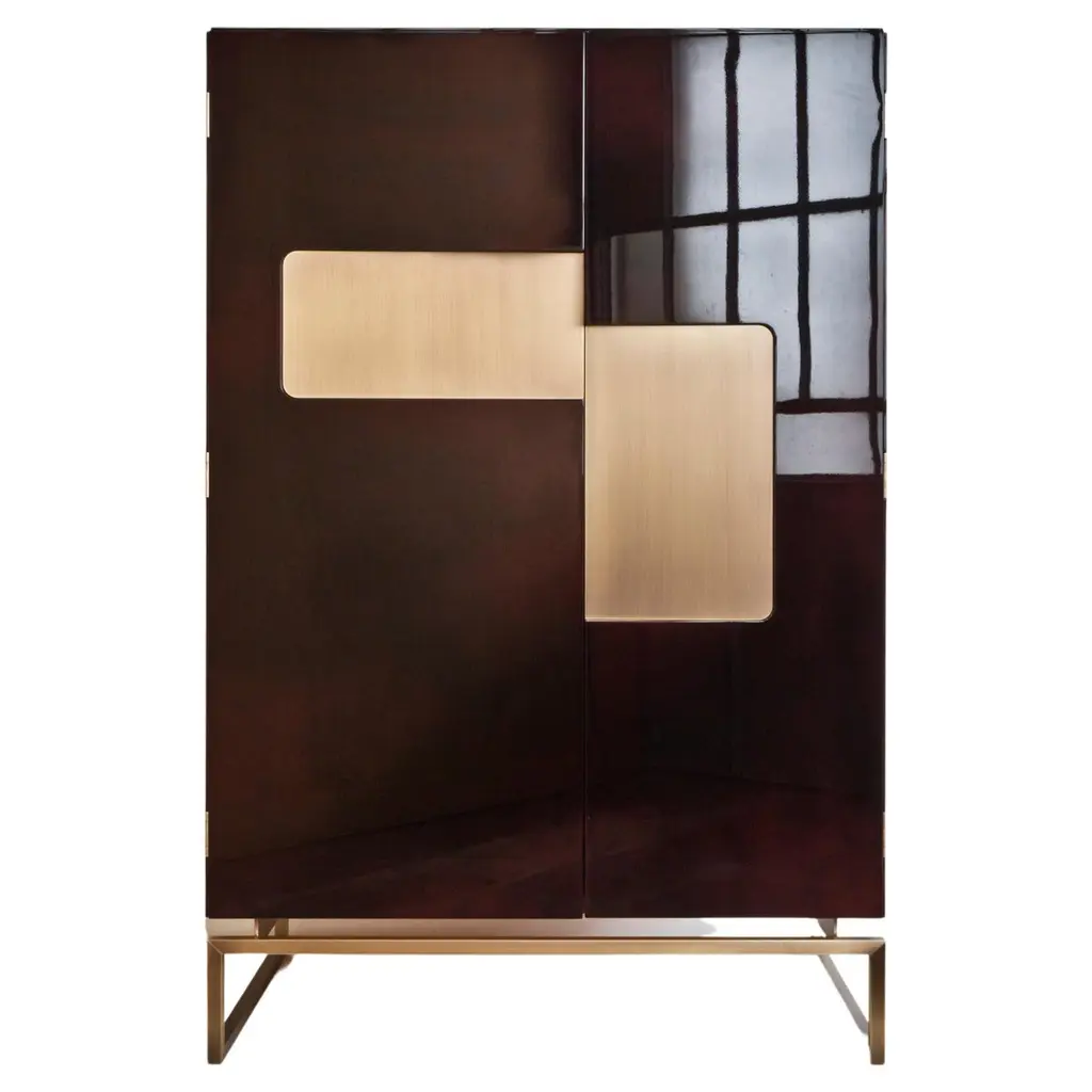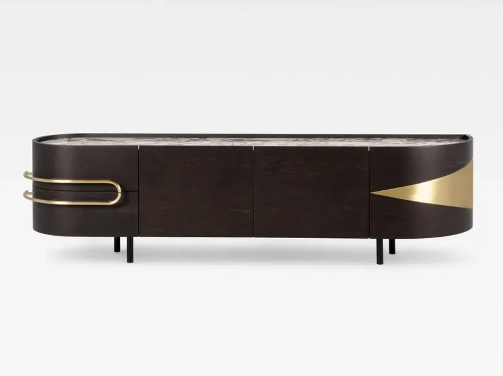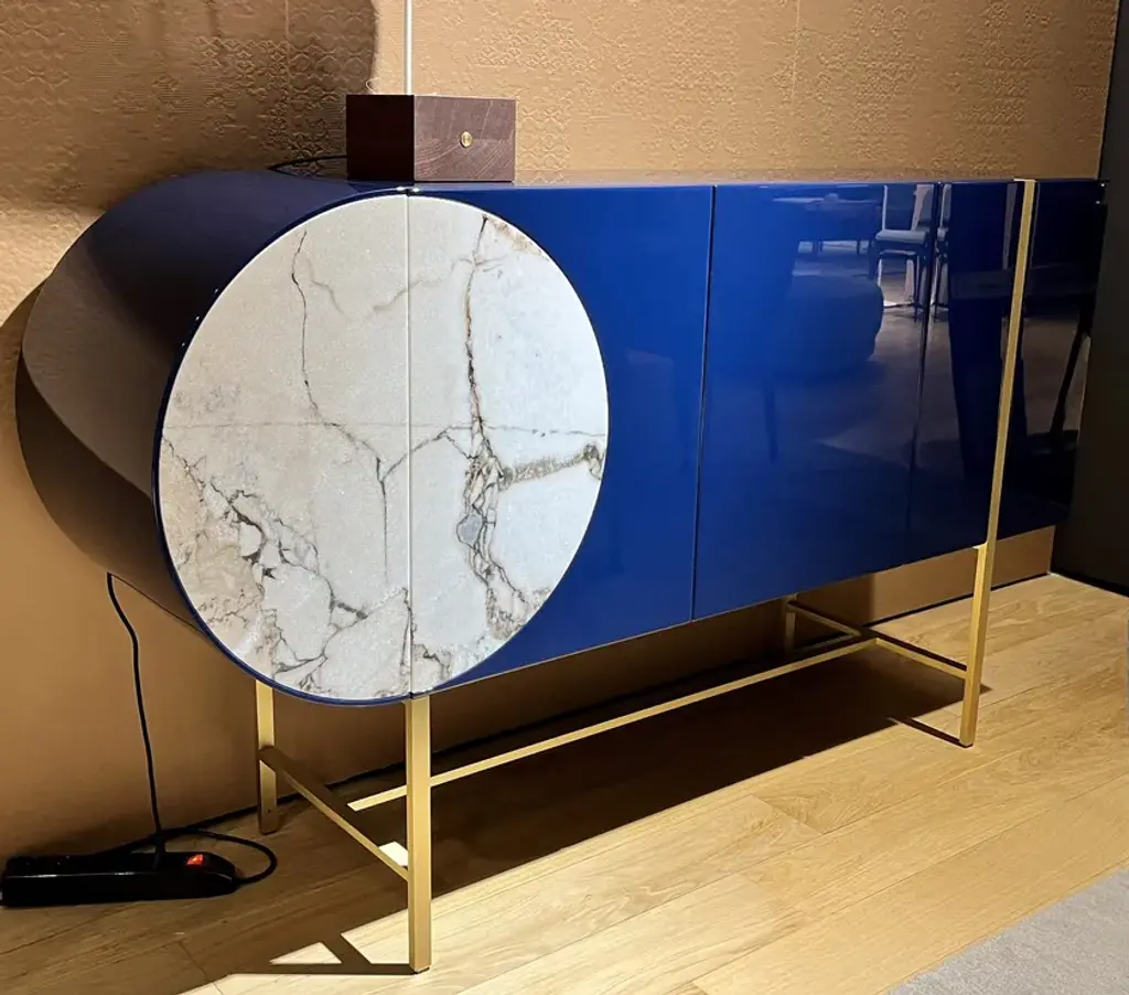 Selene is a sideboard with MDF structure, with reinforcing aluminium sheets, lacquered in direct polish. Circular stone with water.repellent protective oil inserts with aluminium honeycomb support, 14 mm thickness. Inner shelves in tempered glass with extra-light colour, 8 mm thickness. Base and decorative inserts in satin-finished brass with wax finish.PURCHASE INFORMATIONLacquer: blue.Door insert: Ocean Storm marble ******************************************************************************************Article displayed at the Archiproducts Bari showroom - Corso V. Emanuele II, 189 Bari.For more info or photo details contact the address bari@archiproducts.com******************************************************************************************