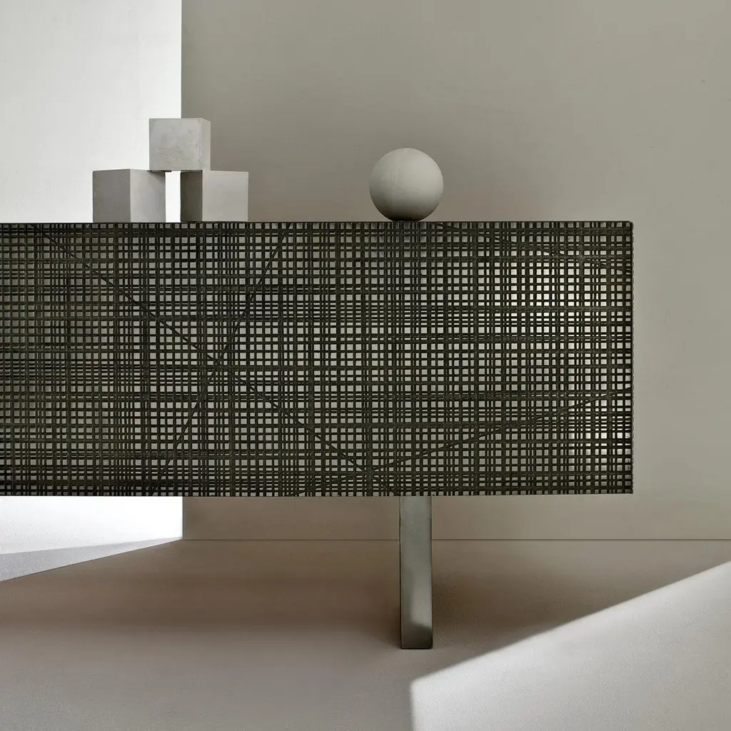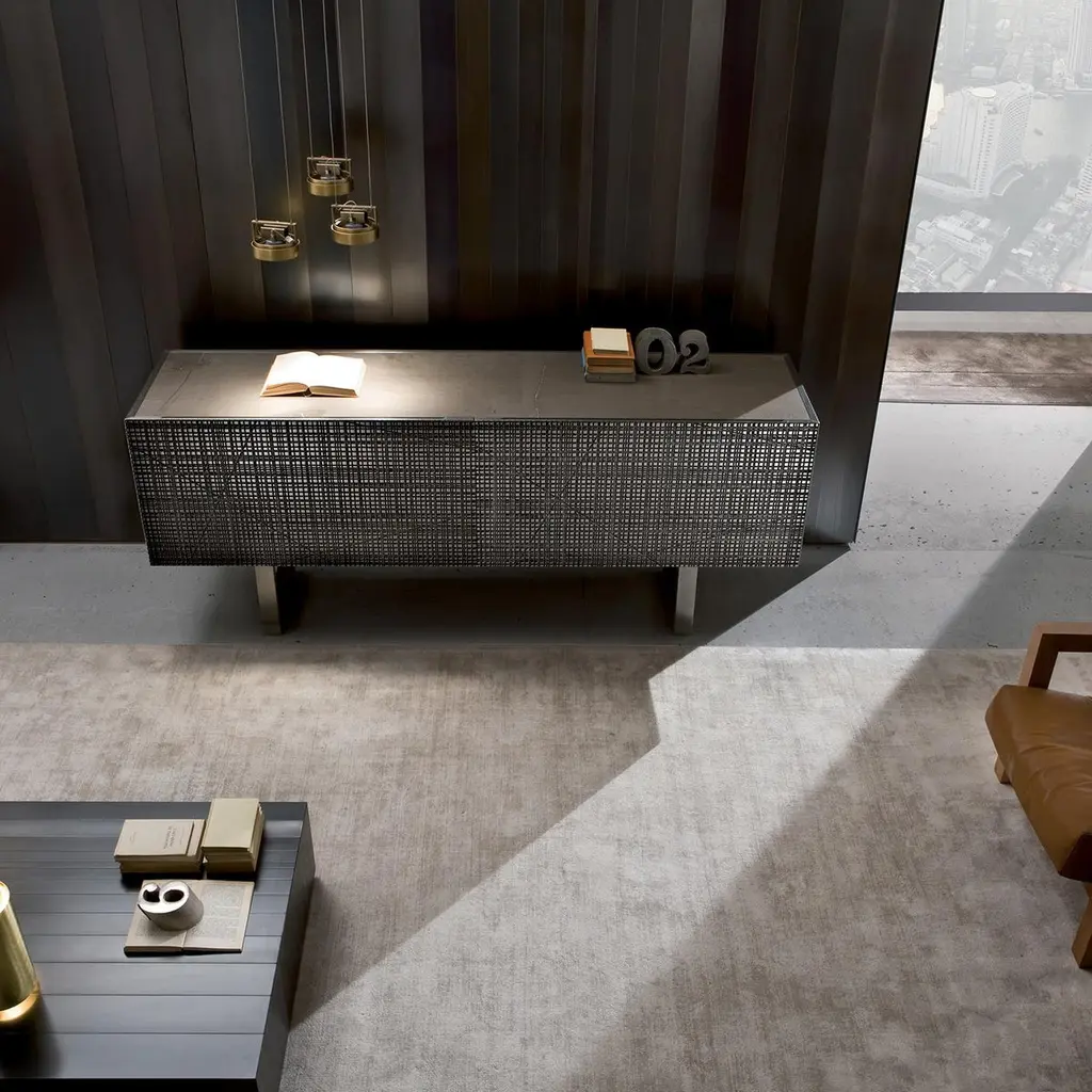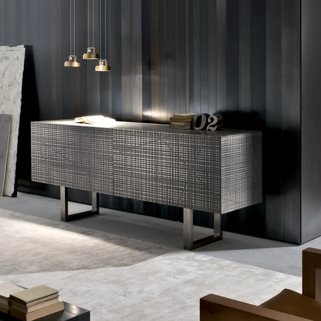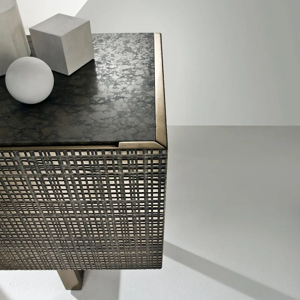 This wooden sideboard features visually striking, modern geometric carvings on its sides and flap doors, along with a liquid metal finish. Its top is in a choice of wood or marble. It has two removable, inner drawers and an interior Canaletto walnut finish. Other finishes are also available on request.