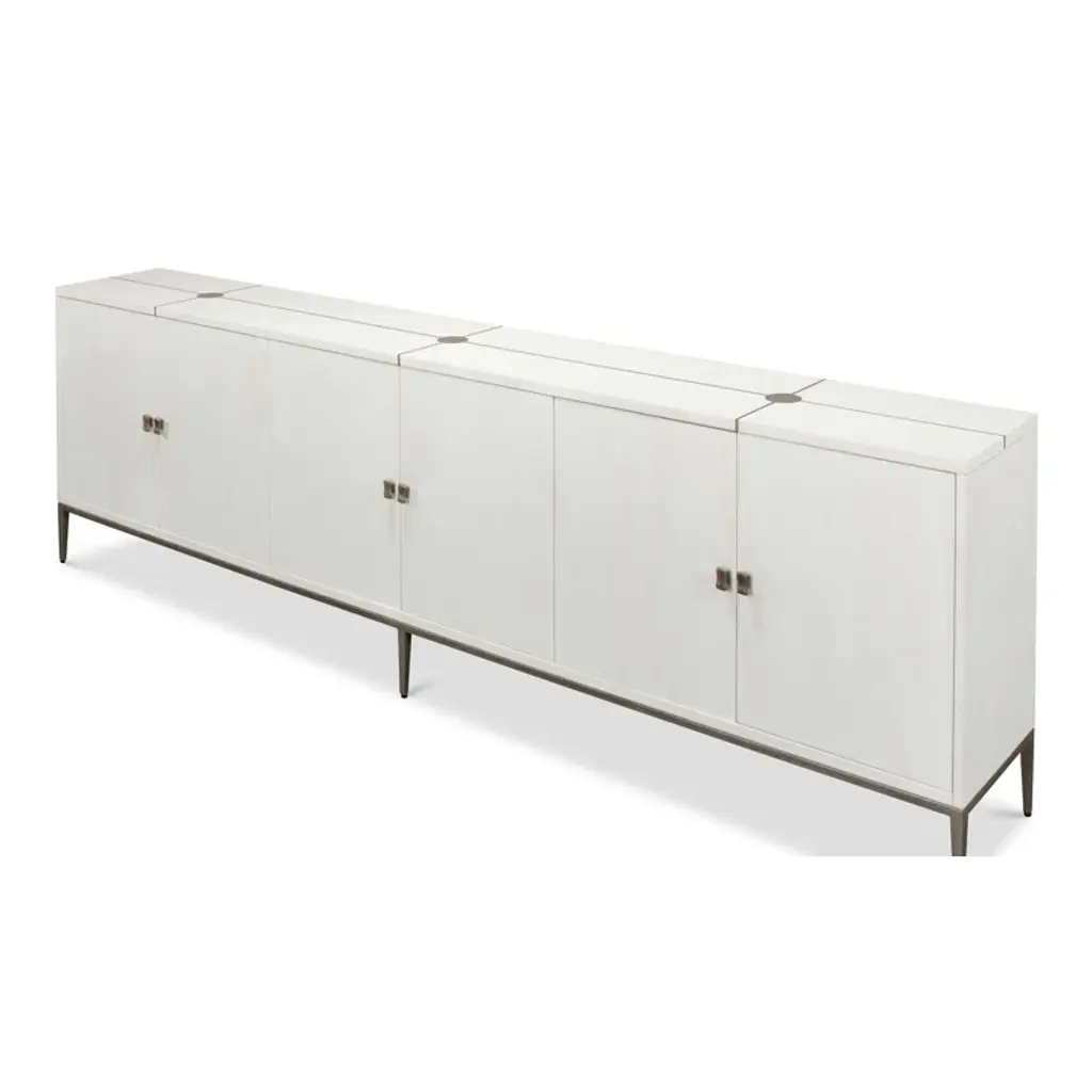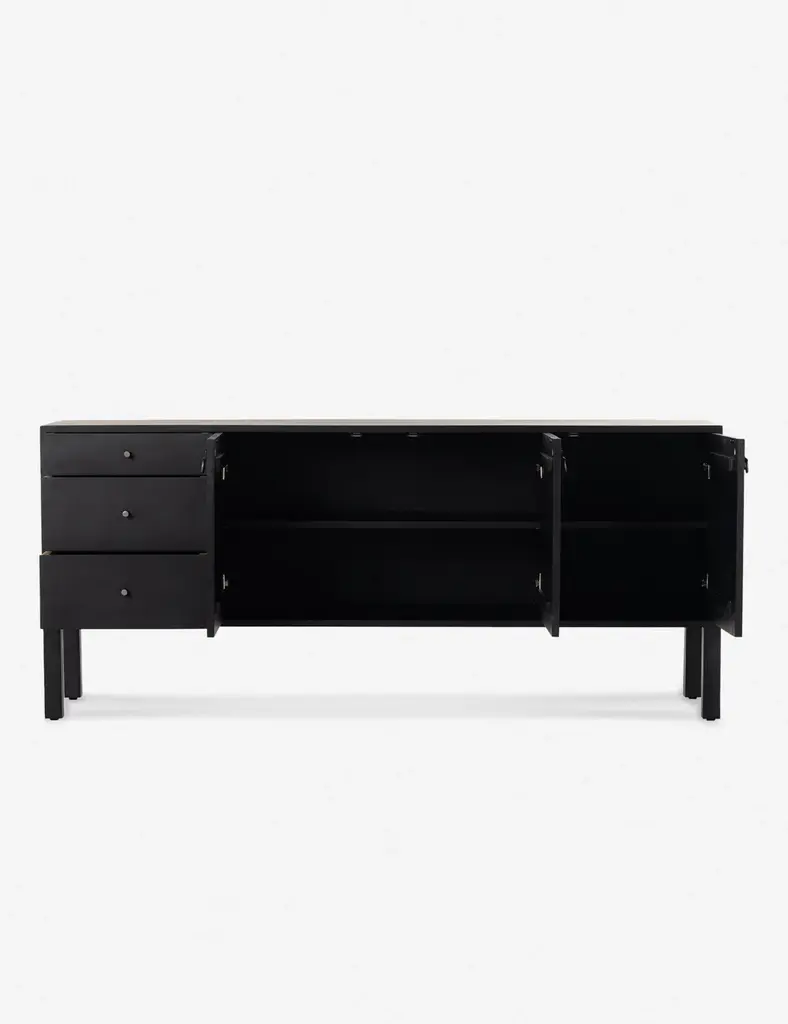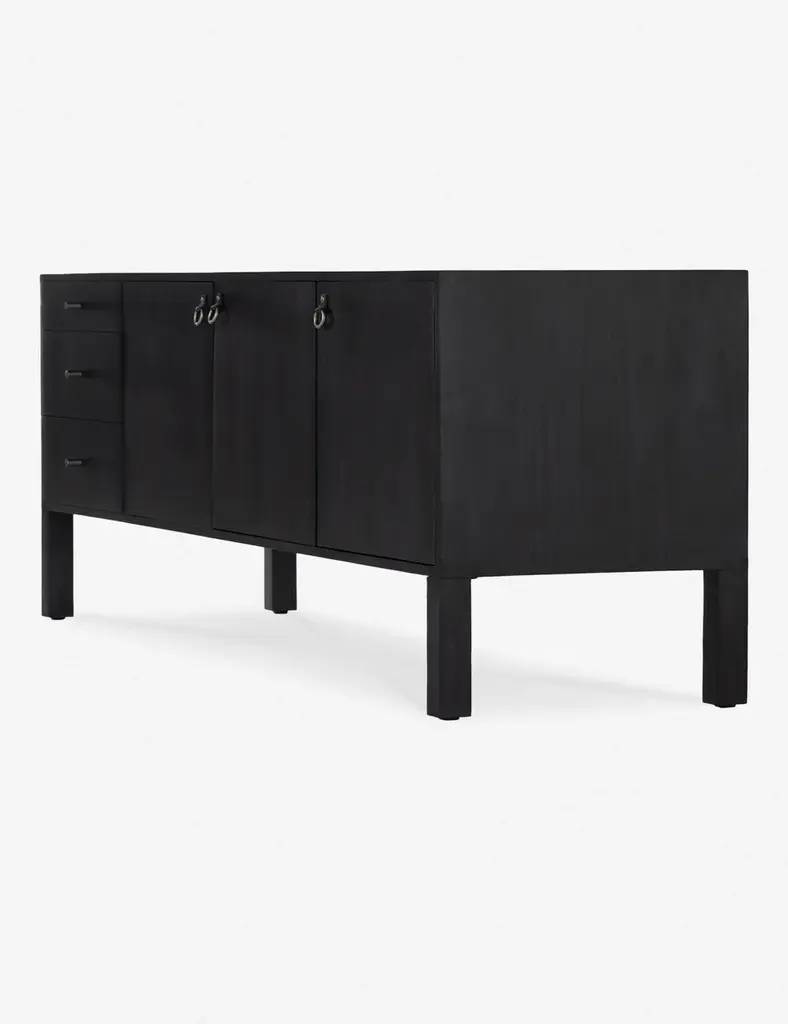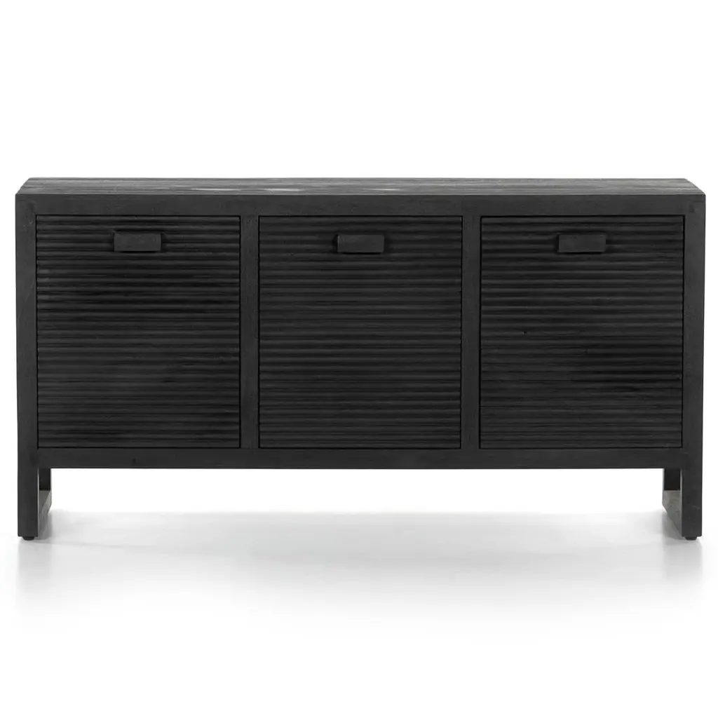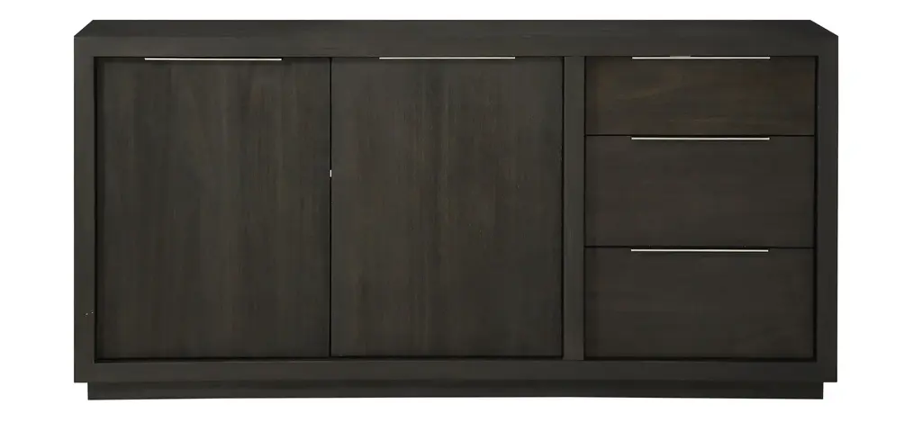 Pared-down lines and rough-hewn texture define this wood sideboard, bringing a simple, sophisticated look to your space. Crafted from solid poplar, it's a fresh update to Shaker-inspired style. With three drawers and roomy cabinets finished with iron and leather pulls, this buffet sideboard can hold all of your tableware essentials.