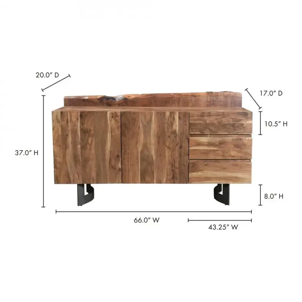 The Bent collection puts nature’s craft front and center. Made of beautiful solid acacia wood, rustic live edge detailing shows off the unique knots and whorls of the wood. Two doors and side-mounted drawers all open to reveal ample storage in this gorgeous buffet. The perfect sideboard for your dining utensils, it can also serve as a console table or storage cabinet. Pair with other pieces in the Bent collection for a complete look.