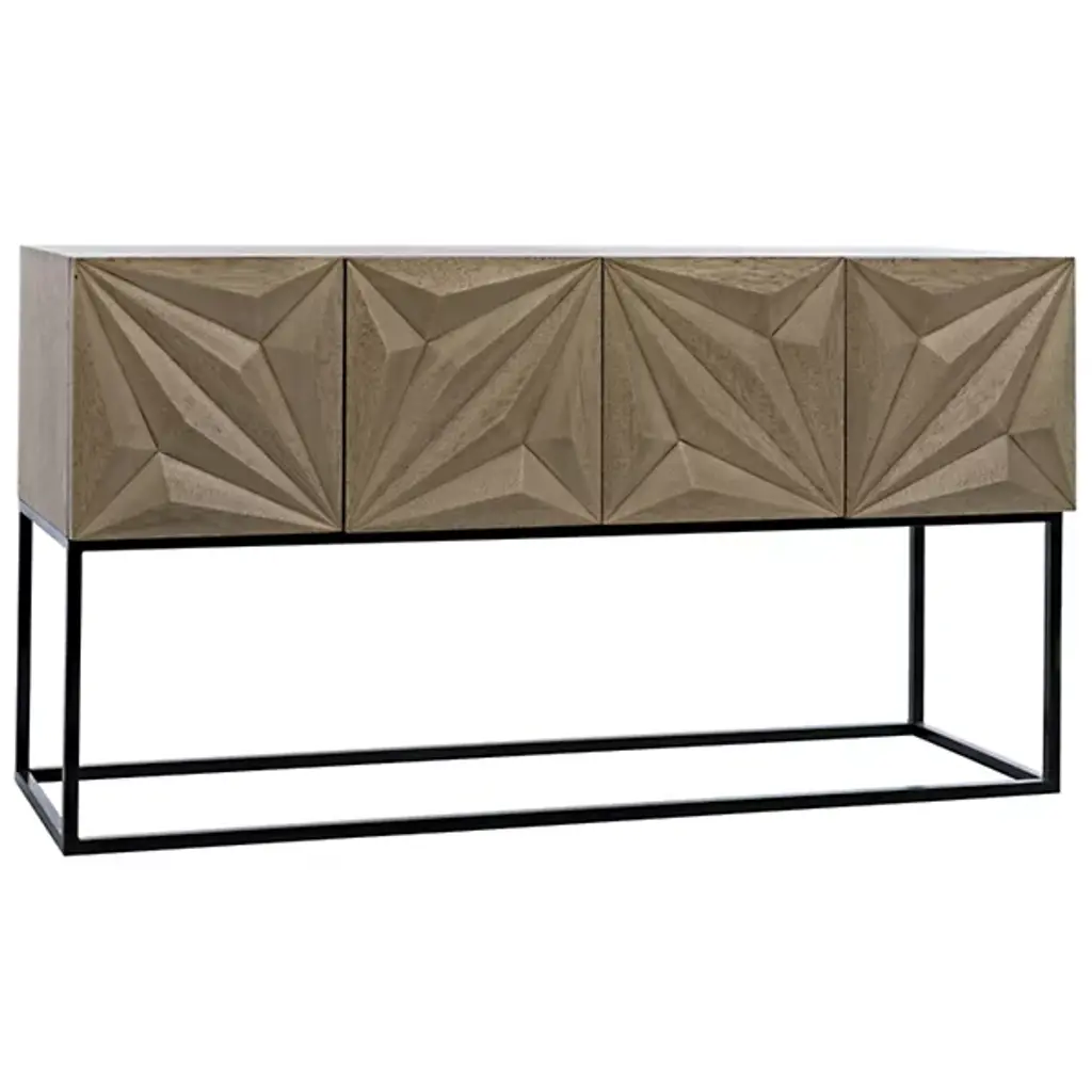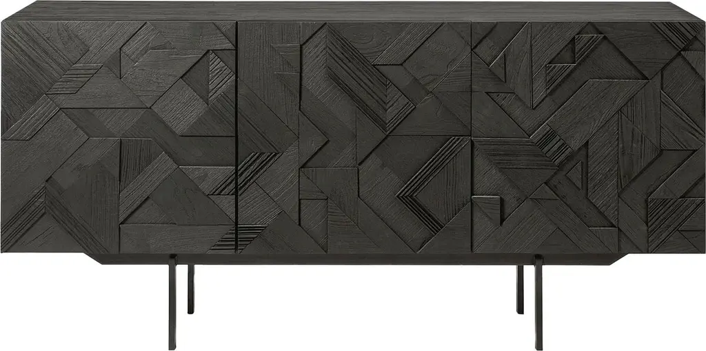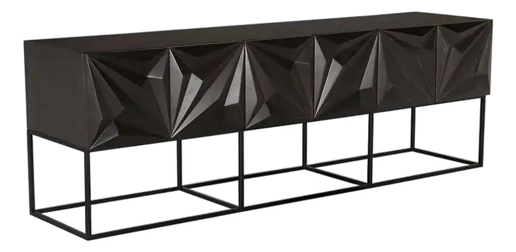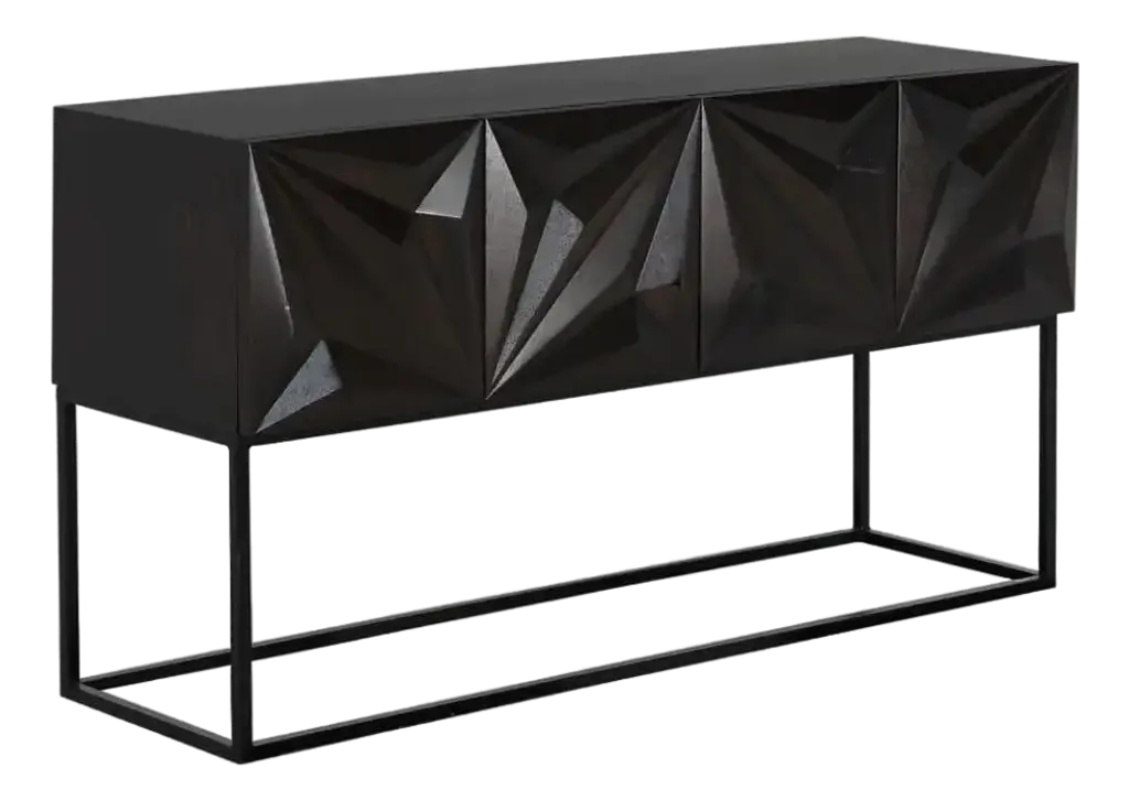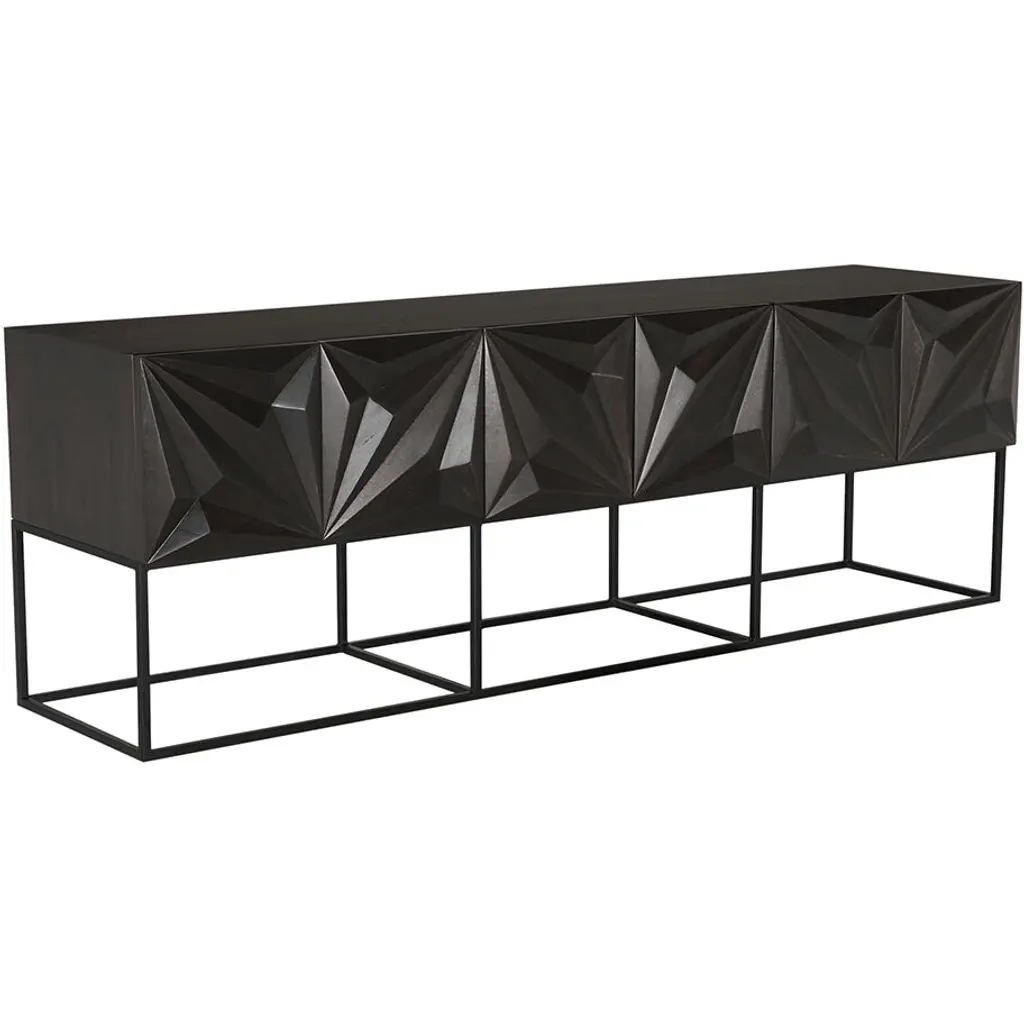 Handsome black stained modern prism sideboard. Beautiful geometric design continued patterns hand carved in solid salvaged wood with iron legs. Wonderful storage, media or buffet use. Interior fixed shelves offer 13’’ in height space. Weight is approx. 130 lbs.