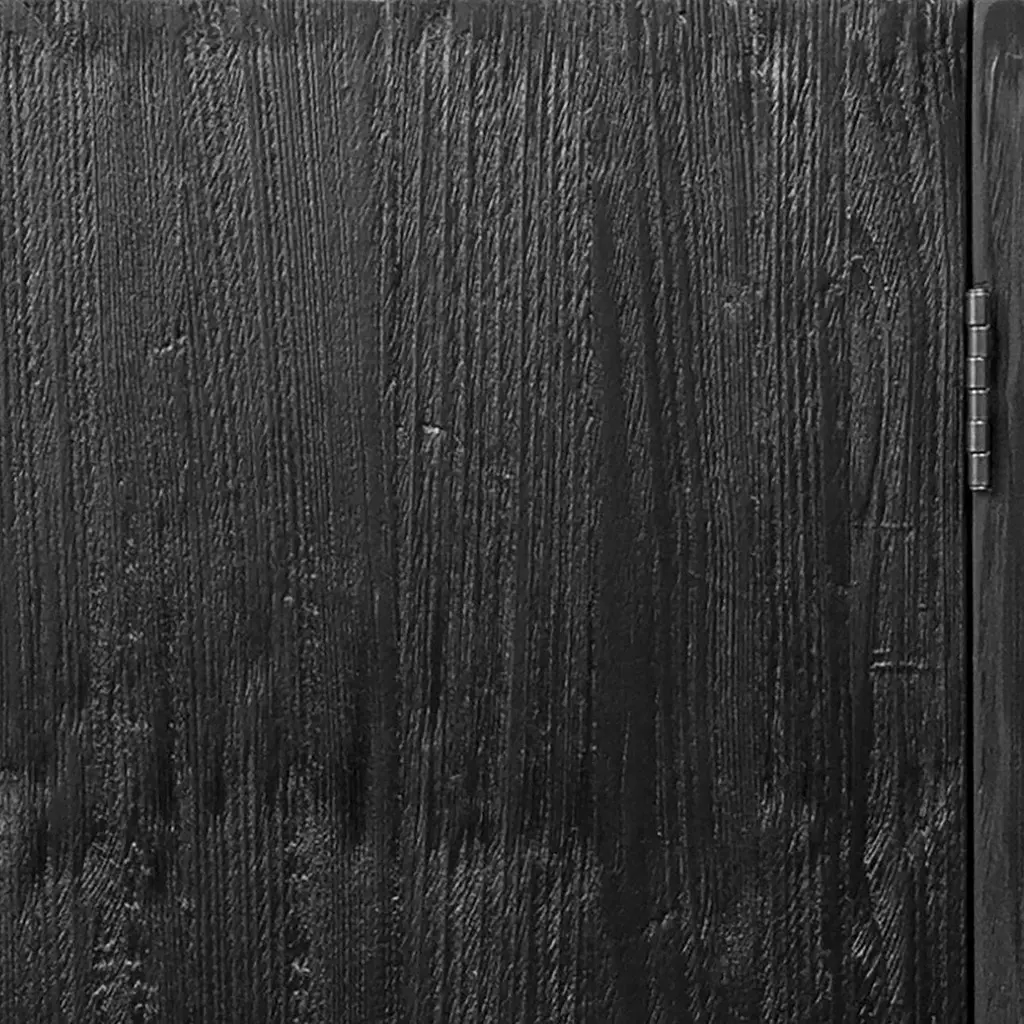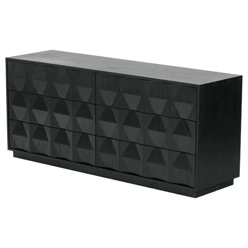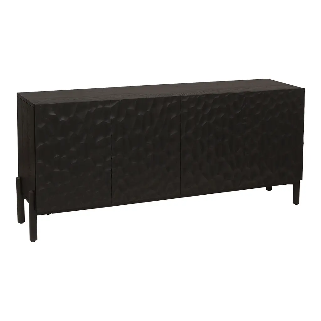 Handsome black stained modern prism sideboard. Beautiful geometric design continued patterns hand carved in solid salvaged wood with iron legs. Wonderful storage, media or buffet use. Interior fixed shelves offer 13’’ in height space. Weight is approx. 130 lbs.