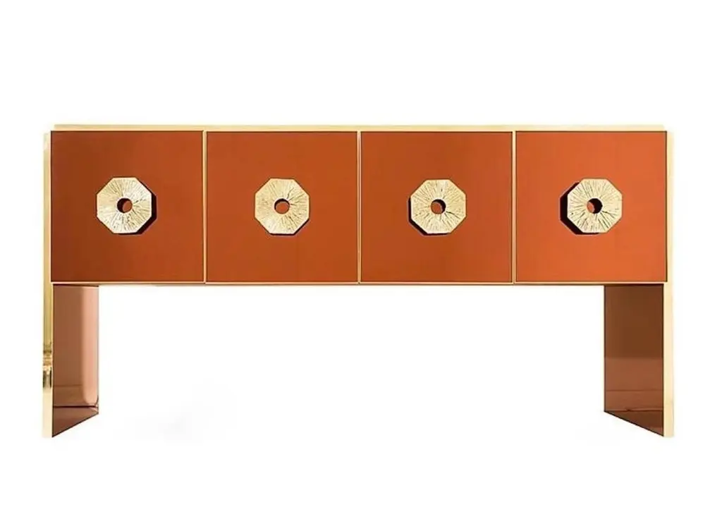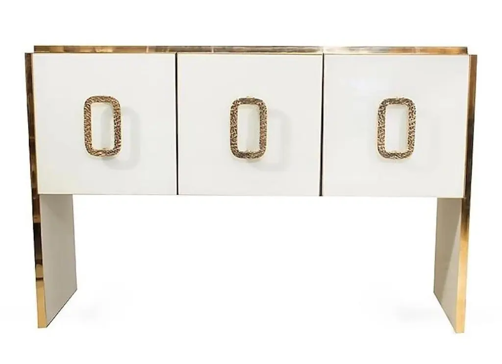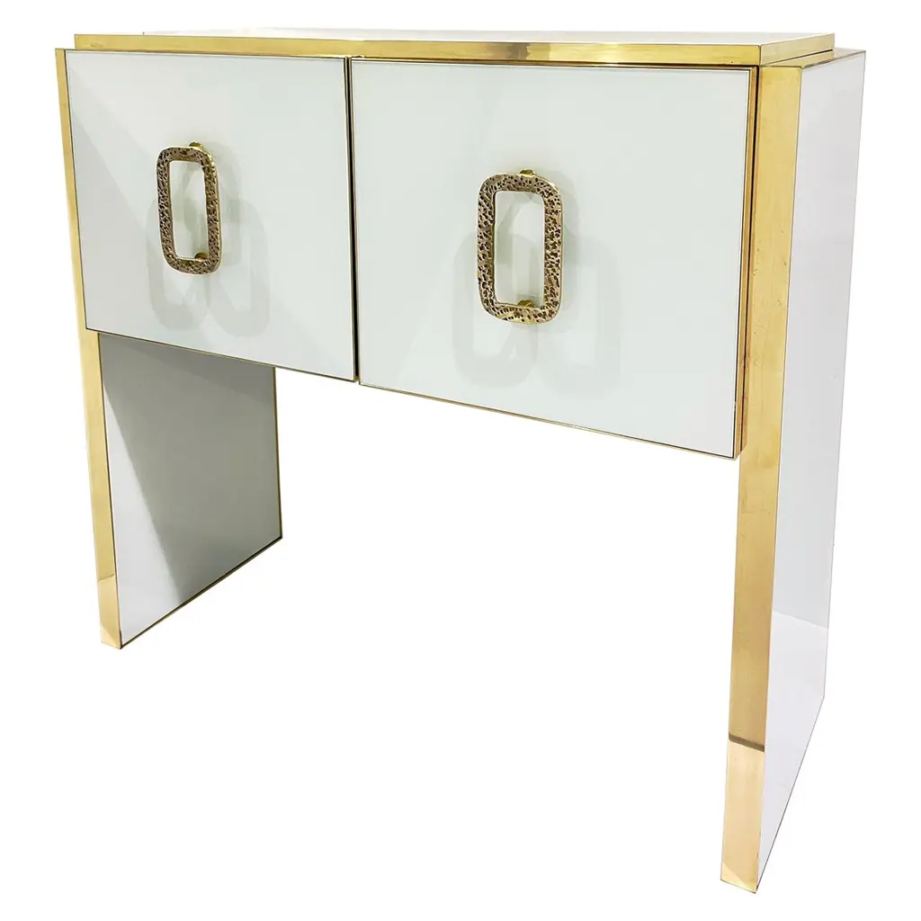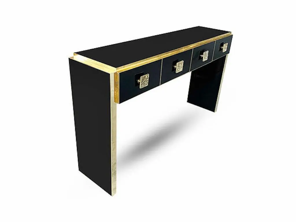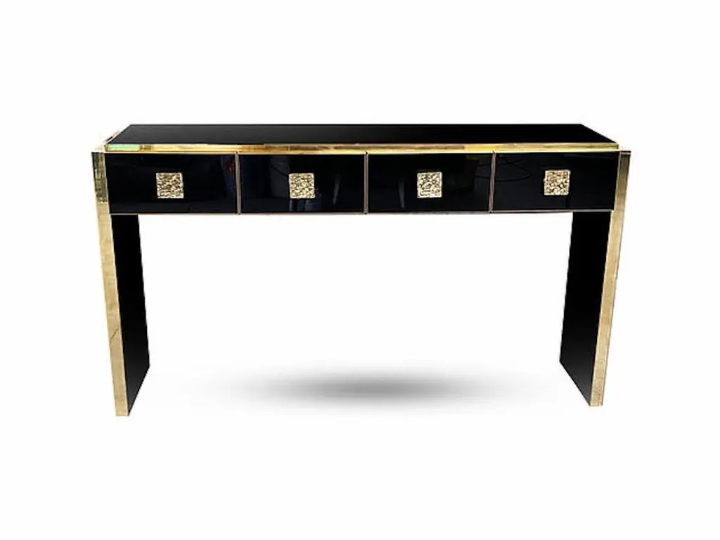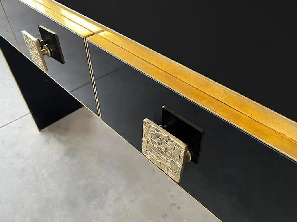 Contemporary Bespoke customizable 4-drawer modern console table, entirely handcrafted in Italy, with elegant Hollywood Regency style, the dramatic surround decorated with art glass in a striking high-shine black like lacquer, highlighted with cast brass sculptural geometric handles, raised on continuous straight sides that serve as legs.High quality of execution with great attention to details with the whole body and drawers exquisitely edged with brass profiles.A versatile and functional design that can be personalized in glass colors, finishes, and sizes, as a sideboard, credenza, nightstands, console.