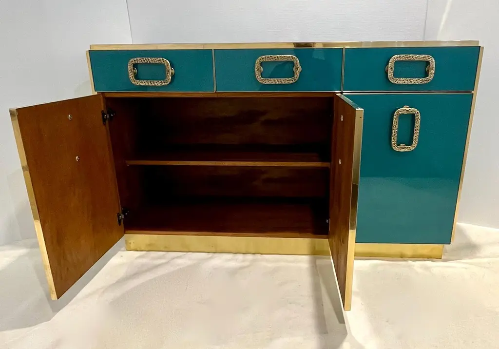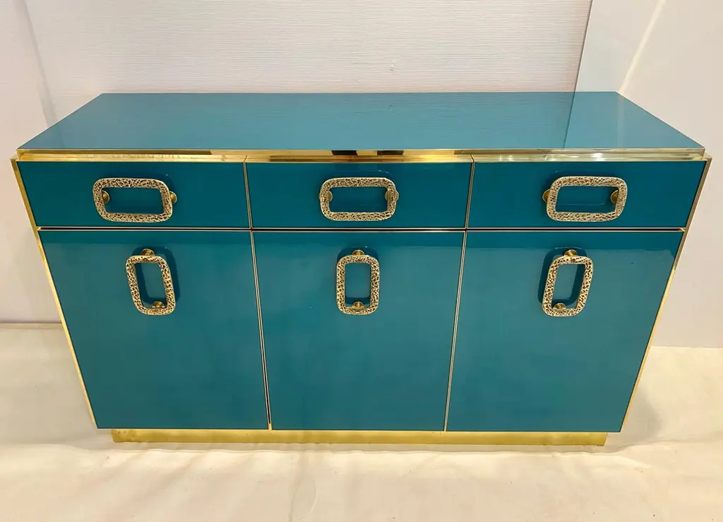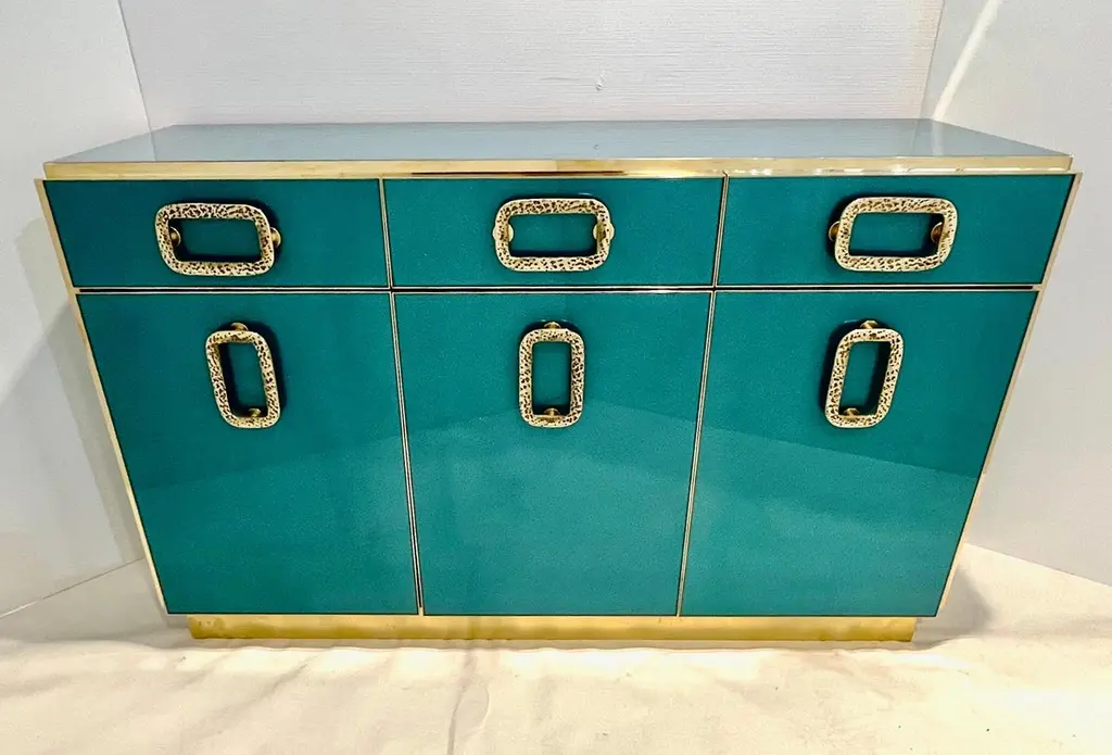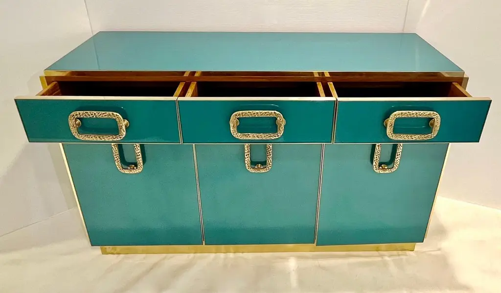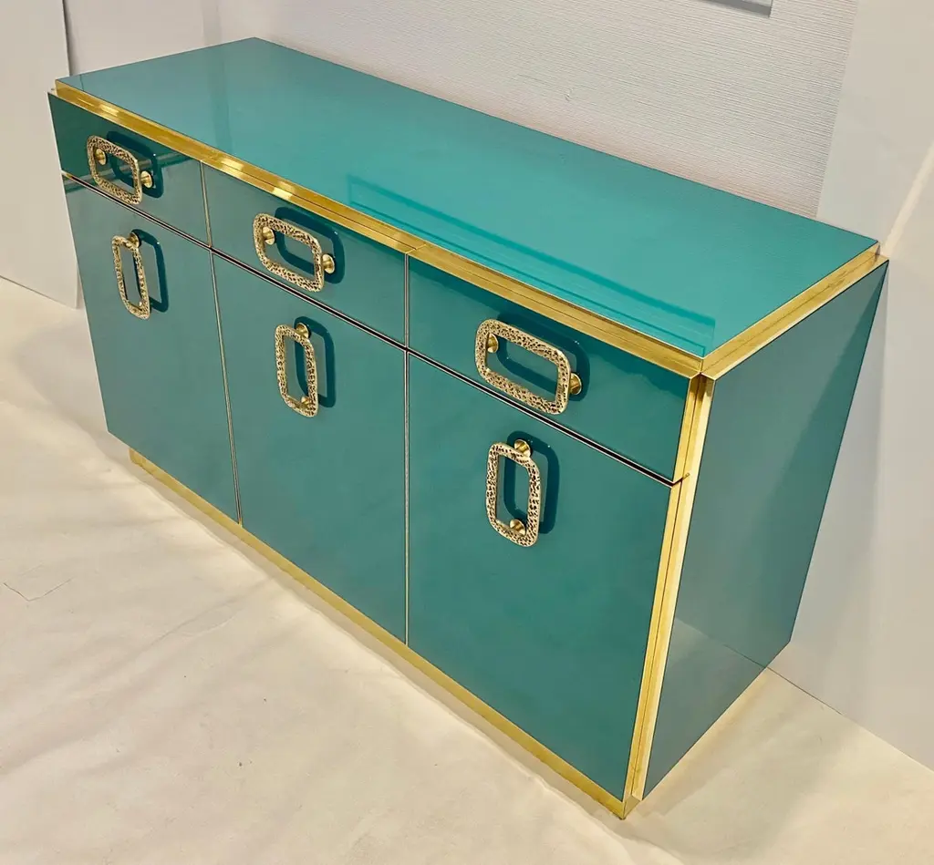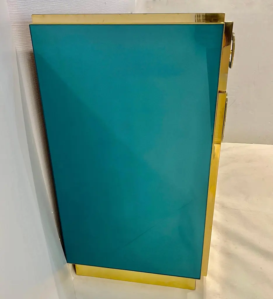 Bespoke Italian Art Design Brass Metallic Emerald Blue Glass Dresser Sideboard