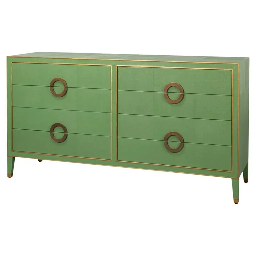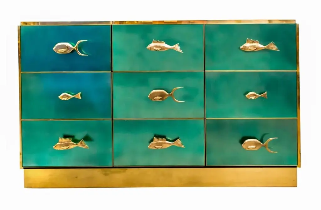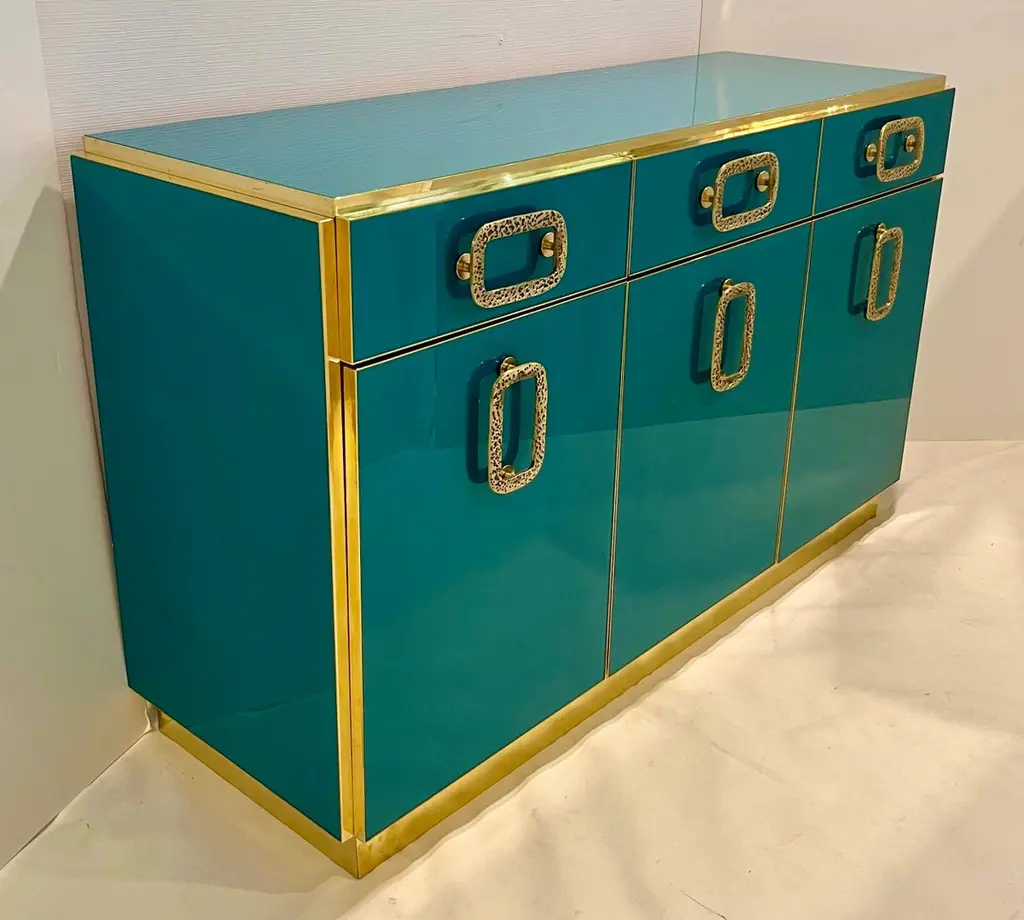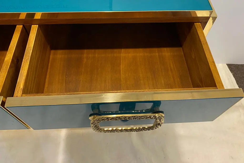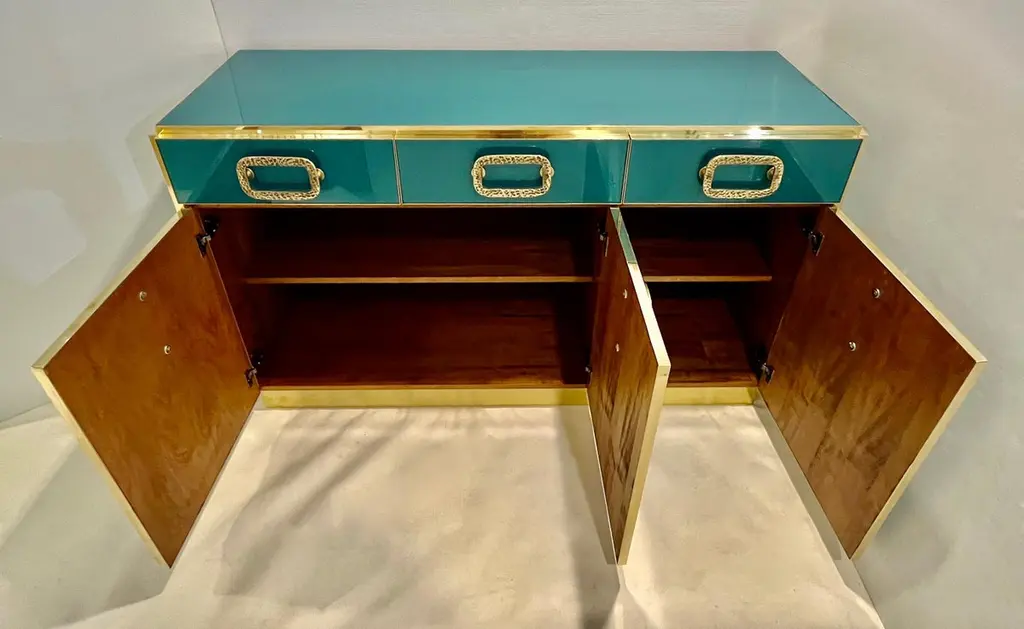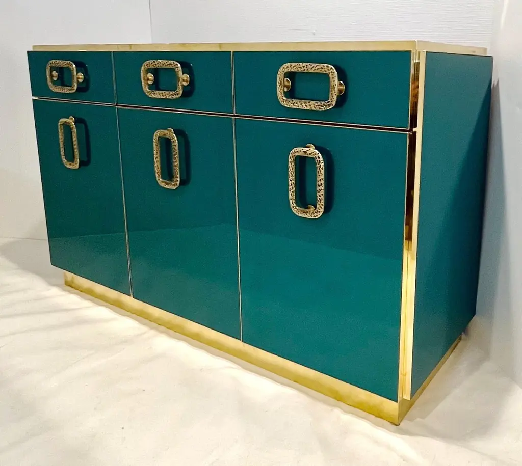 Bespoke Italian Art Design Brass Metallic Emerald Blue Glass Dresser Sideboard