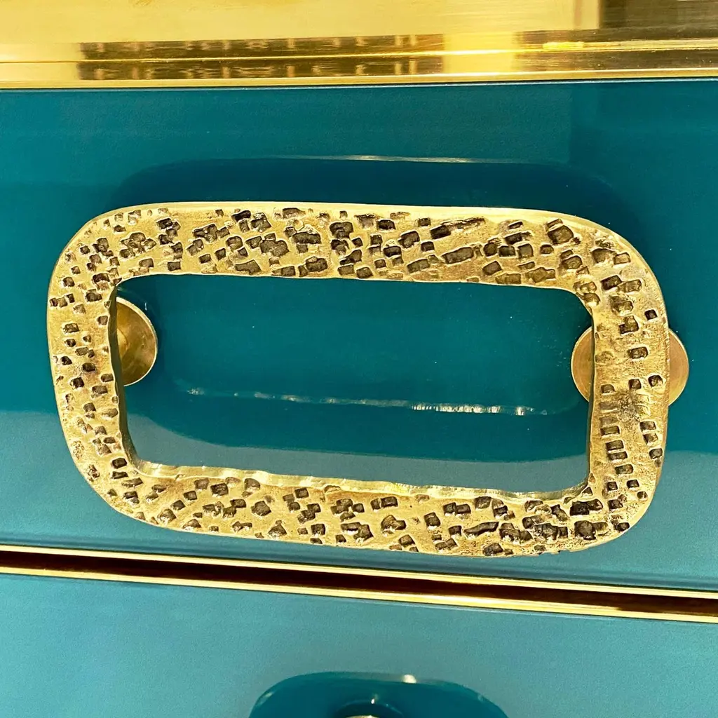 Let's bring inside some shimmering elegance! What is special about this piece, it's not only the functionality with 3 drawers and 3 doors (options for sizes) but the artistic impact with metallic hues (very difficult to photograph as they change from blue to aqua green) and the exceptional cast hardware, the choice of colors is yours! as this is a piece entirely customizable.This particular wardrobe / chest with Art Deco streamline design, entirely handcrafted in Italy, is clad in aquamarine metallic blue, green glass, decorated on the front with geometric artistic handles in cast textured brass. Attention to details with the interior veneered in walnut, the whole body exquisitely edged with marked corners and profiles in brass as well as the drawers all around and raised on a recessed plinth finished in brass.