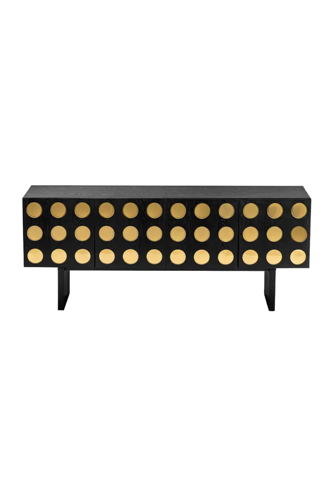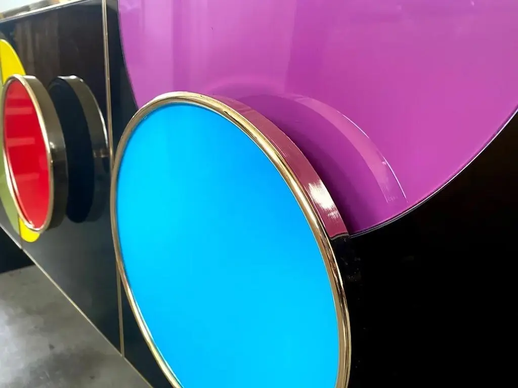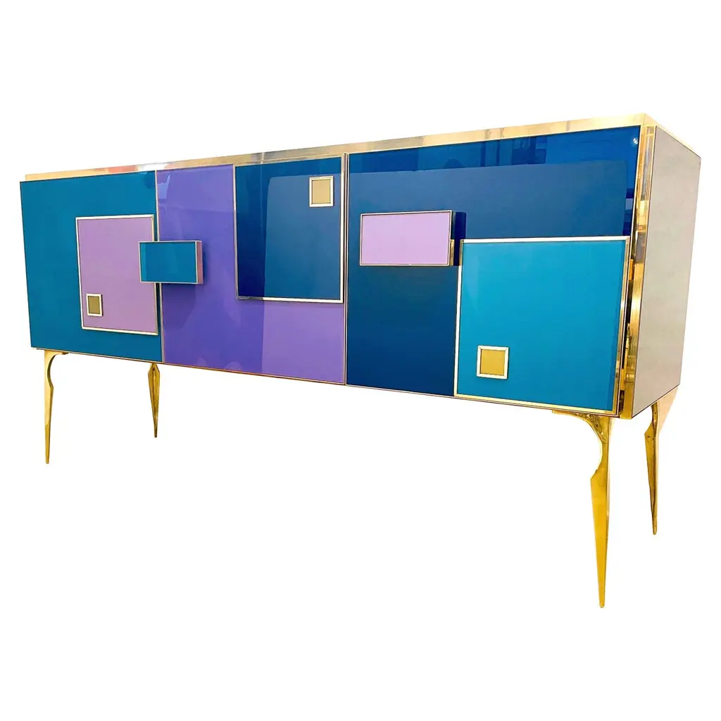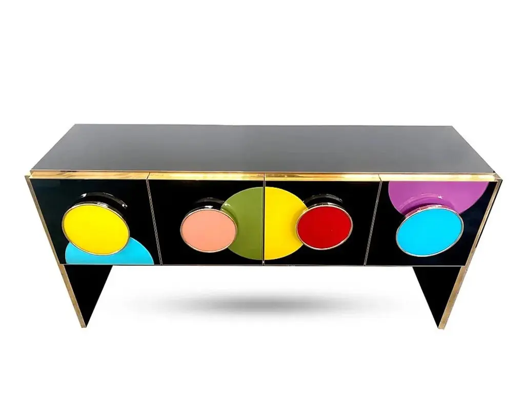 Add fun to your interior and color statement! Contemporary Bespoke customizable 4-door modern console/sideboard, entirely handcrafted in Italy with art glass hand painted on the reverse, with a Minimalist Art Deco Design shape. This piece, raised on continuous straight sides that serve as legs, has a dramatic black glass surround and is decorated on the front and sides with a 1960s Mid-Century Modern pattern, composed of half and full circles in different colors: yellow, aquamarine, turquoise, coral pink, green. Four full circles on the front are raised to also serve as handles, a very functional clever design. High quality of execution with great attention to detail with the whole body, doors, and handles exquisitely edged with brass profiles.It also can be displayed in a central position as it is entirely finished at the back in black.A versatile and functional design that can be personalized in glass colors, finishes, and sizes, as different types of furniture, armoires, nightstands, etc.