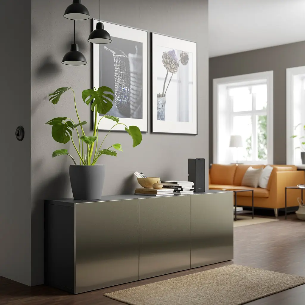 BESTÅ Storage combination with doors - black-brown/Riksviken light bronze effect 70 7/8x16 1/2x25 5/8 ". RIKSVIKEN front has a subtle sheen that adds depth and luster to your home. Adjustable hinges allow you to adjust the door horizontally and vertically. Knobs and handles are sold separately.