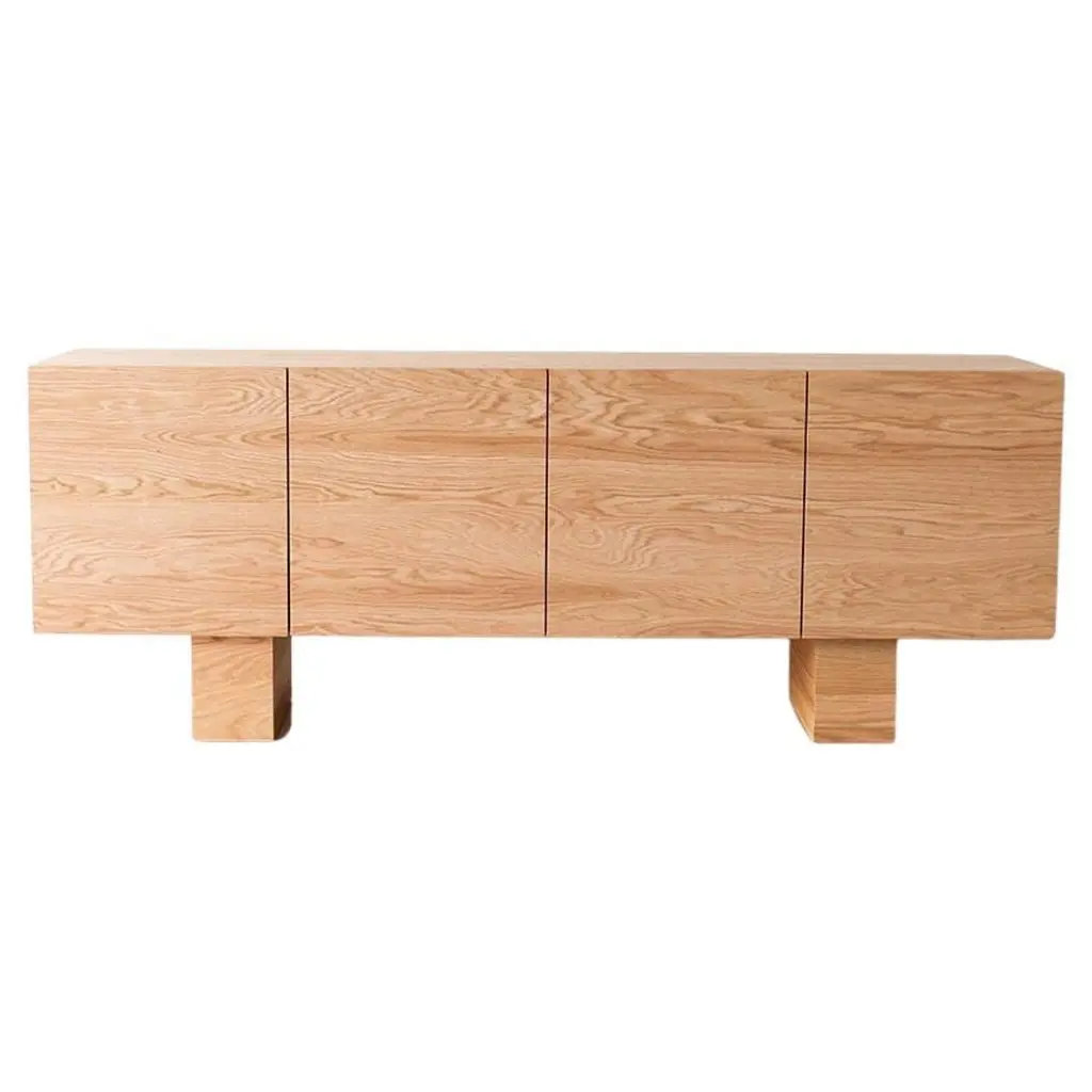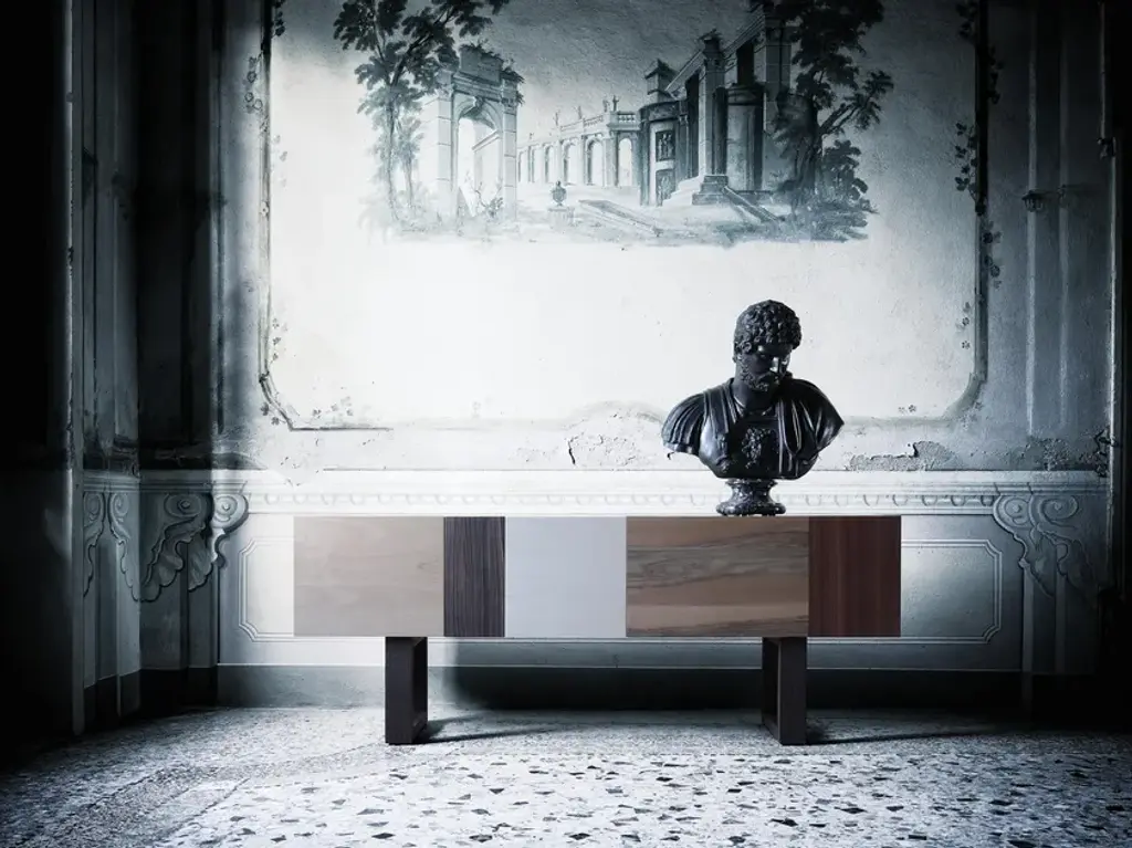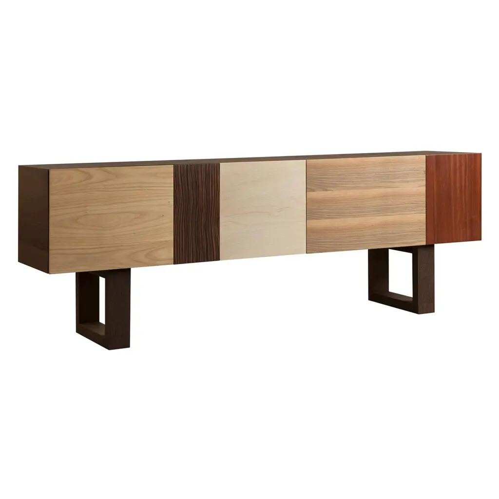 Big John is a sideboard with frame and feet made of ash wood. 3 drawers and 2 doors veneered with different wood types : ebony Makassar, walnut, maple, cherry, padouk.