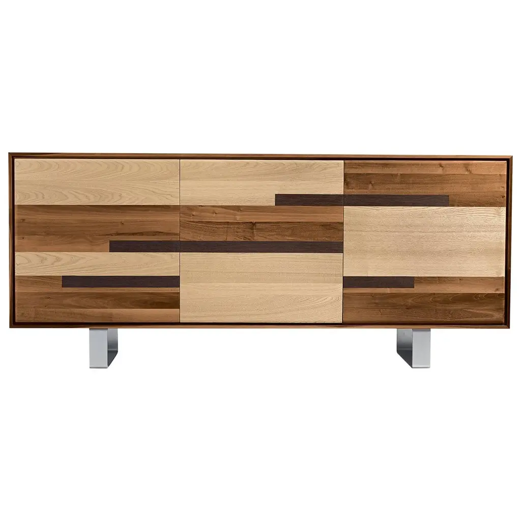 This unique sideboard, that can also be a colorful media stand, was designed by Maurizio Durandi and is part of the Patchwork collection, featuring furniture pieces embellished with doors and drawers (in this case two doors and three drawers) made of different woods. The contemporary use of colors and shapes is strictly connected with the tradition of artisanal cabinet making that makes this piece, as any Morelato piece, a timeless work of art.