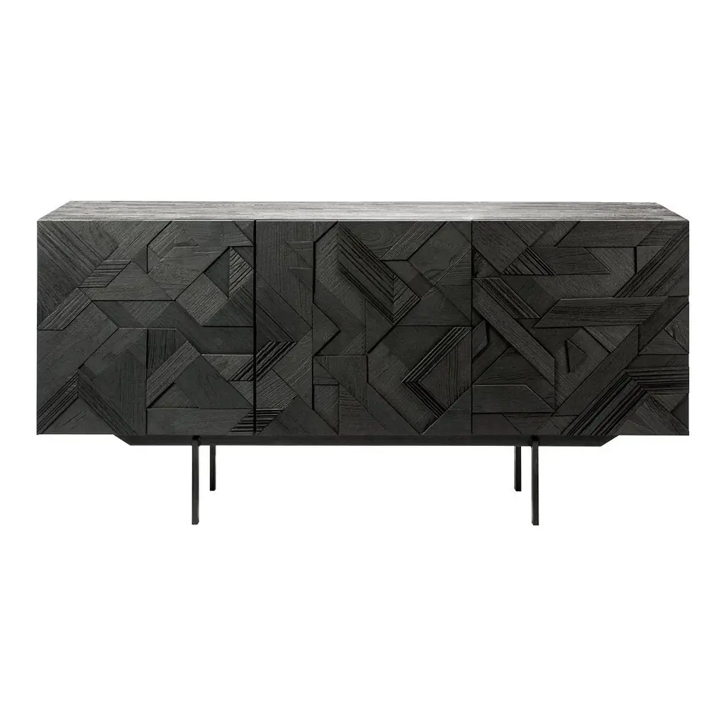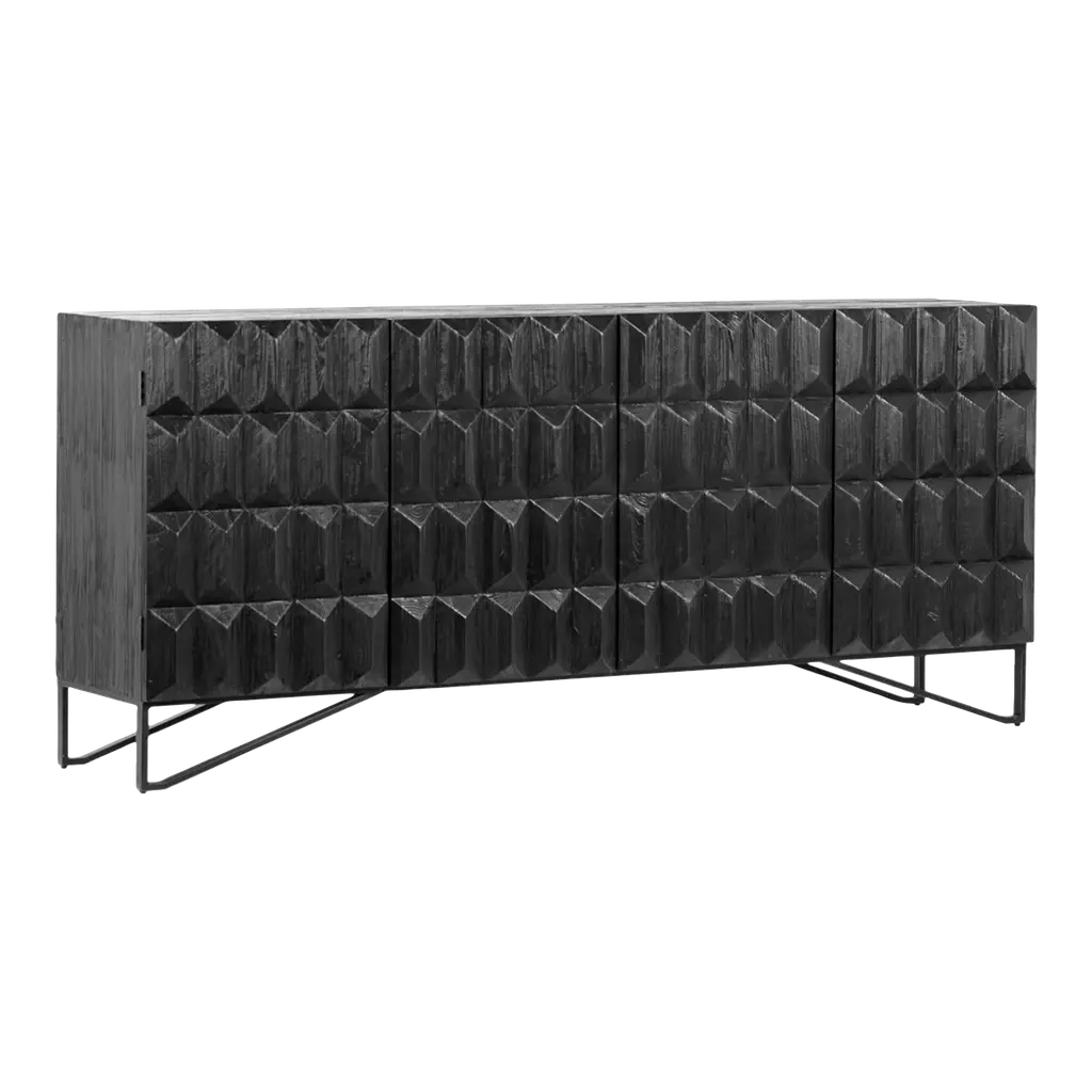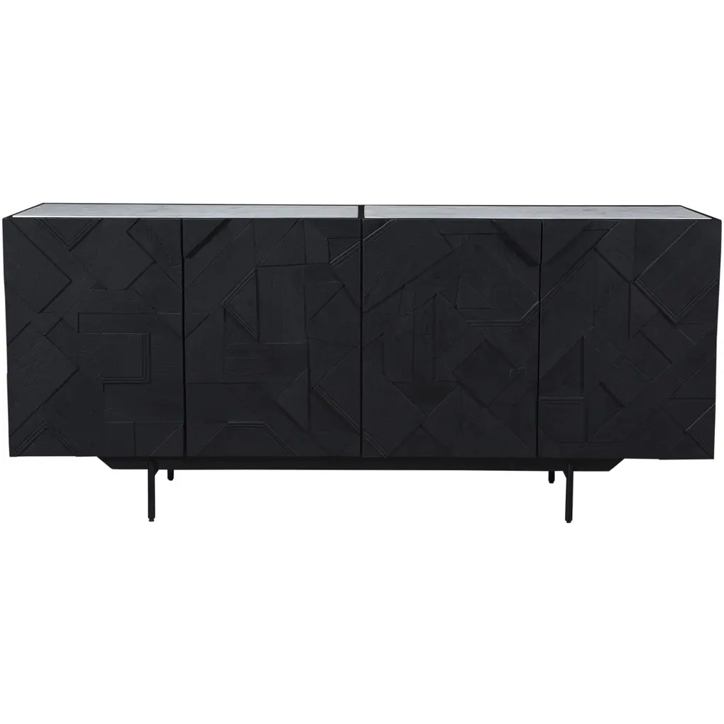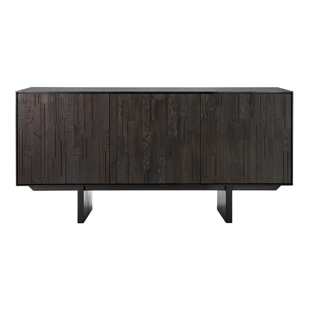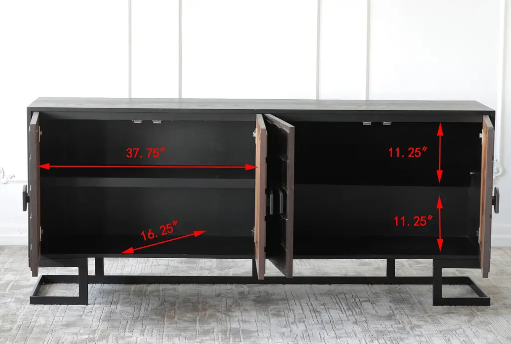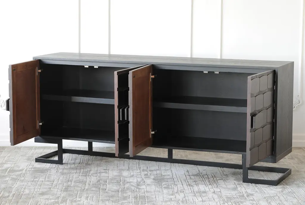 Enhance your living space with the Black + Brown 4 Door Sideboard, a perfect blend of modern and rustic styles. This sideboard features a dark brown and black color palette with gunmetal accents, adding a touch of sophistication to any room. Crafted from solid ash and ash veneer, it offers both durability and elegance, while the iron elements provide a sturdy foundation.