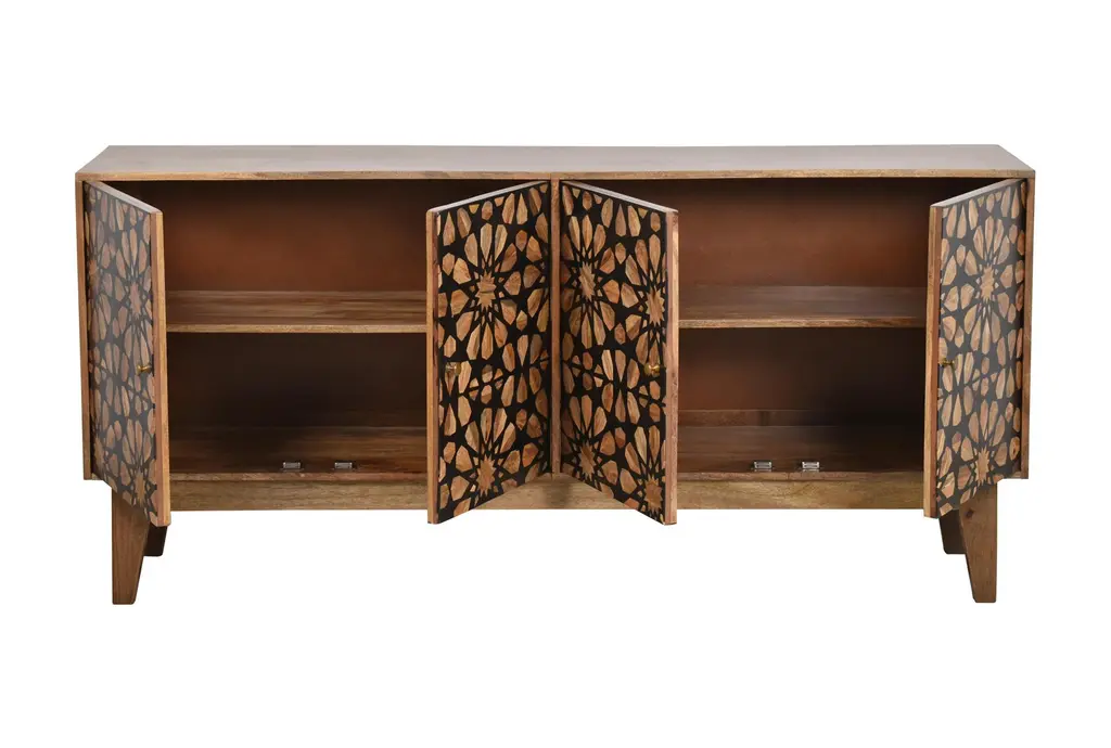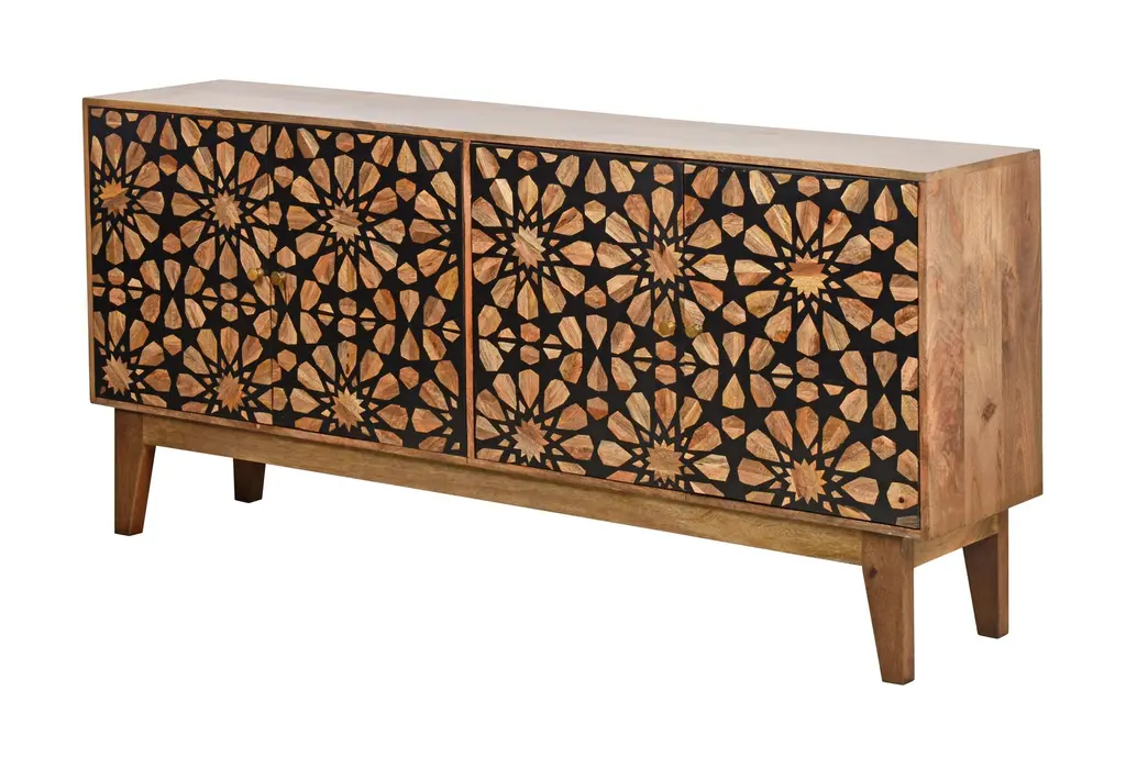 This contemporary/modern Black + Natural Carved Mango Wood Sideboard is a stunning addition to any home decor, boasting a beautiful beige color and crafted from durable wood. Its sleek design and intricate carving detail make it a stylish and functional piece for any room.
