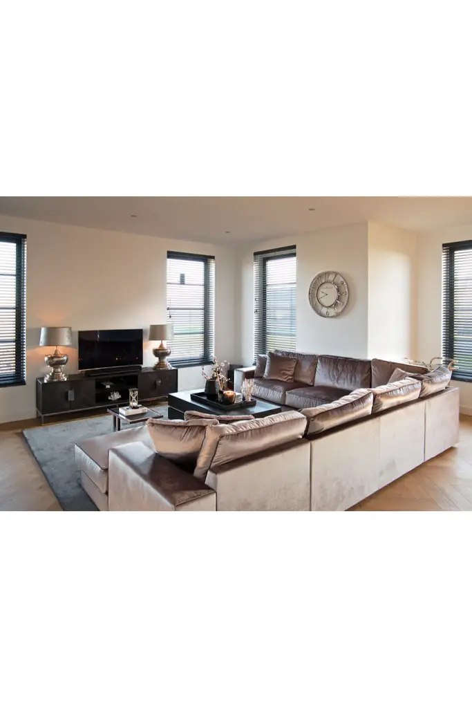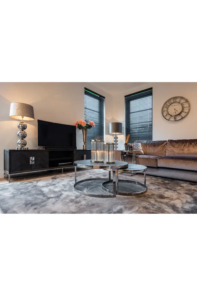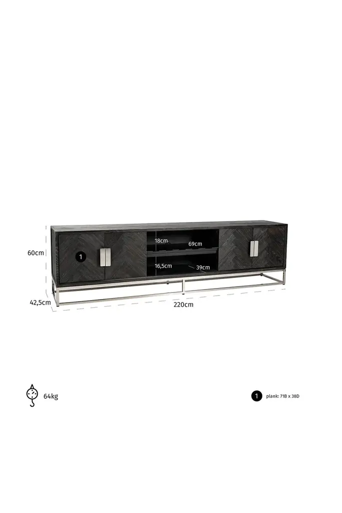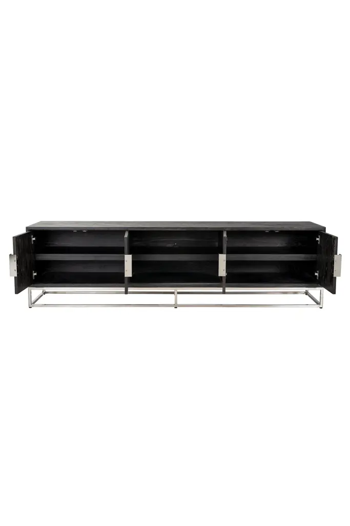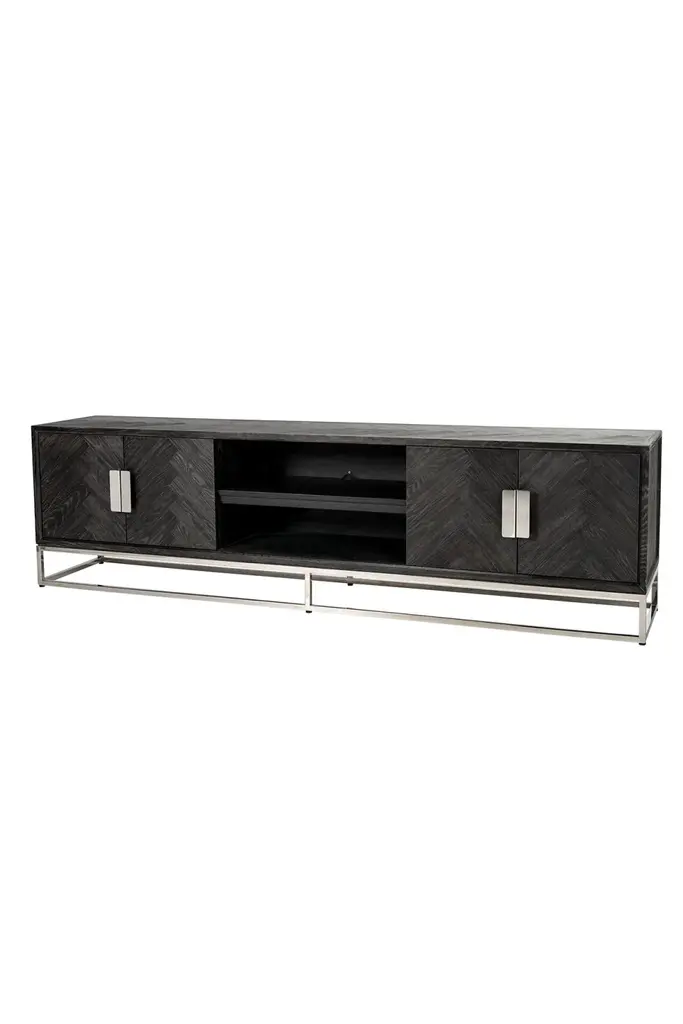 TV sideboard 220 Blackbone silver 4-doors is made of oak and stainless steel. The black TV sideboard from the Blackbone collection gives your interior an elegant, yet sturdy touch. Also available in 185 cm or with gold.