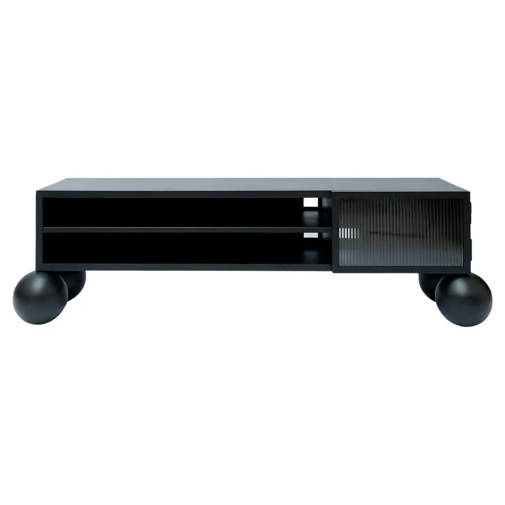 The GRIESEL sideboard by THALLORIS is a premium handmade black oak lowboard designed for modern living rooms, media spaces, and luxury interiors. Part of the exclusive GRIESEL collection, this elegant piece combines mid-century modern aesthetics with refined craftsmanship and functional elegance.The sideboard features three push-to-open doors, with the central door designed as a slatted front – ideal for media equipment, as it allows for natural ventilation. Behind each door, you’ll find a spacious compartment with an adjustable shelf, offering flexible storage for electronics, books, or decorative objects.For maximum convenience, a discreet cable hole is positioned behind the slatted door, allowing seamless cable routing and maintaining a clean, uncluttered appearance. The striking organic solid oak base, lacquered in deep black, complements the black oak veneer to create a sophisticated monochromatic look.Protected with a high-quality matte varnish, this sideboard ensures durability while highlighting the elegant texture of black oak. Handmade in Poland, the GRIESEL sideboard embodies the premium craftsmanship and attention to detail that define THALLORIS.Dimensions:-Width: 150 cm (59.1 in) / 180 cm (70.9 in)-Depth: 45 cm (17.7 in)-Height: 65 cm (25.6 in)Materials:-Structure: Blockboard overlaid with oak veneer lacquered black-Fronts: Solid oak and blockboard overlaid with oak veneer lacquered black, push-to-open-Base: Solid oak, lacquered black-Cable hole: Black aluminumFinish:-High-quality matte varnishProduction:-Made to order-Lead time: 9 weeks-Fully customizable in size, materials, and finishes upon requestHighlights:-Part of the exclusive GRIESEL collection by THALLORIS-Premium black oak sideboard with organic solid oak base-Three push-to-open doors, central slatted door for ventilation-Cable hole behind slatted door for easy cable management-Ideal as a luxury TV stand, media console, or designer credenza-Spacious compartments with adjustable shelves-Elegant mid-century modern design in a monochromatic black finish-Handmade in Poland by THALLORIS