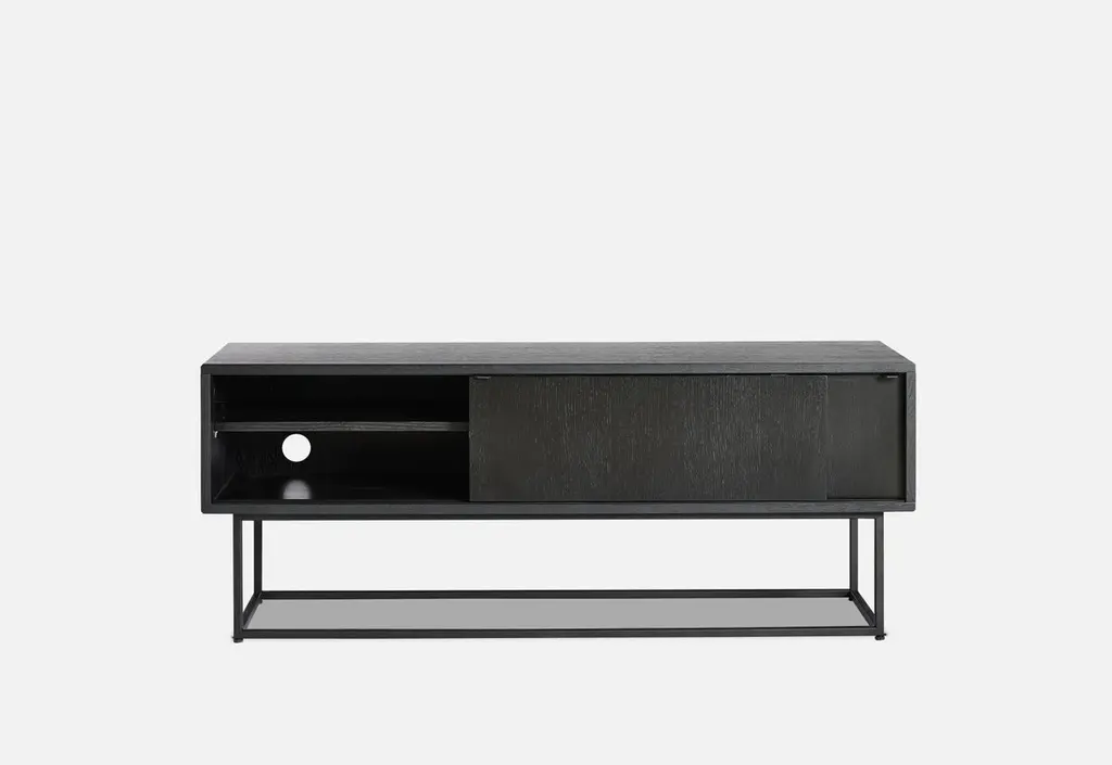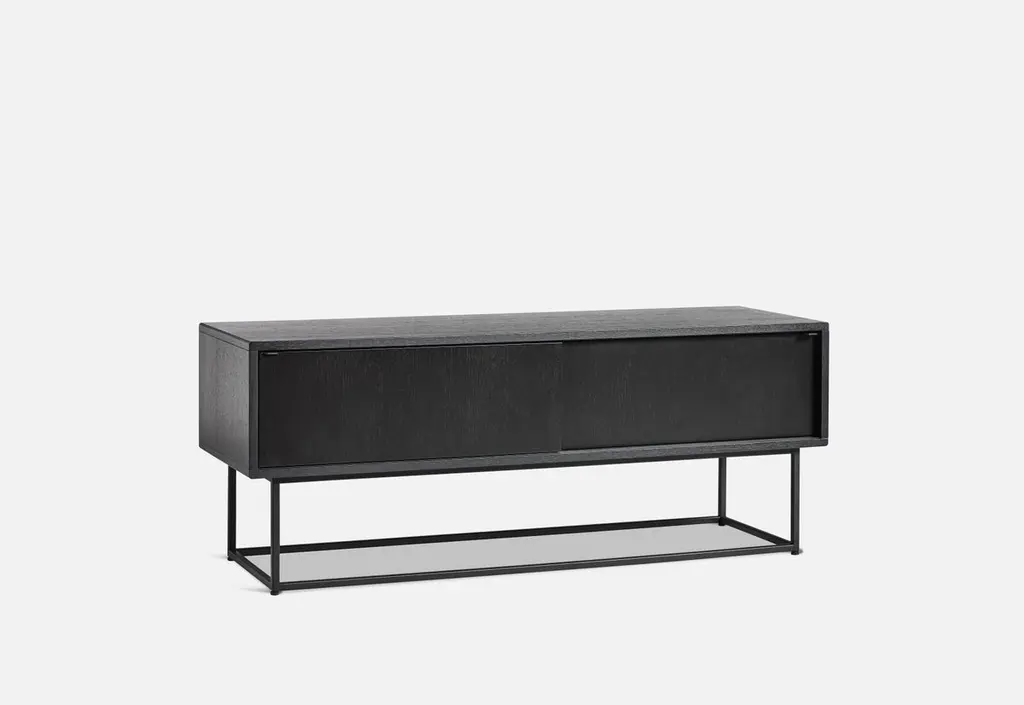 Black oak virka low sideboard by Ropke Design and Moaak.Materials: Oak, metal.Dimensions: D 40 x W 120 x H 47 cm.Also available in different colours and materials.The founders, Mia and Torben Koed, decided to put their 30 years of experience into a new project. It was time for a change and a new challenge. The challenge was to build an ambitious design brand from the ground up with high-quality materials and great attention to the little details. With a drive to create new originals, the WOUD collection is founded upon the idea to look ahead instead of looking back and share the love for honest design. Therefore, we are eager to discover and develop new ideas whether it being in form, function or choice of material. Mark Wedel & Rasmus Røpke are both Danish designers, having their own studios. Mark Wedel manages his own studio named MOAKK, and Rasmus Røpke runs his design office, Røpke Design. Together, the duo specialises in furniture design and combines their skills into functional and clean designs. Clean lines and functionality have always been drawing factors for the two designer friends, which also brought them together. The shared visual taste is complemented by their common aim to develop simple design that fulfils the consumer's needs - both functional and aesthetic.The stringent approach to design views in the Virka sideboard series. The horizontal lines and geometrical frame creates an elegant design and with sliding doors and an adjustable shelf with room to let cables pass through the holes in each backboard, the series beautifully combines simplicity and functionality.