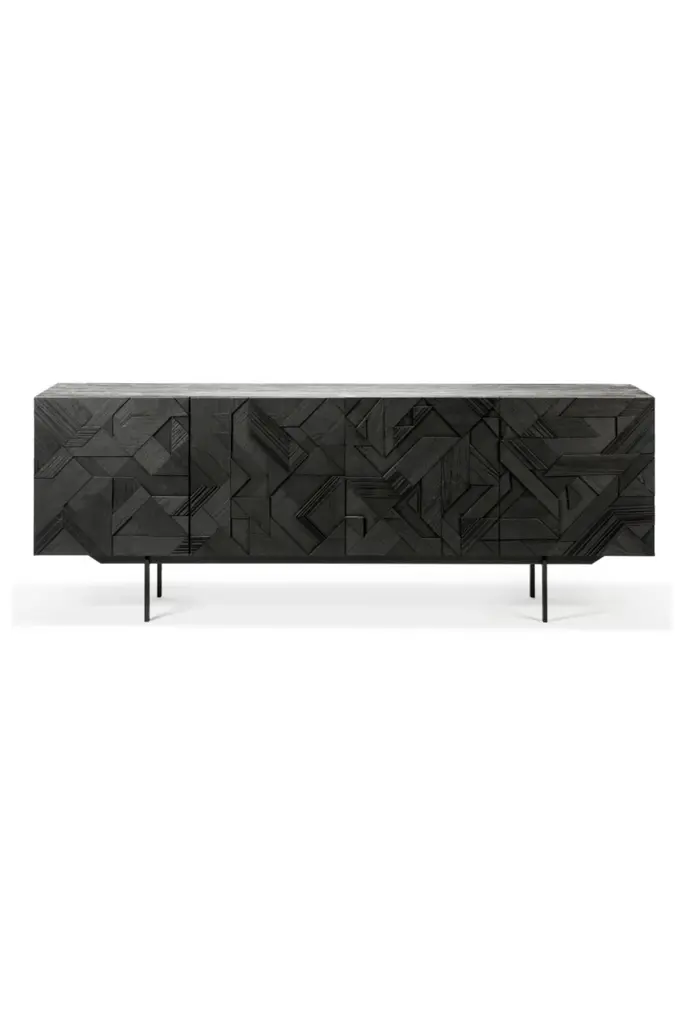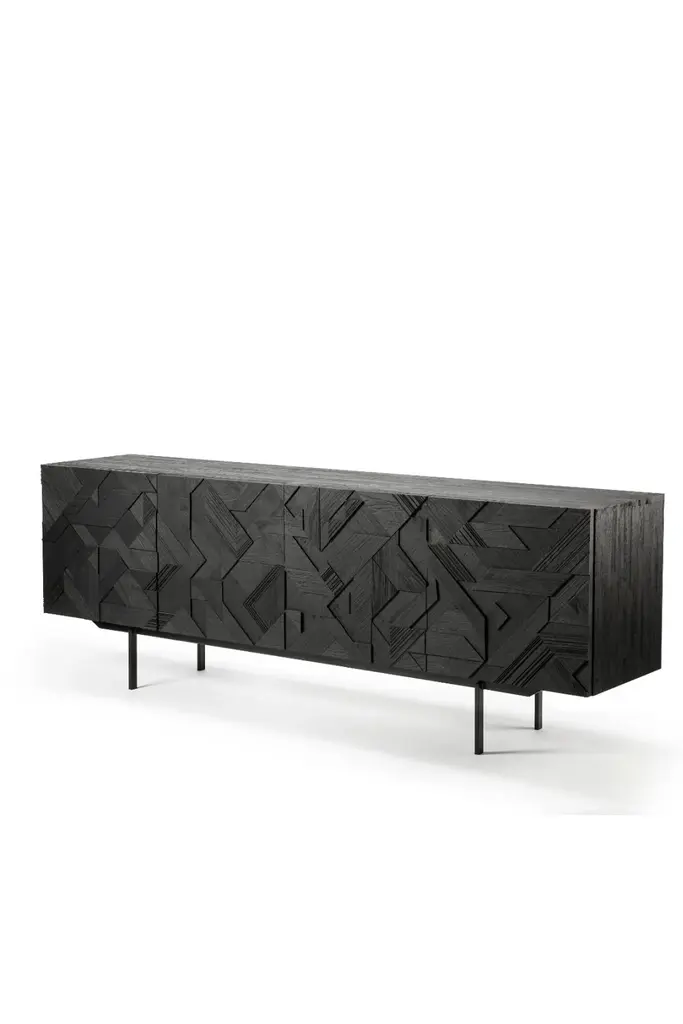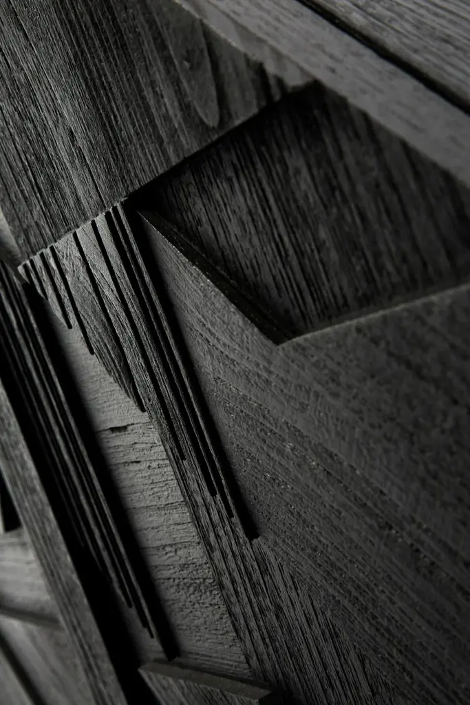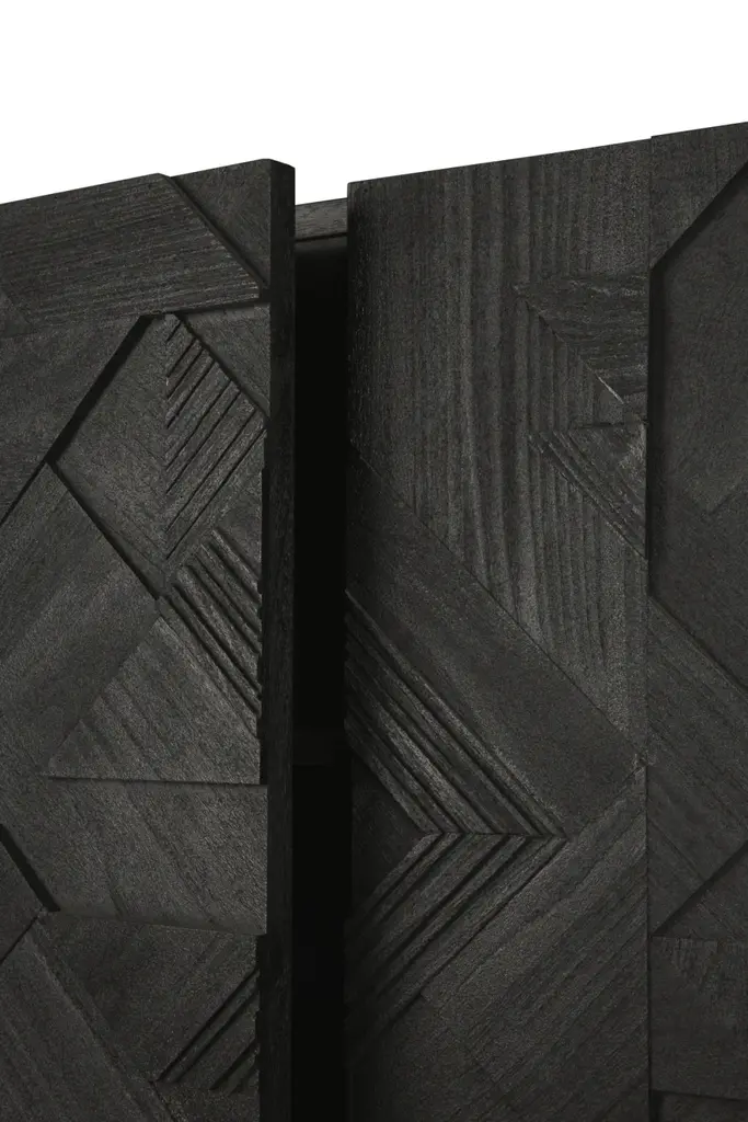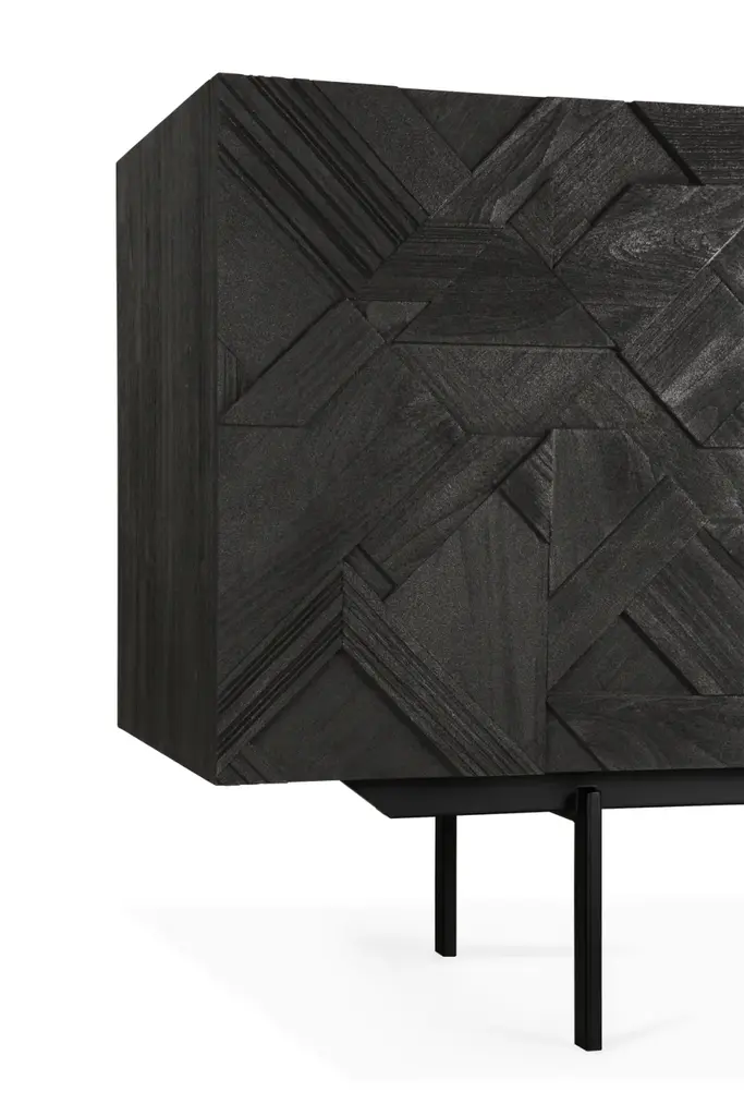 Indulge in the timeless beauty of Ethnicraft's Black Teak Sideboard - a masterpiece born from the creative mind of designer Alain van Havre. It features a combination of triangular shapes, artfully layered to form a visually enticing composition. Boasting a black-tainted solid teak material, this Graphic cupboard is equipped with two push open doors that reveal two drawers and three-layered shelf inside, providing ample storage space while maintaining a sleek and seamless facade.Download Technical Line DrawingDownload Care Instructions