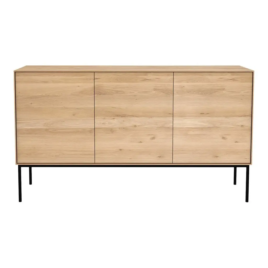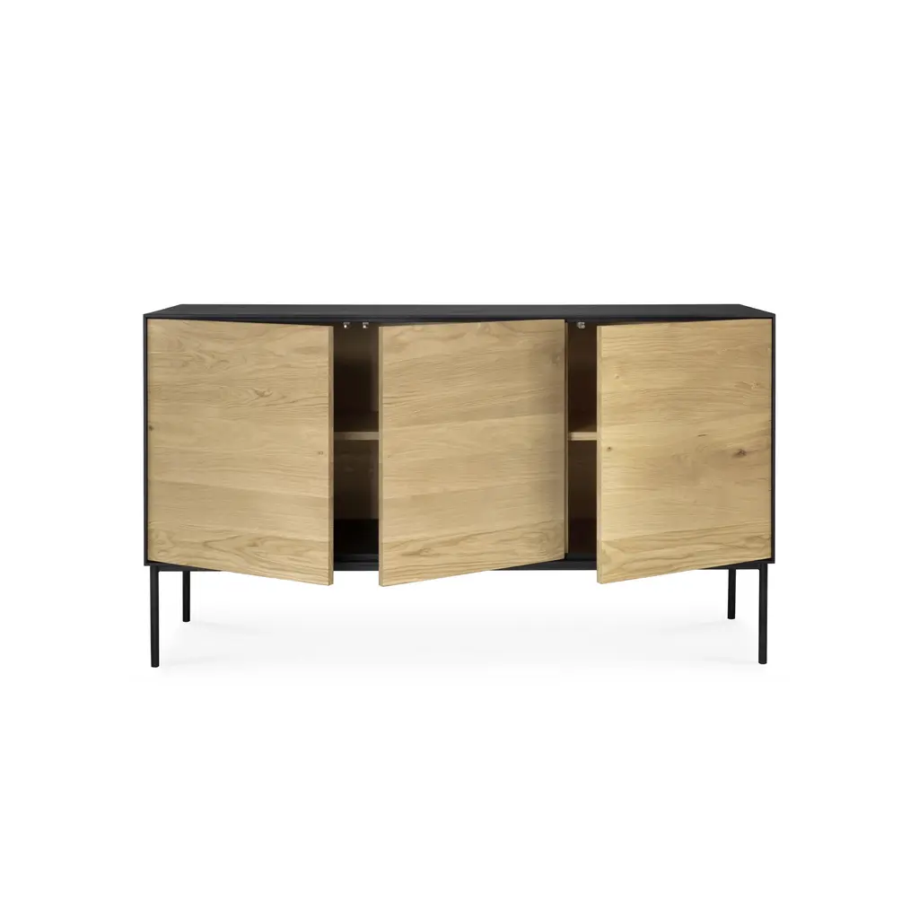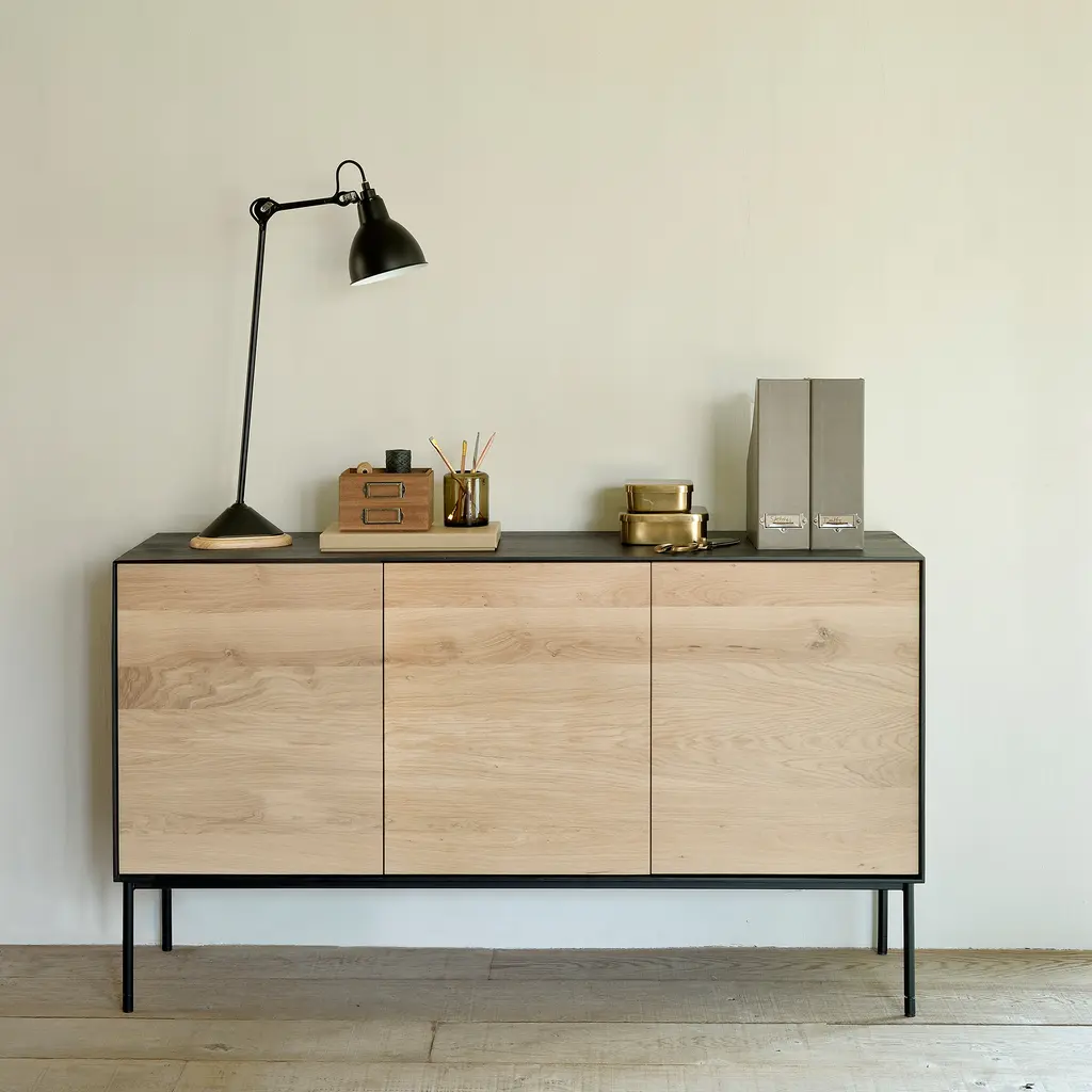 From living rooms to bedrooms and home offices, the Ethnicraft Blackbird Sideboard makes storage and de-cluttering look extra-refined. Part of the Blackbird range, the sideboard combines contrasting elements and colors in a striking yet versatile design. Spacious drawers and shelves maximize function, offering a convenient solution to organize a variety of items and keep your home tidy. As high-quality as it is practical, the Ethnicraft Blackbird Sideboard features a solid oak and metal build. A brushed finish highlights the wood grain on the two push open doors and three drawers, while a black coat of paint distinguishes the top and sides, matching the finish of the metal legs. Additionally, this sideboard comes with adjustable shelves and an anti-tipping mechanism.