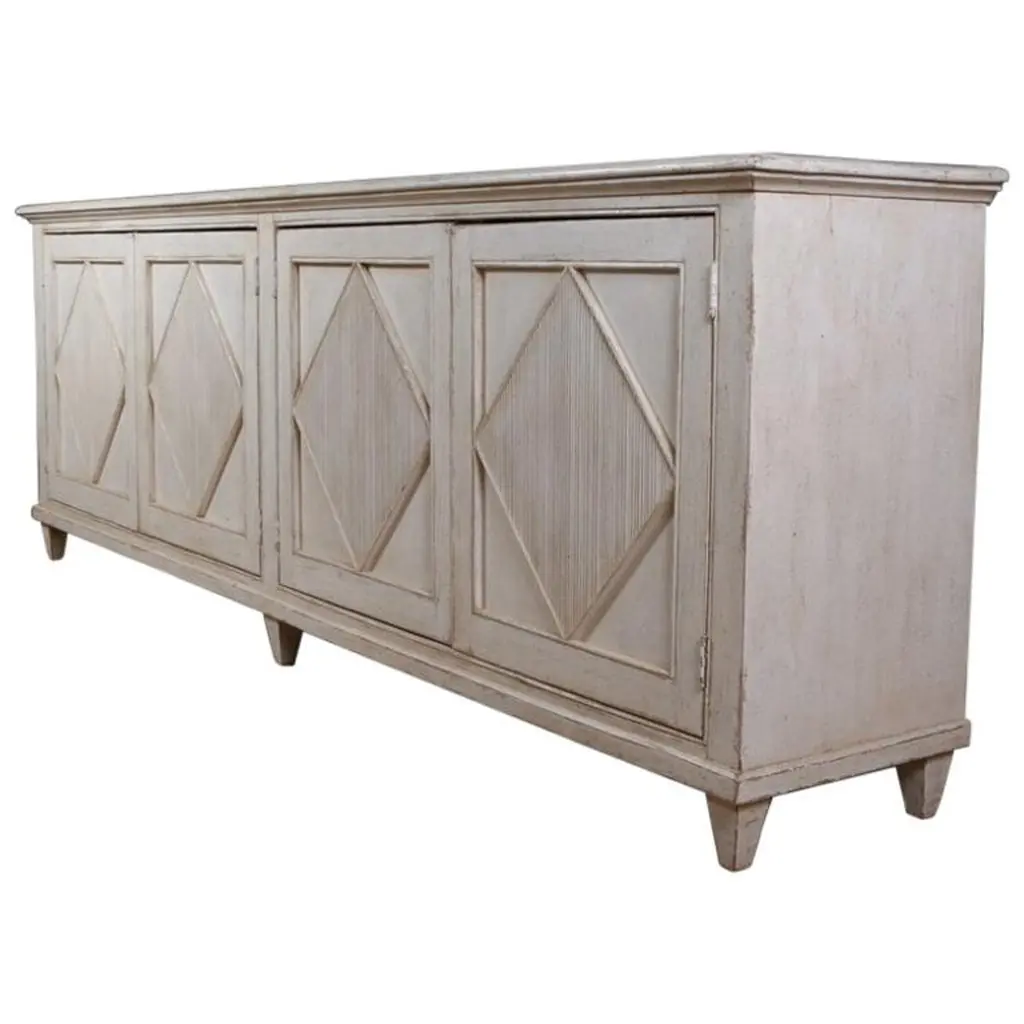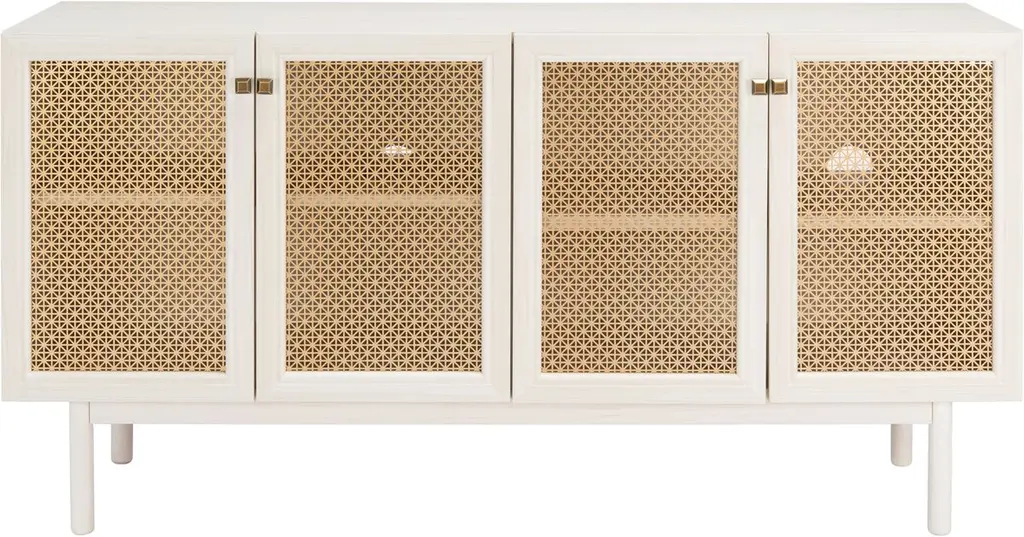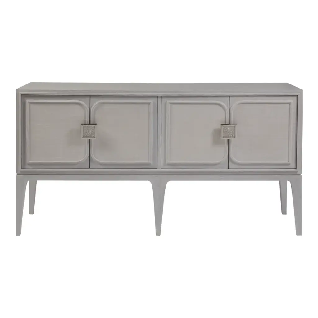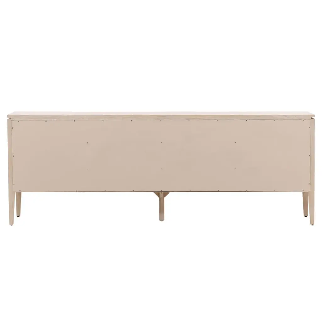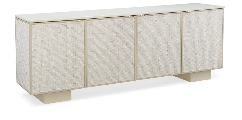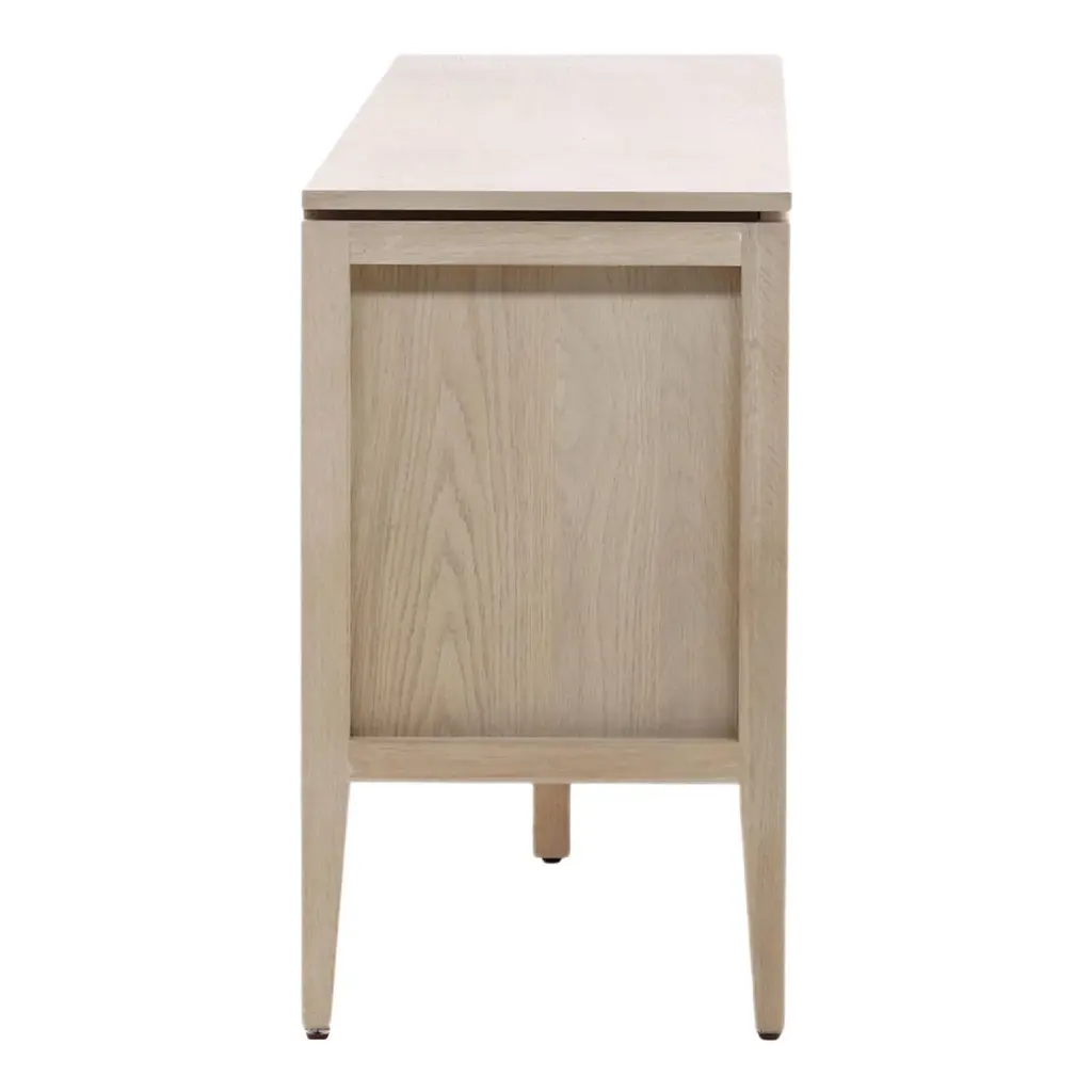 Charming contemporary light blond oak wood sideboard / buffet. Carved lattice pattern on four doors. Each will have slight variations of wood tones and natural grain. Weighs approx. 165 lbs.