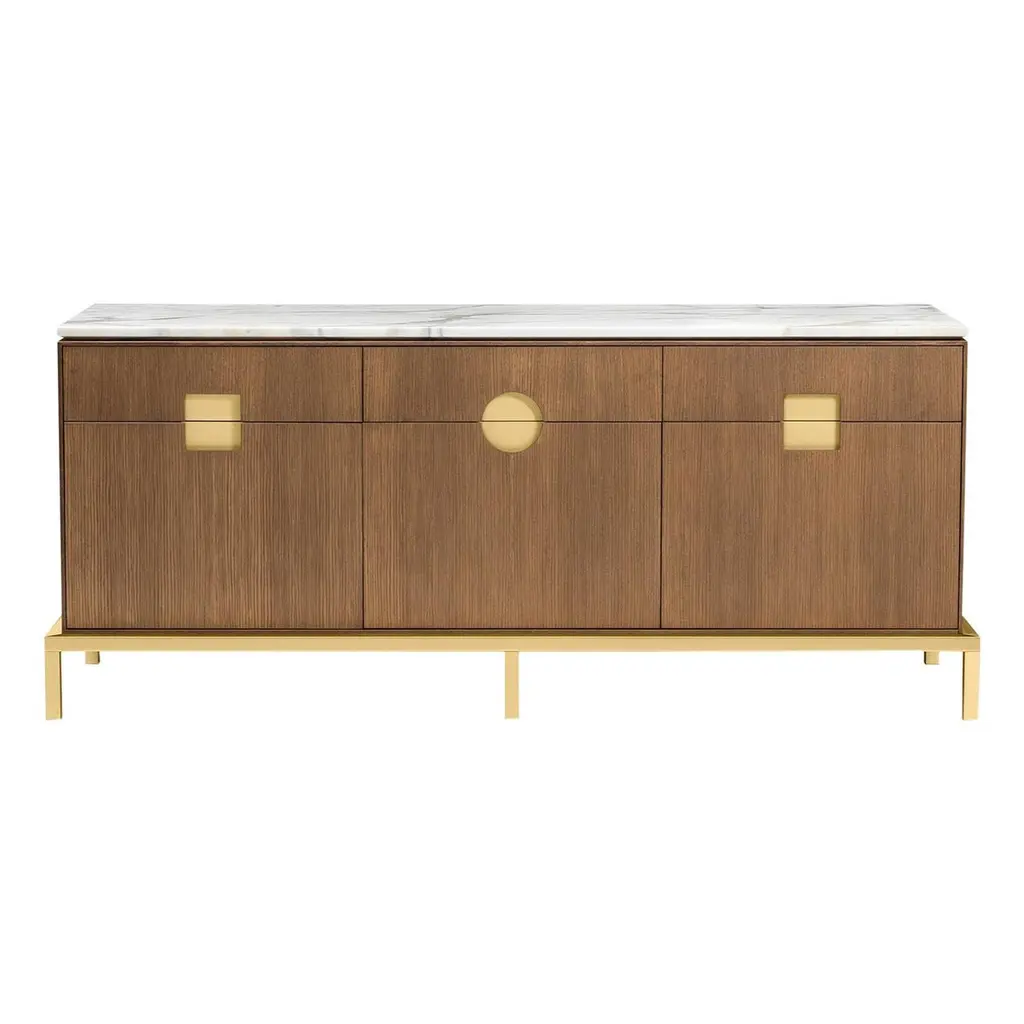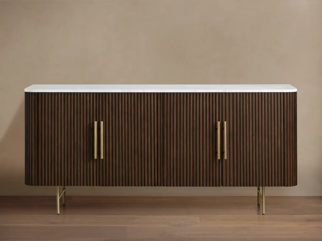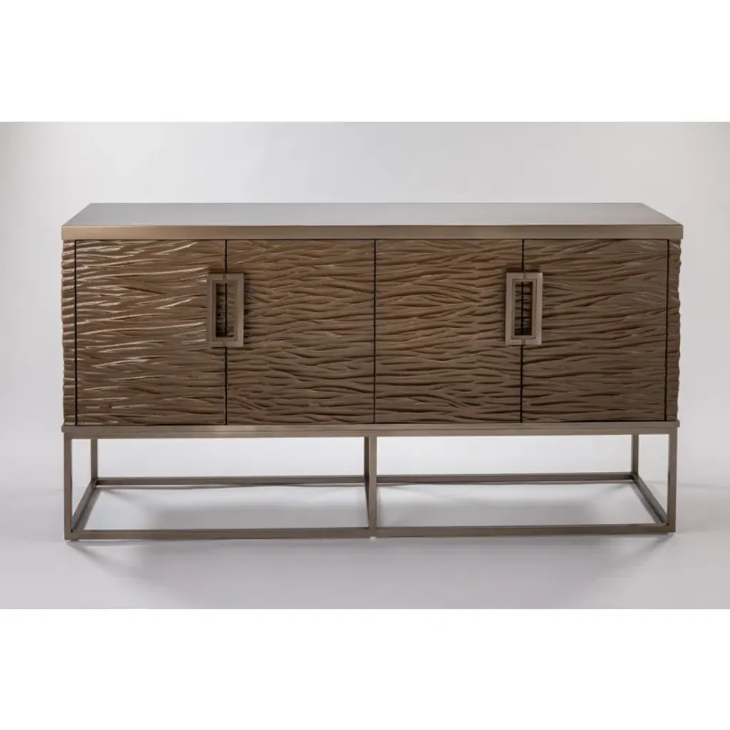 Store away dishes in chic contemporary style with the Bloom Credenza. Part of a small collection of living room furnishings inspired by flowers, the credenza is made of natural elements to complete its organic vibe. On a metal frame, the credenza features wooden doors, hiding away two shelves and two drawers for flawless organization.