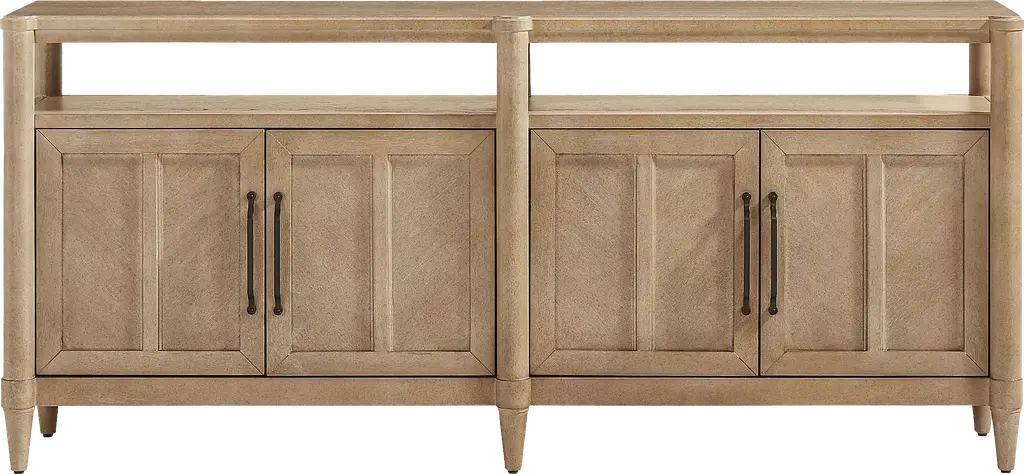 The Bluewell beige sideboard combines refined design with premium materials for a stylish and functional addition to your space. Made from durable rubberwood and white oak veneer, its textured raffia door panels are finished with a water-based coating in soft off-white and cream tones. Featuring four doors with European hinges and sleek metal handles, it opens to reveal two adjustable shelves with shelf pins for tailored storage. Cord management holes, floor levelers, and sturdy wooden legs complete its versatile design.