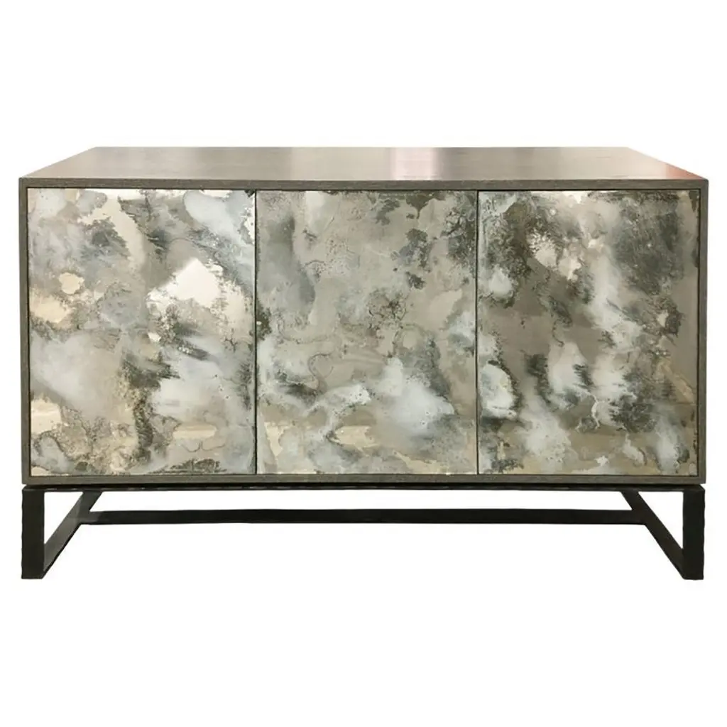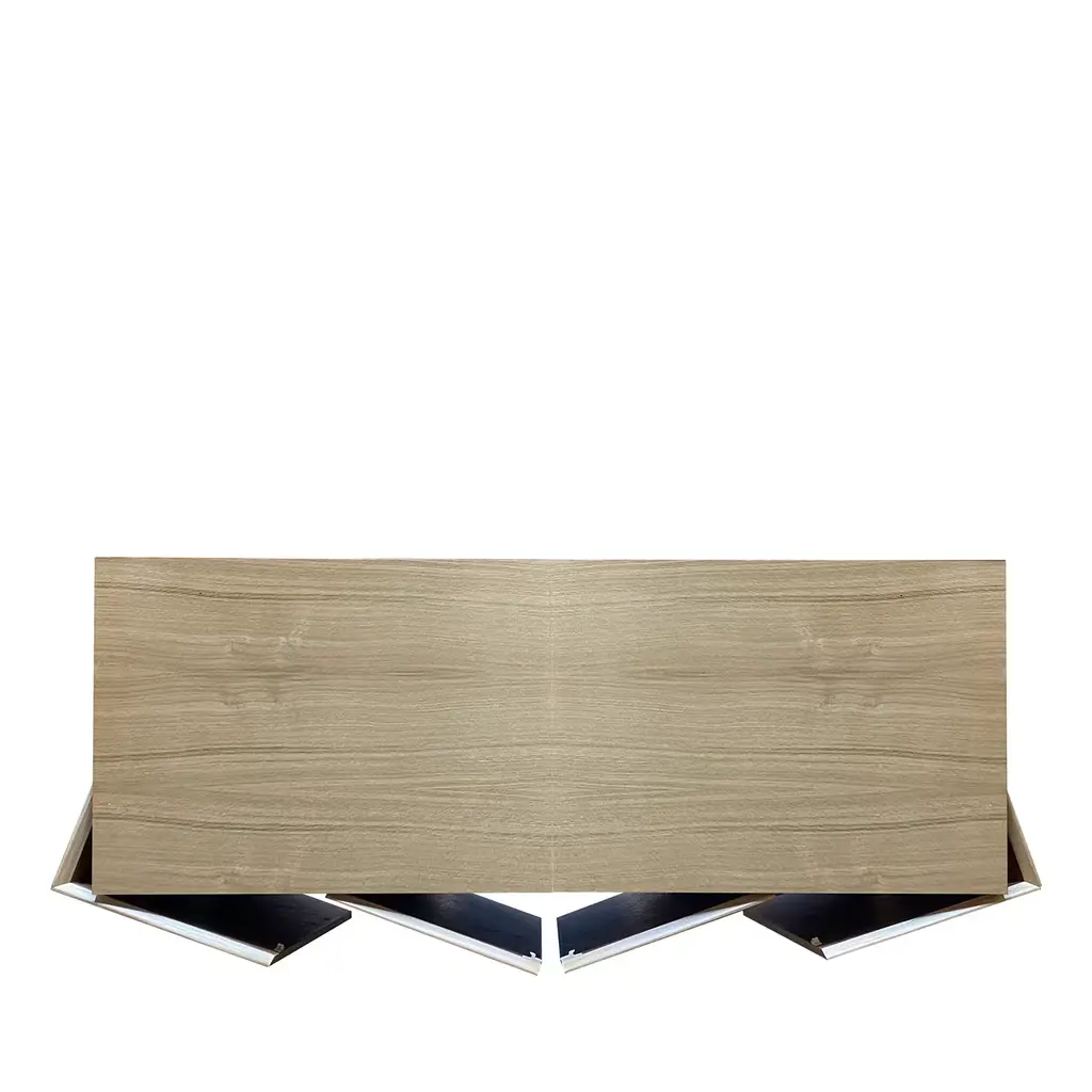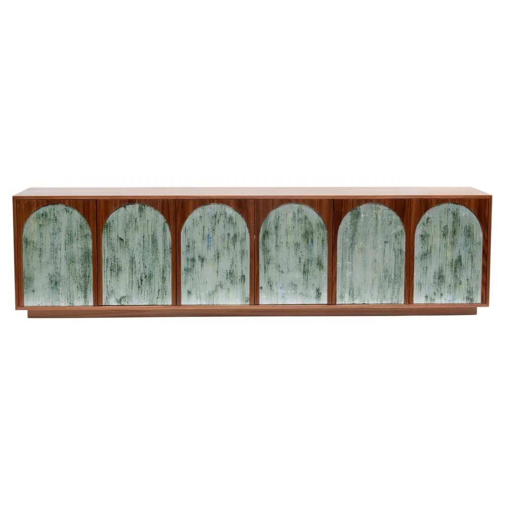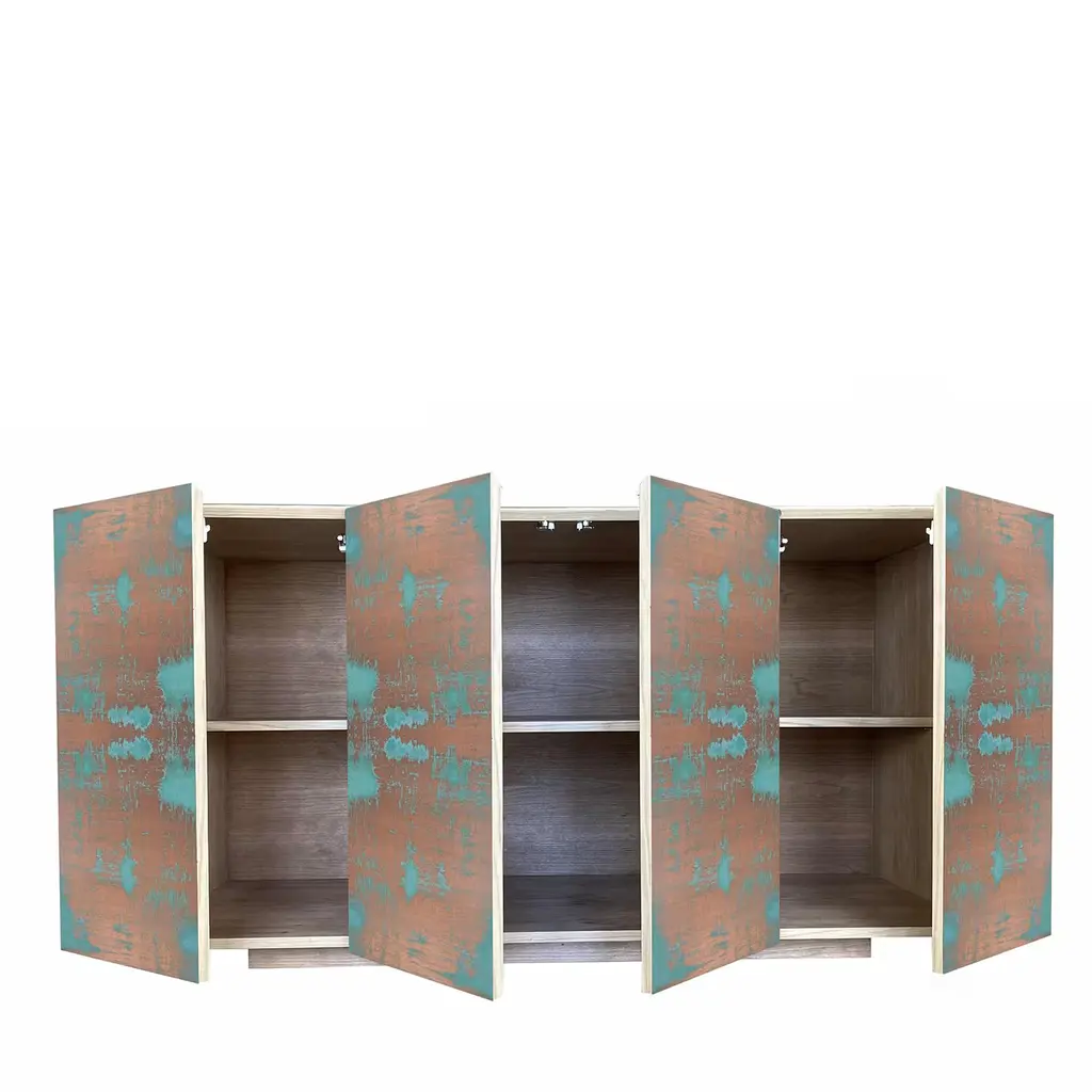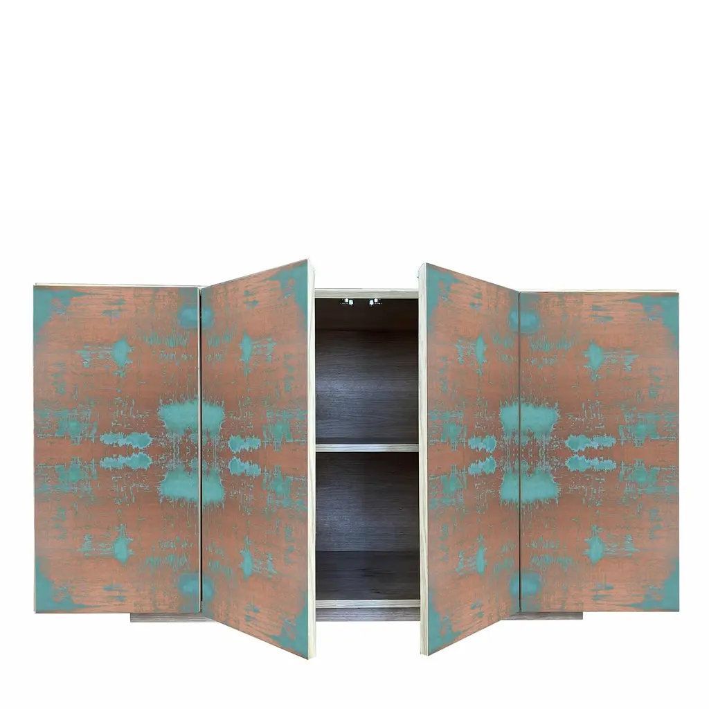 A stupefying scratched look that extends throughout the four doors and emphasizes the superb contrast between turquoise and soft brown marks this singular sideboard. Belonging to a collection chromatically inspired by the tones of the area around the Arno river's mouth - hence the name - it is fashioned of durmast and completed by three inner sheaves. Each piece is unique.