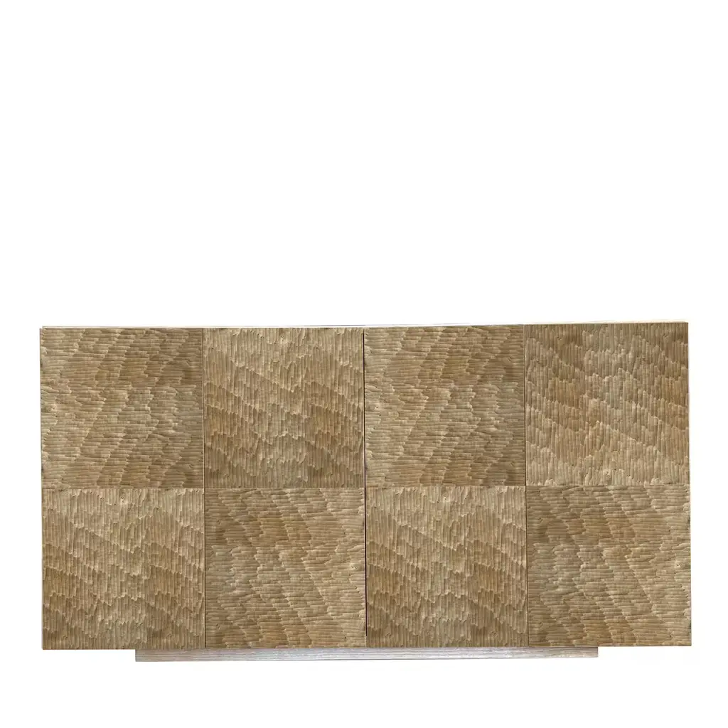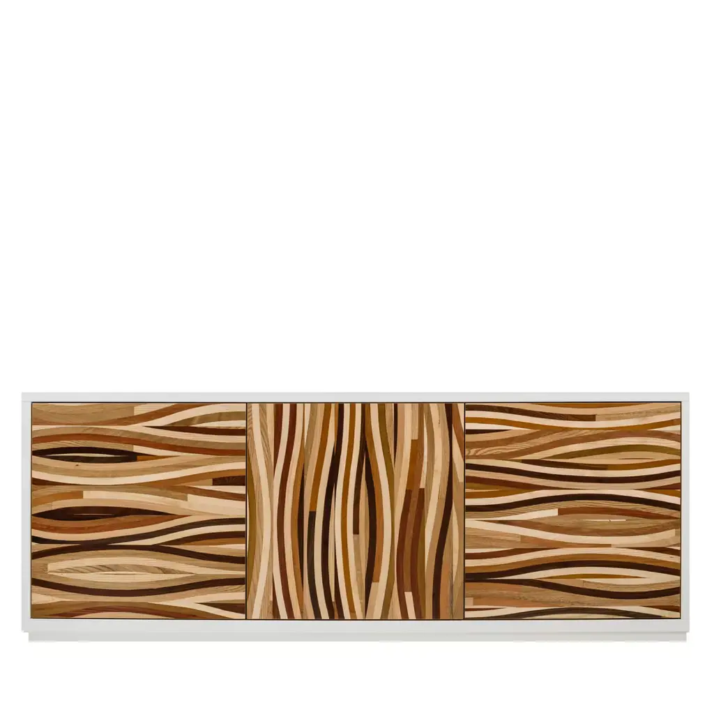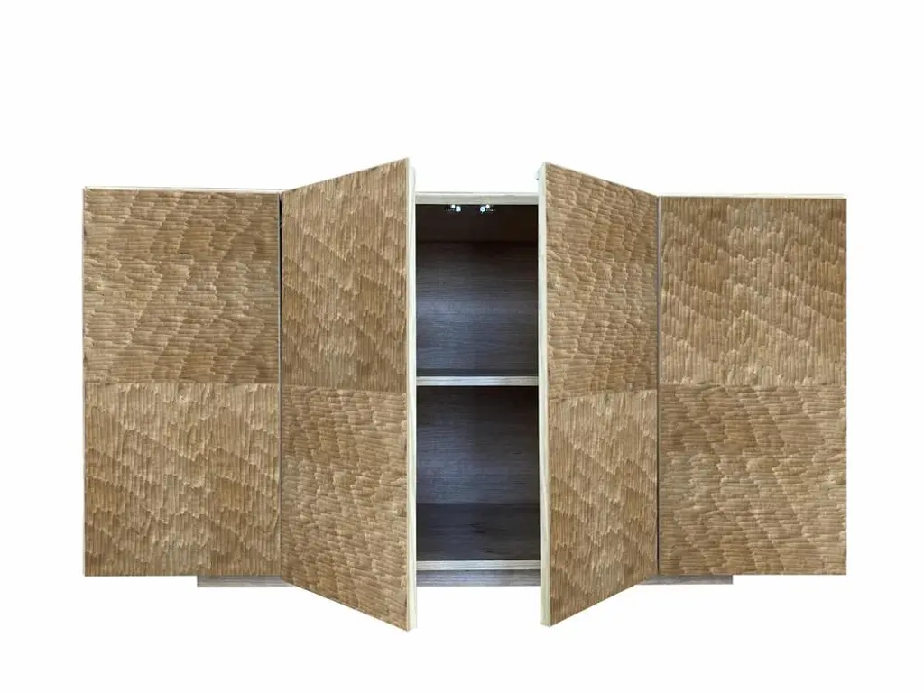 Boccadarno collection by Meccani Studio 2022. Boccadarno Sette, sideboard designed by Meccani Studio in 2022 for Meccani Design. It is part of a beautiful collection of nine sideboards all with oak structures and doors with various finishes inspired by the colors of the Tuscan Coast. In particular in Boccadarno, which is a magical place, where the Arno river meets the sea generating beautiful colors and atmospheres. The Collection is inspired by these natural colors. Boccadarno Sette, with oak structure and three internal shelves, has four hand-carved doors. Dimensions (cm): 145 x 55 x h 78. Signed by Maker,Labeled by Maker