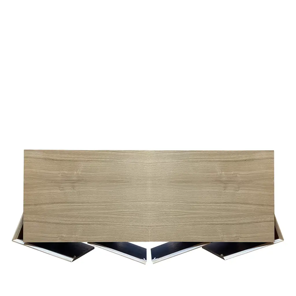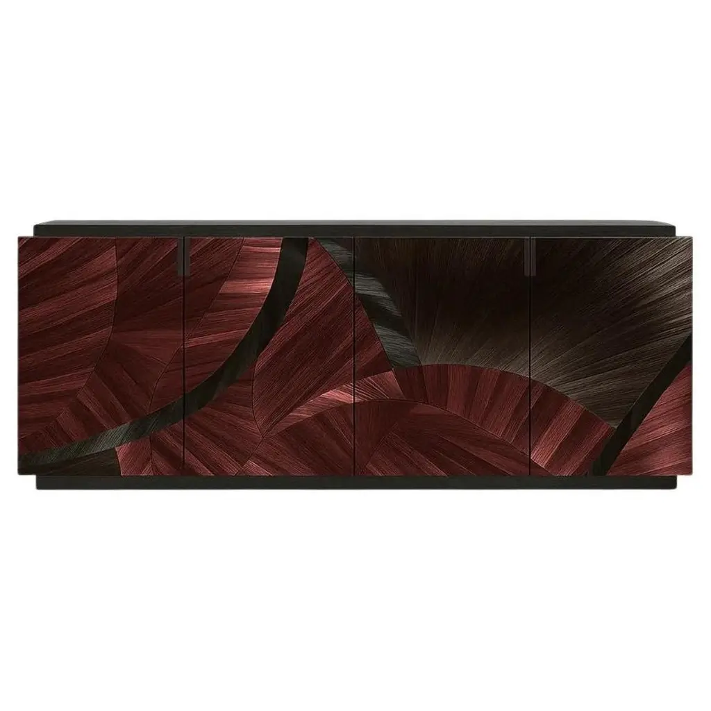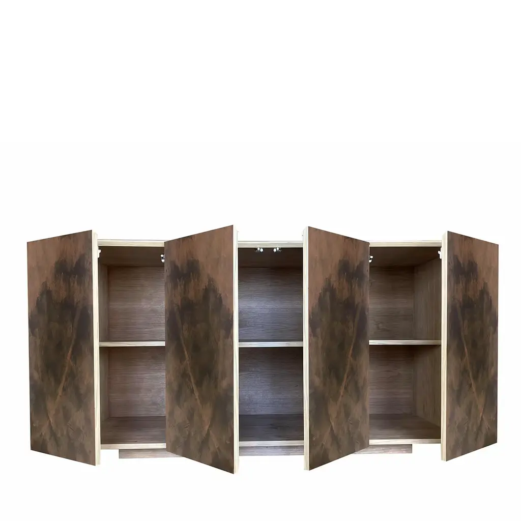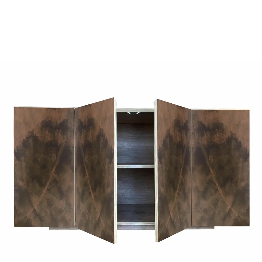 This superb sideboard by Meccani Studio is a singular design whose four doors' earthy-toned shaded pattern was inspired by the colors typical of the area around the Arno river's mouth - hence the name "boccadarno", the Italian crasis of "mouth of Arno". Sitting on a plinth base, the minimalist-cut durmast structure is equipped with three shelves. Each piece is handcrafted and unique.