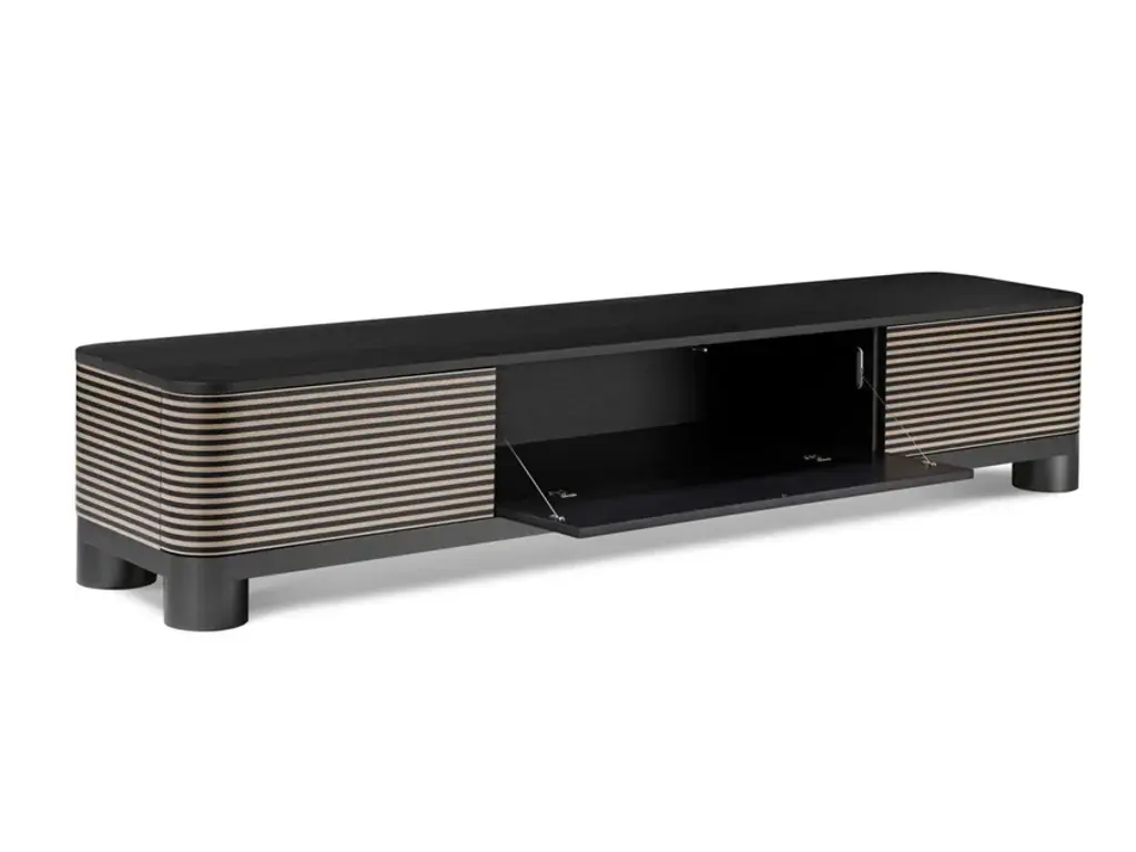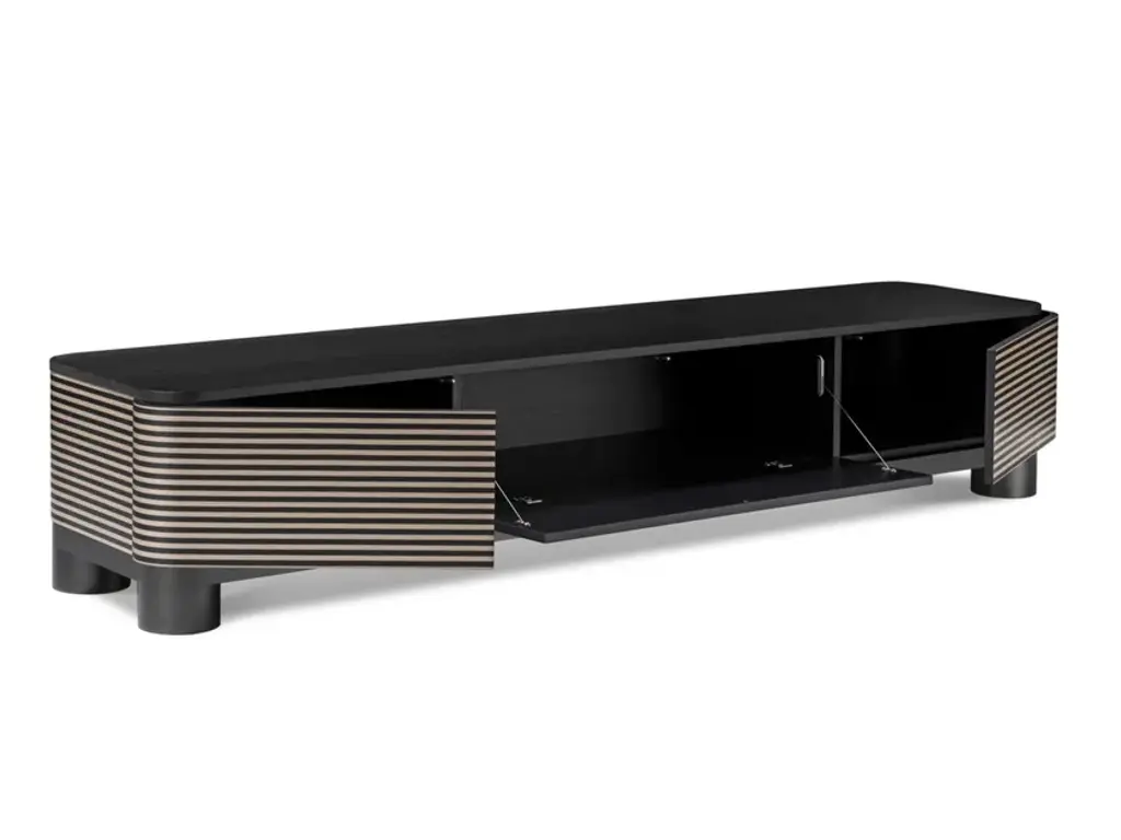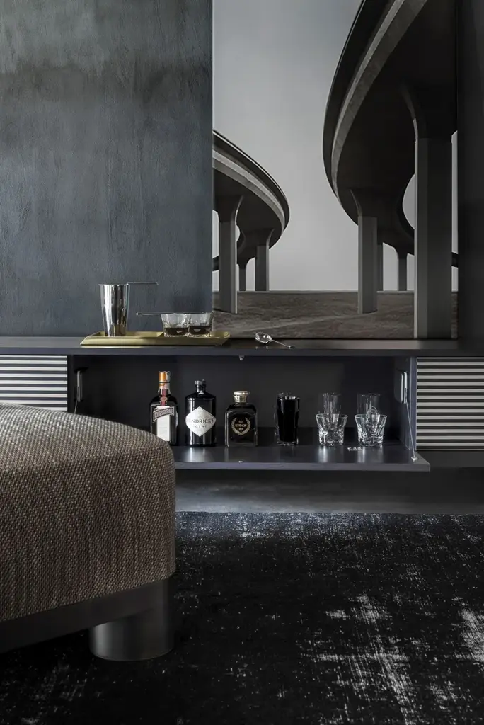 Bold is a sideboard in veneered wood with hinged doors and a flap door, part of the homonymous collection. Design Elisa Gargan Giovannoni. Available in 2 variants.Technical FeaturesStructure: Die casted aluminum on the angular elements and extruded aluminum for the supporting structure on the perimeter. Wood veneered container.Interior: Interior shelving and internal bases covered in natural leather.This family of products is characterised by the generous cylindrical foot that is connected to a structural band that delimits the perimeter of the objects that compose it.A metal ring that supports the seats, tables, sideboard and console units, and bookcases and that graphically encloses the material with which they are made, for example if the table top is made of marble the legs are made of turned marble, if the small armchair is upholstered in leather its legs are also made of leather of the same colour.With the solid dimensions and the softness of the joints, the materials are enhanced in their characteristics, creating a sculptural effect and giving original personality to each element of the collection.