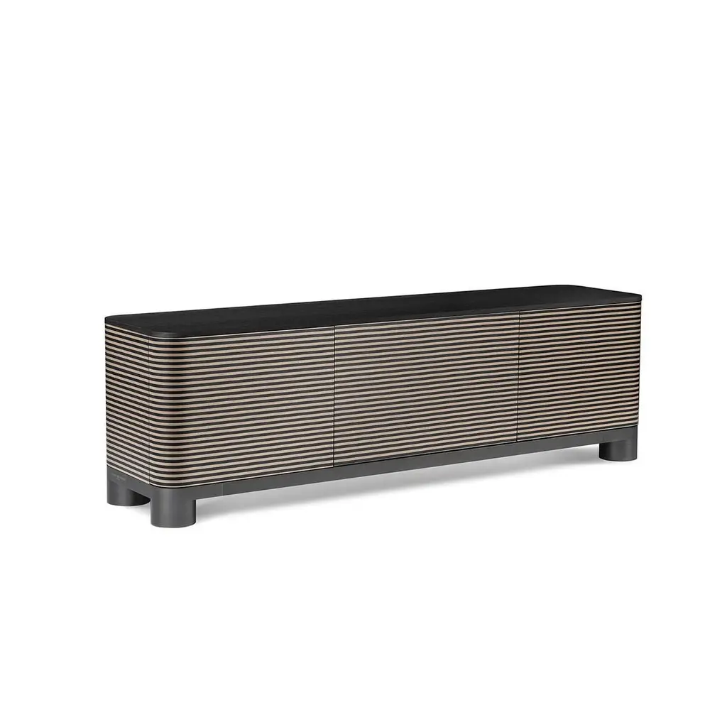 Showcasing a harmonious combination of classic and modern lines, this sideboard will effortlessly complement any dining space with timeless sophistication. Boasting a classic rectangular structure with three doors, it rests on black-hued, satin-finished brass feet and features a striped beige-and-black profile that complements the dark wooden top.