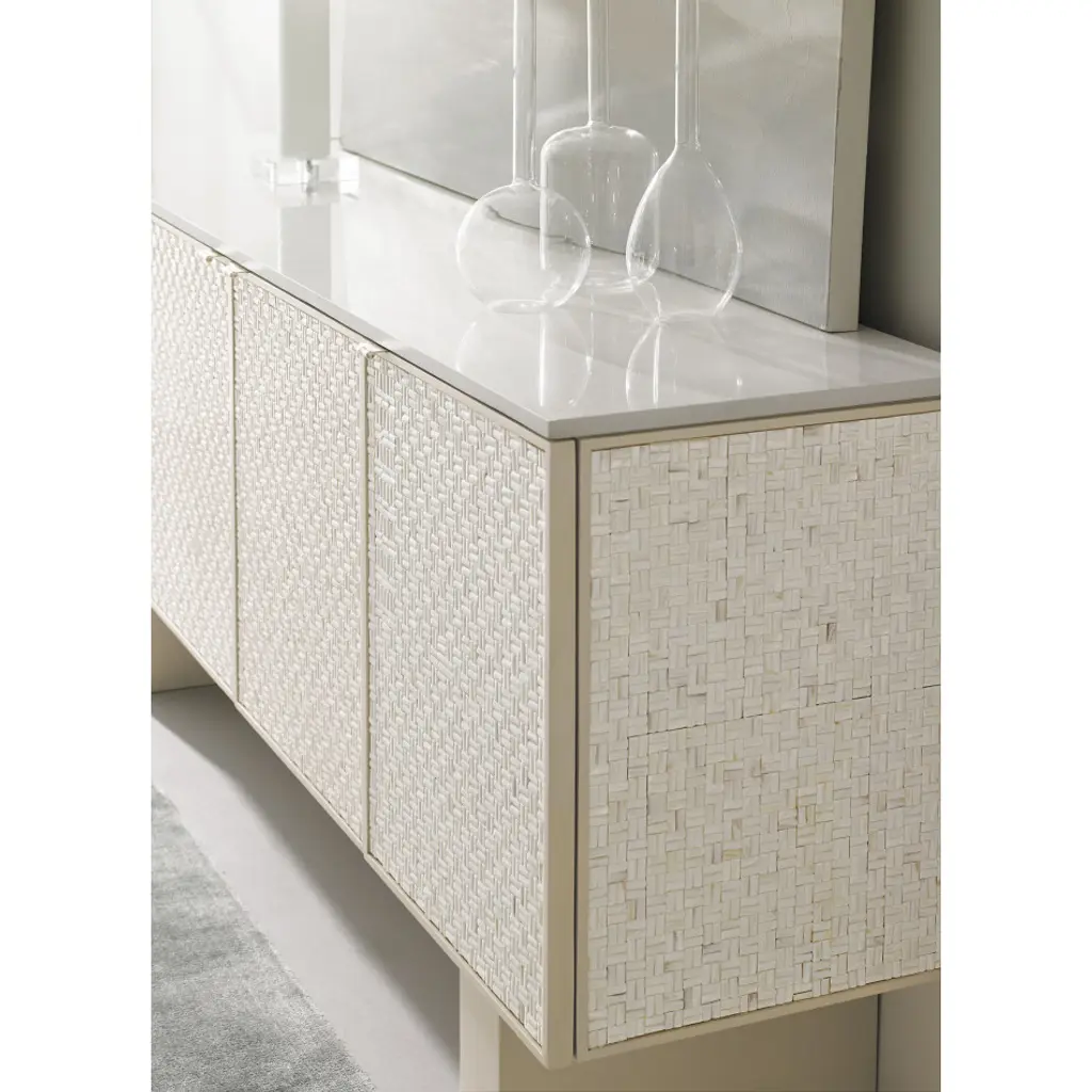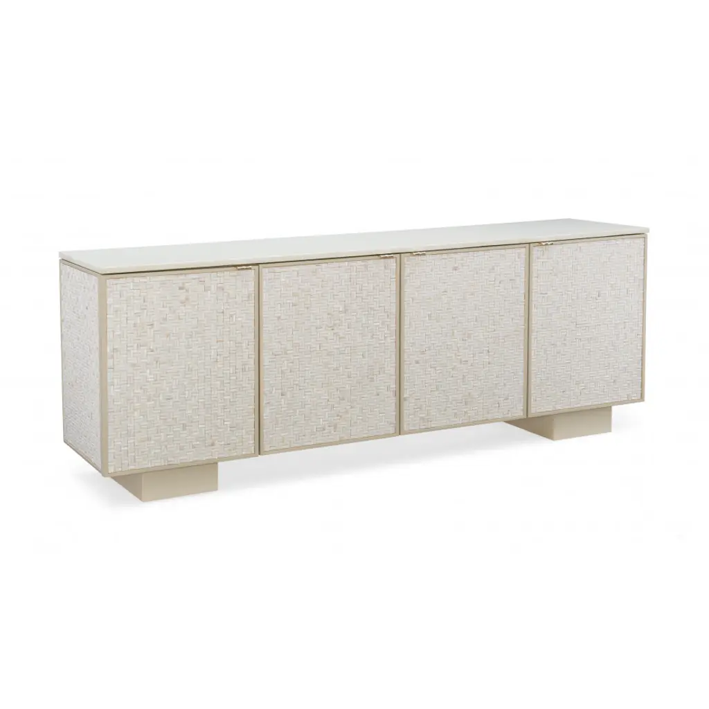 This dramatic sideboard is wrapped in three-dimensional rectangles of pearlescent shell, presented in a basketweave pattern, resulting in a cabinet with unprecedented luster and sheen. Topped with white stone and fitted with Soft Taupe adjustable footings, this piece stands up to the height of a credenza or drops down to the height of an entertainment center. Featuring four doors with hidden pulls and loads of storage, Bomb-Shell takes center stage in any room.