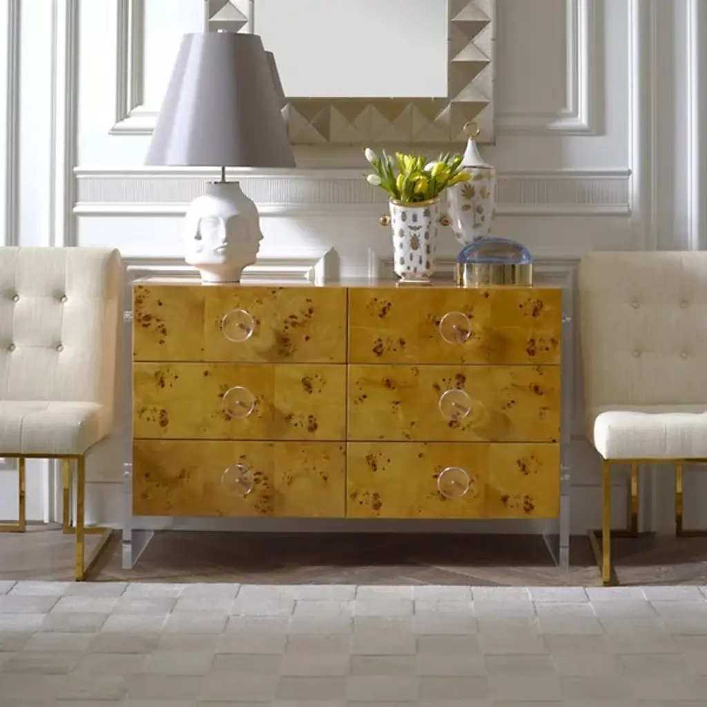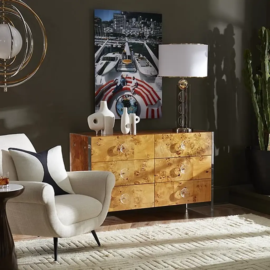 Like the handsome secret agent, there's more than meets the eye. The Bond 6 Drawer Credenza from Jonathan Adler uses exquisite materials to blend into your room and stand out at the same time. From across the room, this piece catches your eye with the golden hue of its wood. The natural grain does the same, presenting a rich texture that gets the eye scanning from left to right. Taking a low-profile, clear acrylic dots each drawer and frames the wood. The spacious drawers close softly for a quiet getaway at any time of day.